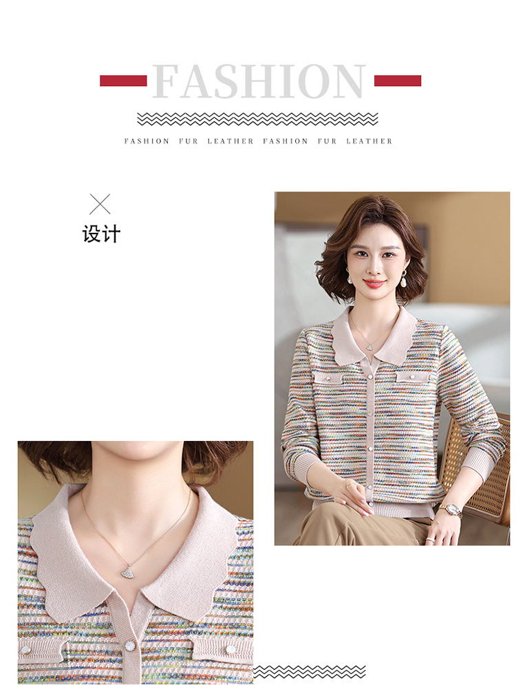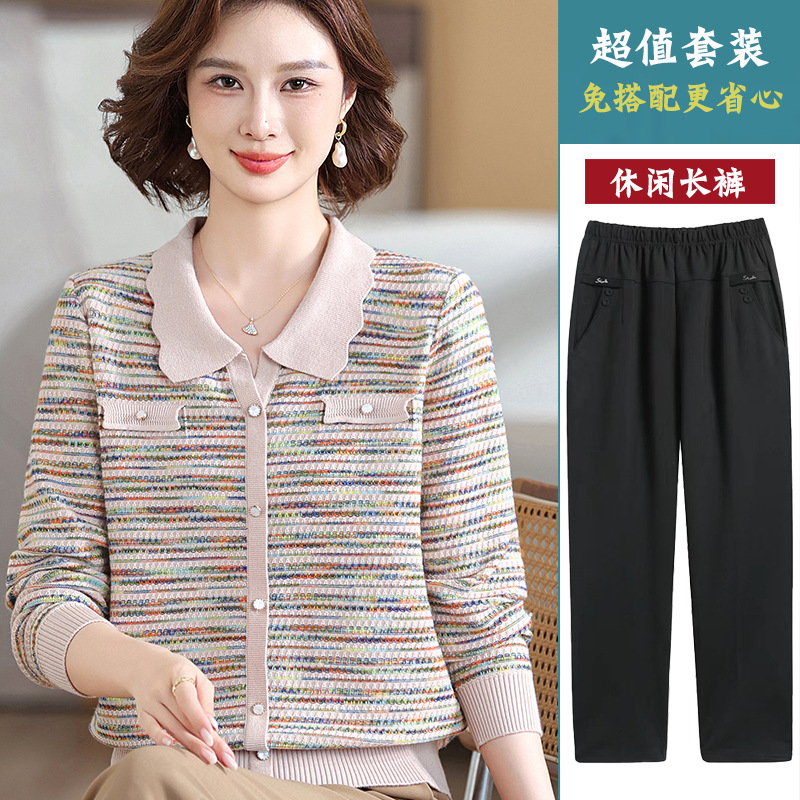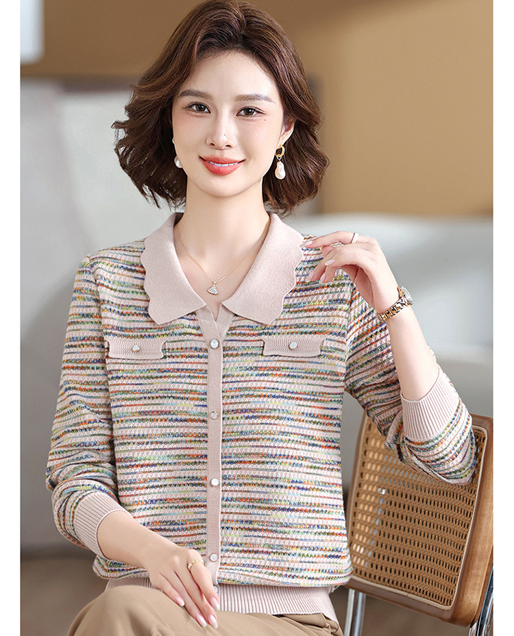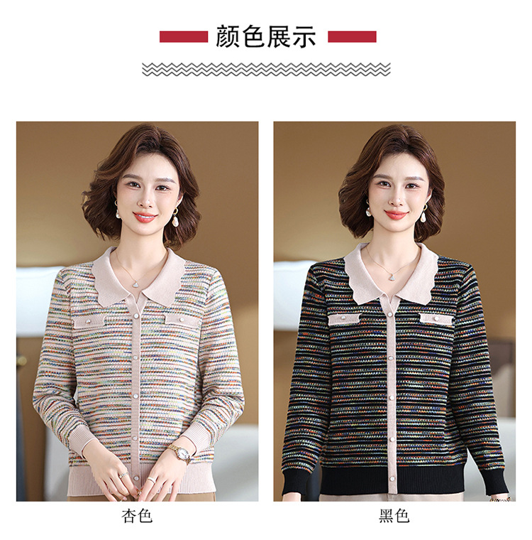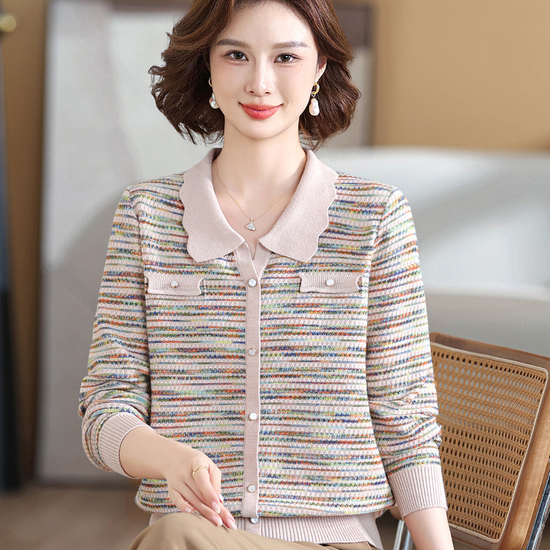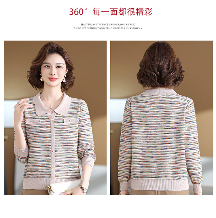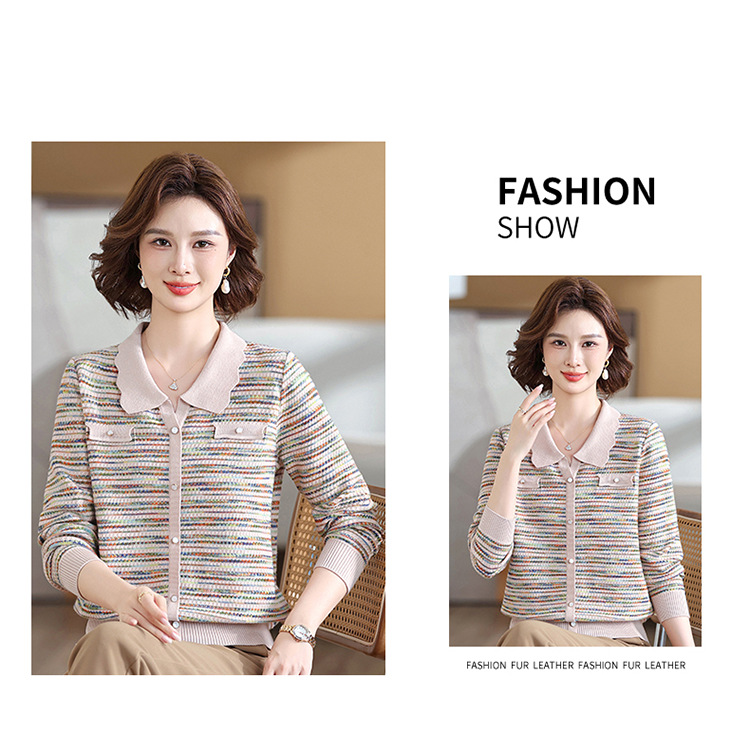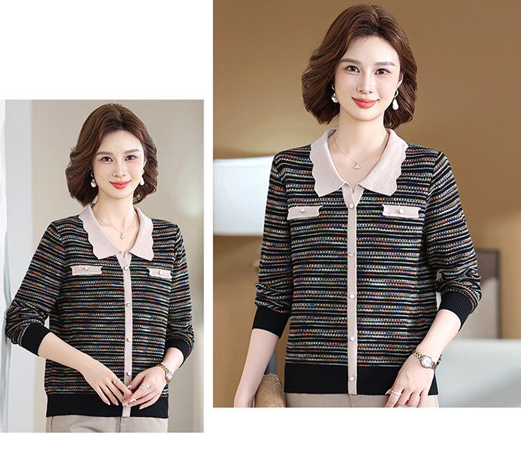 Темперамент мама новый осенний трикотажный отворот в полоску топ среднего возраста женская весенняя и осенняя футболка с длинными рукавами свитер