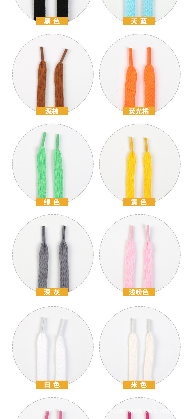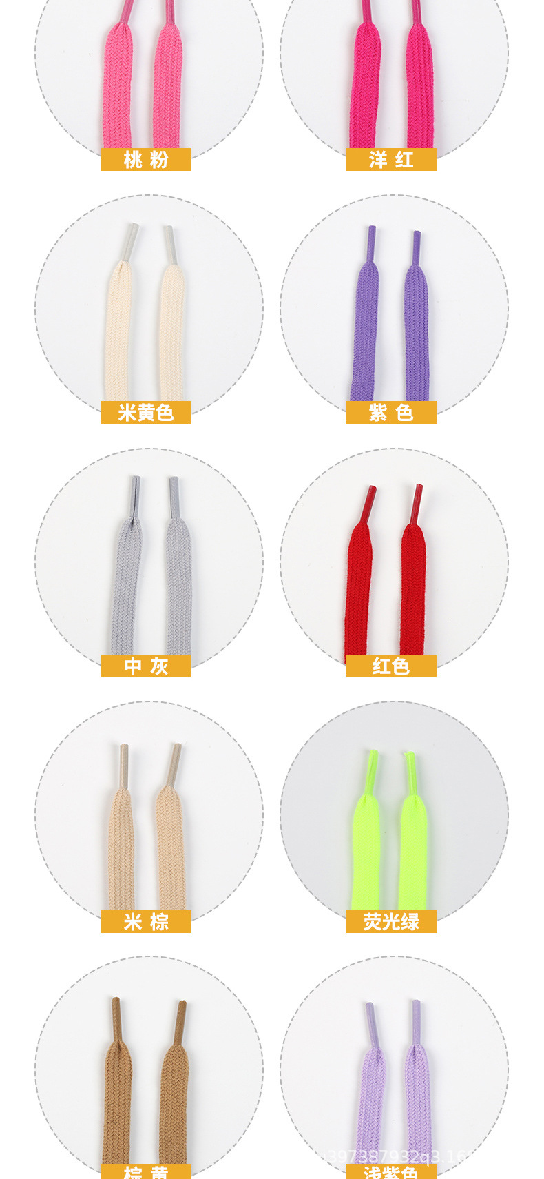 Черный (хлопковые шнурки); Белый (хлопковые шнурки); Бежевый (хлопковые шнурки); Фиолетовый (хлопковые шнурки); Серый (хлопковые шнурки); Золотисто-желтый (хлопковые шнурки); Красный (хлопковые шнурки); Темно-синий (хлопковые шнурки); Розово-розовый (хлопковые шнурки); Светло-розовый (хлопковые шнурки); Голубой (хлопковые шнурки); Светло-фиолетовый (хлопковые шнурки); Темно-коричневый (хлопковые шнурки); Светло-коричневый (хлопковые шнурки); Светло-серый (хлопковые шнурки); Флуоресцентный зеленый (хлопковые шнурки); Флуоресцентный оранжевый (хлопковые шнурки); Мясной порошок (хлопковые шнурки); Флуоресцентный синий (хлопковые шнурки); Темно-розовый (хлопковые шнурки); Темно-серый (хлопковые шнурки); Травяно-зеленый (хлопковые шнурки)
