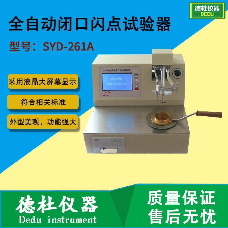 261A型全自动闭口闪点测定仪,用于测定石油产品的闭口闪点值,采用液晶大屏幕显示、中文人机对话界面,对可预置温度、试样标号、大气压强、试验日期等参数,具有提示菜单、提示式输入,方便快捷,开放式、模糊控制集成软件,模块化结构,符合中华人民共和国标准GB/T261-83《石油产品闪点测定法(闭口杯法)》,是理想的进口仪器替代产品,广泛用于铁路、航空、电力、石油行业及科研部门。