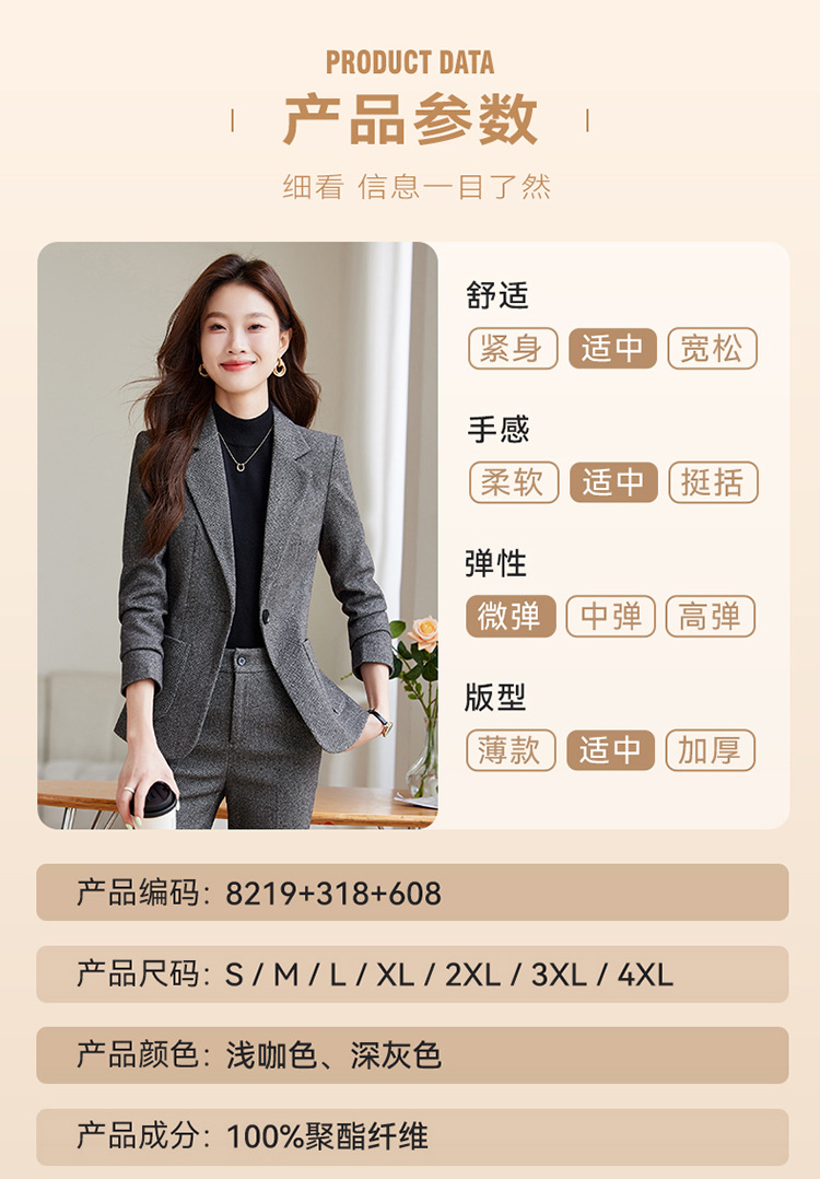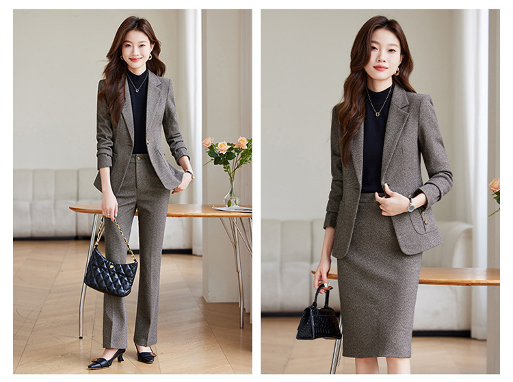 Один темно-серый костюм; Одиночный светло-коричневый костюм; Светло-коричневый костюм + светло-коричневые брюки.; Темно-серый костюм + темно-серые брюки; Светло-коричневый костюм + светло-коричневая юбка; Темно-серый костюм + темно-серая юбка; Цельные темно-серые брюки.; Цельный предмет светло-коричневых брюк.; Одинарная темно-серая юбка; Одинарная светло-коричневая юбка; Цельный темно-серый костюм [добавлен хлопок]; Цельный костюм светло-коричневого цвета [с добавлением хлопка]