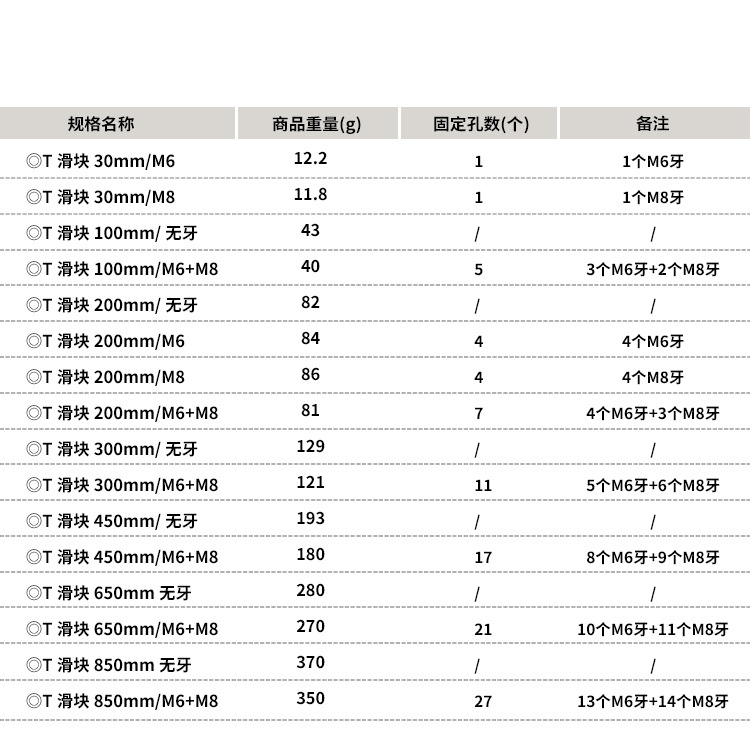 Т-образный слайдер 200мм Зубья М6; Т-образный слайдер 200мм Зубья М8; Ползунок 100T беззубый; Ползунок 100Т + зубы; Ползунок 200T беззубый; Ползунок 200T + зубы; 300 (Т) слайдер без зубов; 300 (Т) слайдер + зубы; 450 (Т) слайдер беззубый; 450 (Т) слайдер + зубья; Маленький слайдер М6; Маленький слайдер М8; 650 (Т) слайдер беззубый; 650 (Т) слайдер + зубы; 850 (Т) слайдер без зубов; 850 (Т) слайдер + зубья