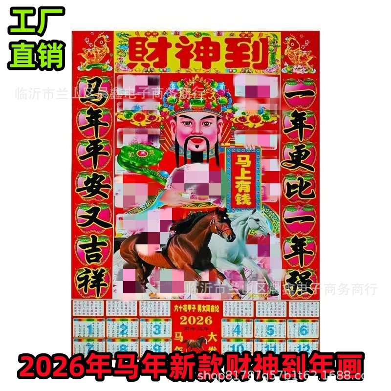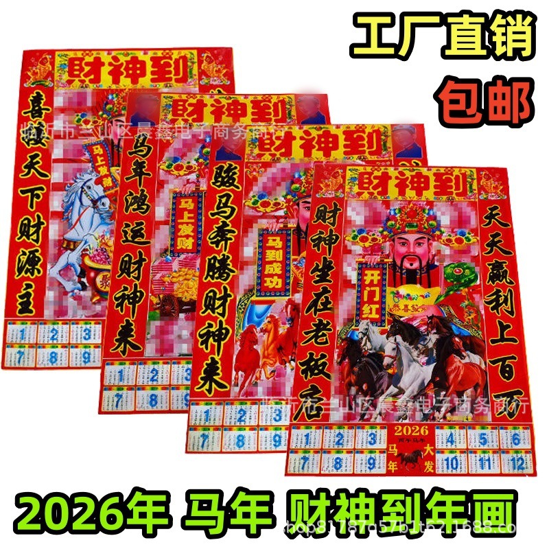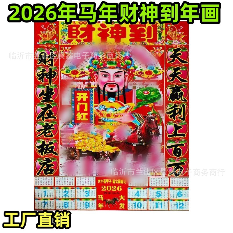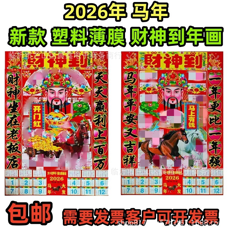 本款宝贝为新年塑料薄膜静电财神年画,本年画是由塑料薄膜印刷而成,一包1000张左右,都是整包批发,不零卖。图案有多种,型号大小也有多种,有不带生肖日历这种是每年都可以卖,有带生肖日历,每年的新款 可供客户选择。大家根据自己的需要选择 有需要说明的可以联系客服。我们主要是批发 欢迎广大客户大量批发订购。 量大联系客服