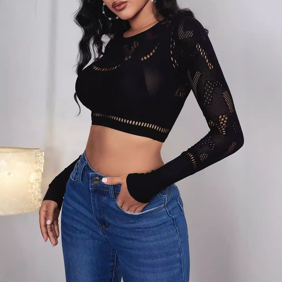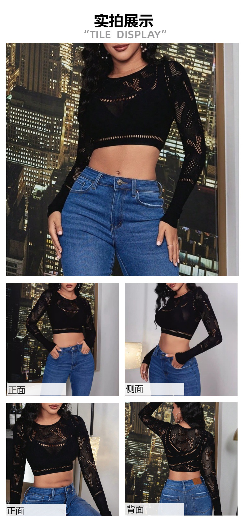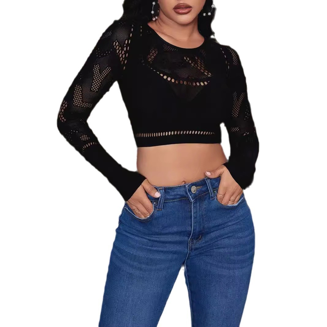 Amazon трансграничная женская одежда новая мода сексуальная тонко облегшая с длинными рукавами сетчатая пряжа черный топ с круглым вырезом