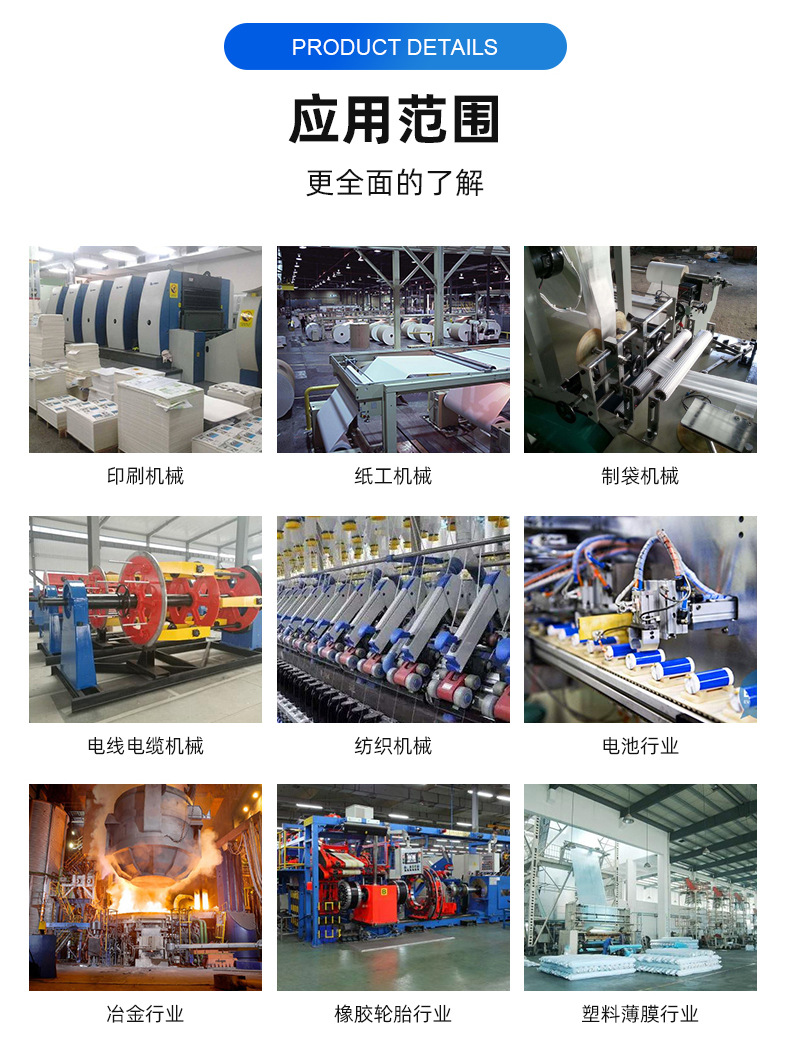 Печатная машина, машина для ламинирования, машина для изготовления пакетов, ленточная машина, нетканая машина, флизелиновый пресс, машина для проверки ткани, машина для нанесения покрытий и другое прокаточное оборудование.
