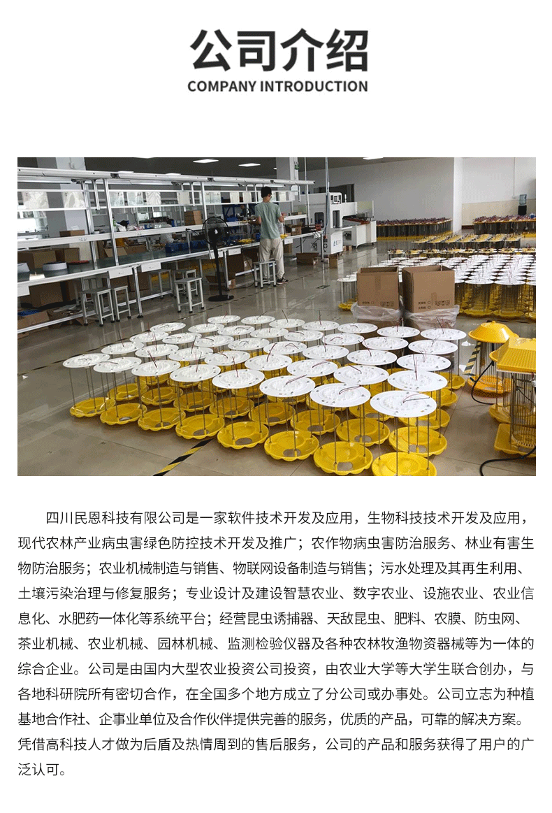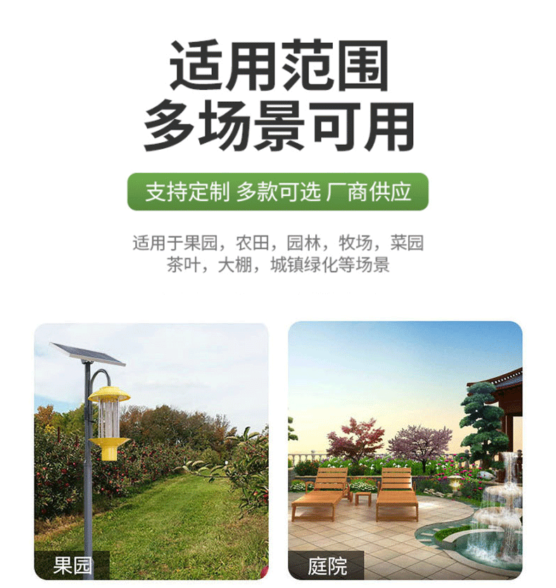 产品被常应用于农业、葡萄园、柑桔园、杨梅园、、苹果园、等各类果园、蔬菜基地、茶园、有机水稻、甘蔗、烟草、花生、棉花、花卉、林场、城镇绿化、公园等各种需要灭虫的场所,是害虫的克星。为广大农作物种植基地生产的农产品以及取得有机认证和发展观光生态农业提供了可靠的科技保障,是一种高科技的物理灭虫设备。