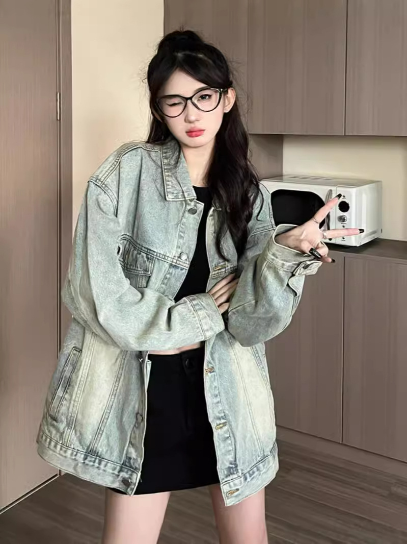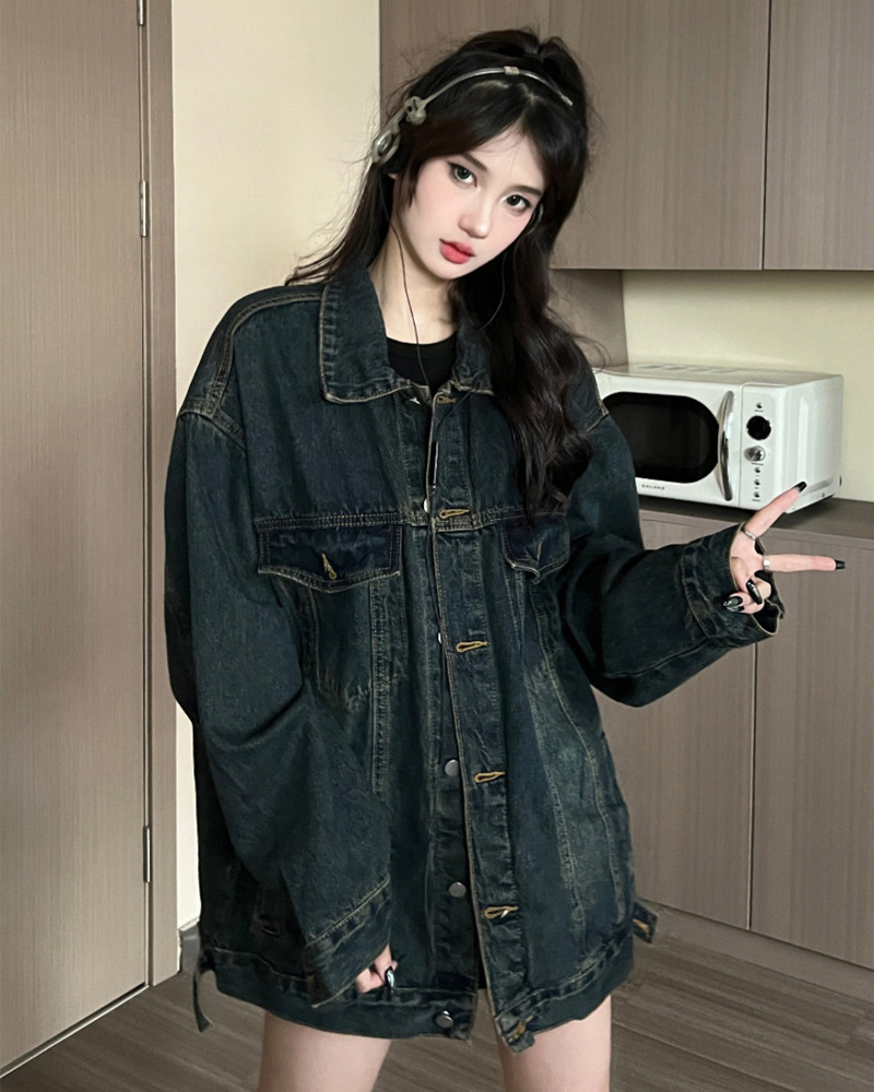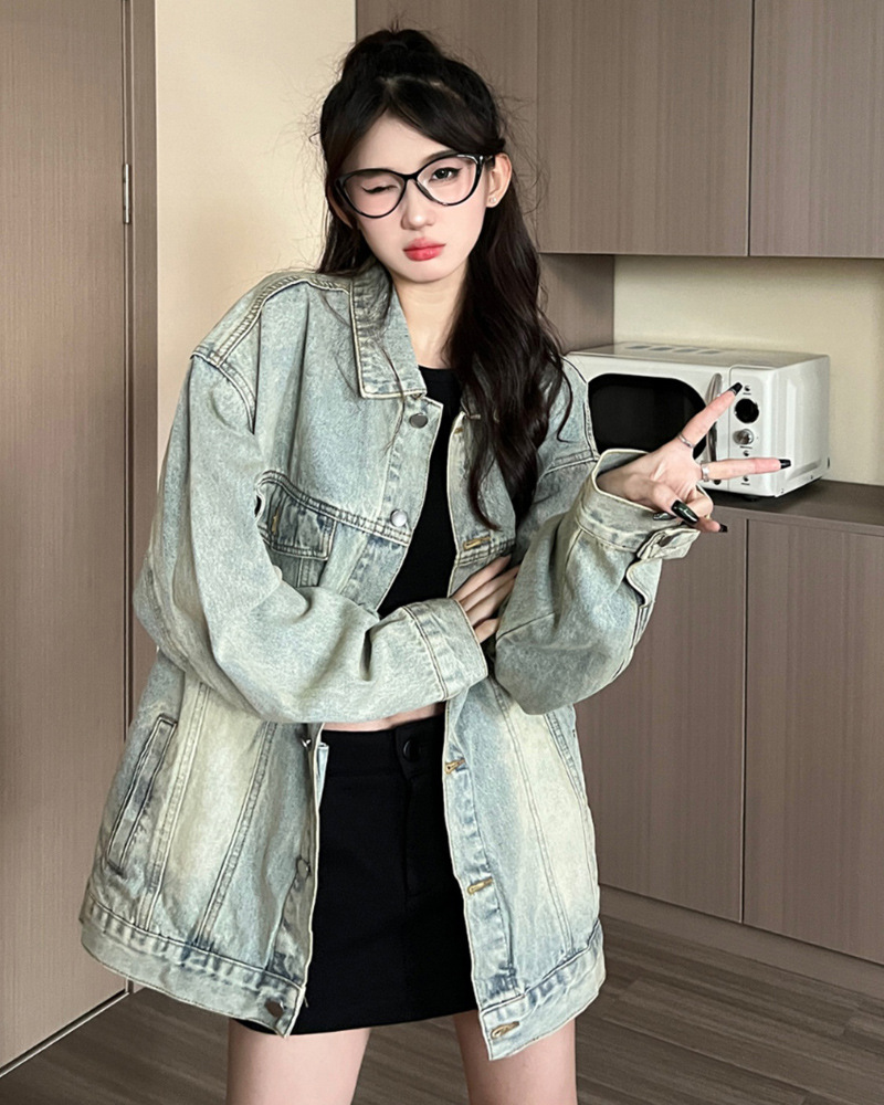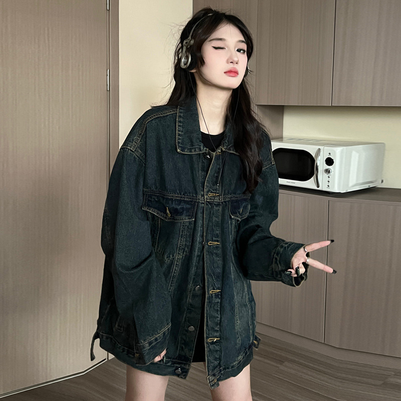 Гонконгская мойка джинсовая куртка женская весна и осень повседневная дикая конструкция ретро-старая свободная куртка с длинными рукавами топ