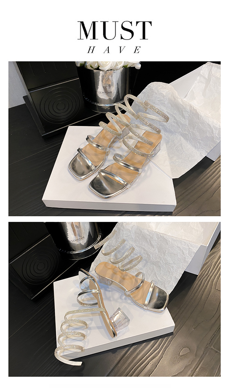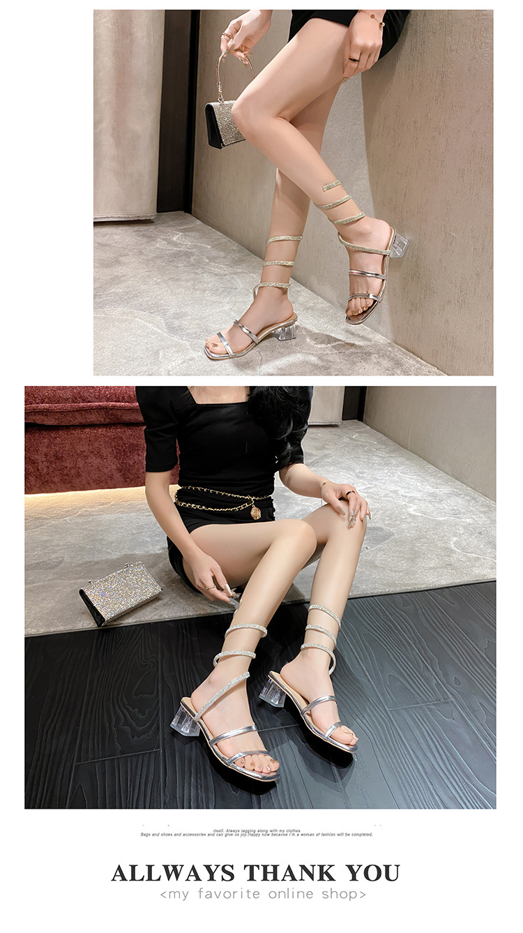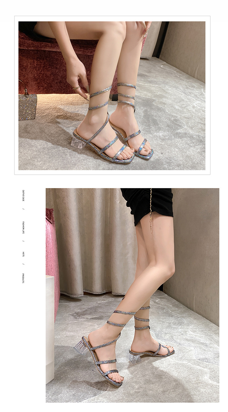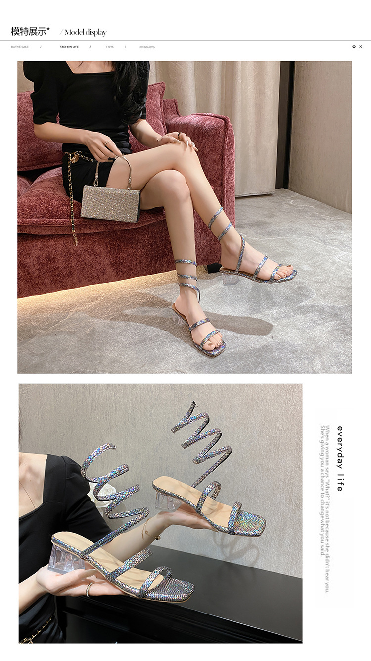 Летние сандалии женский 2024 новый фея ветра дикие корейские модные стразы толстые каблуки змеевидные римские сандалии