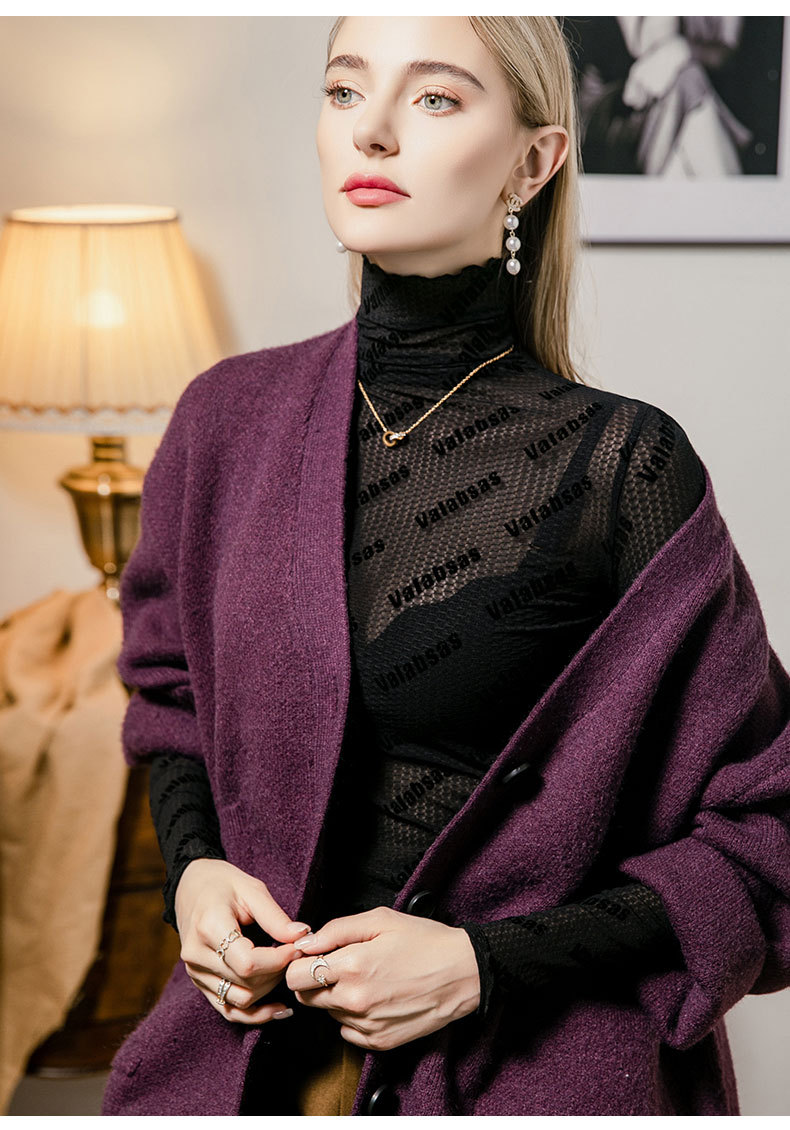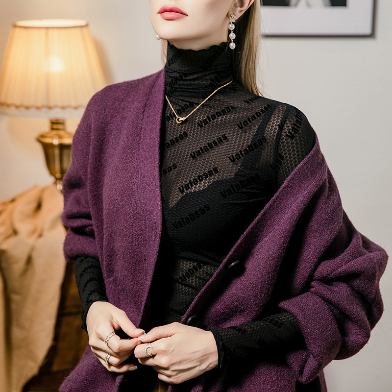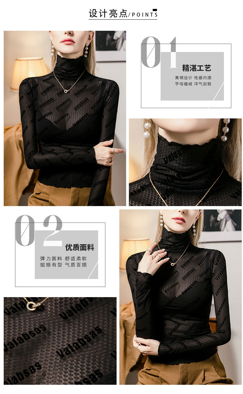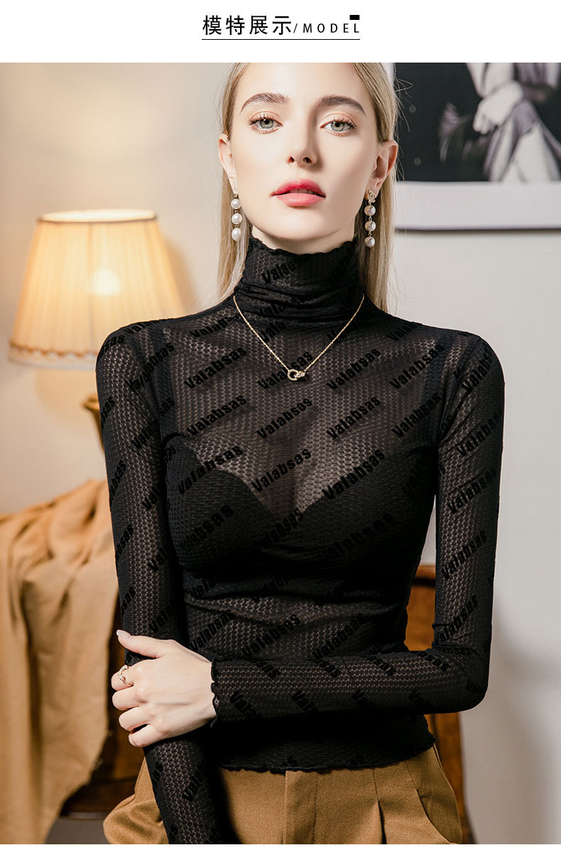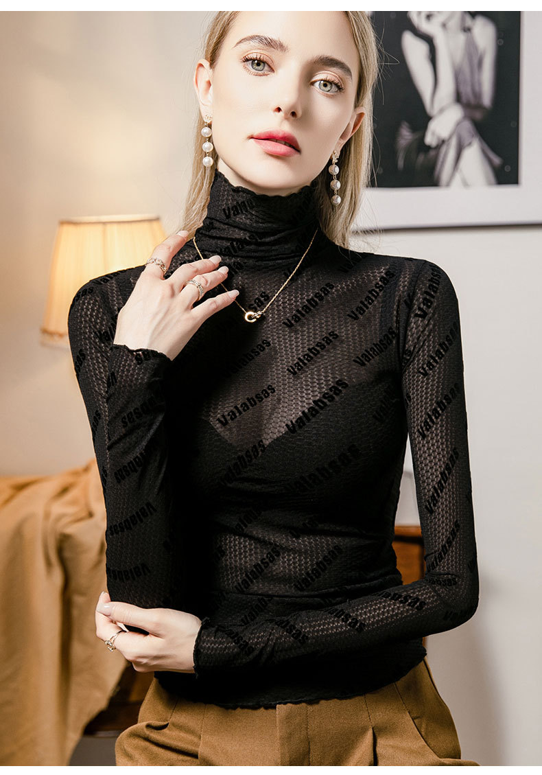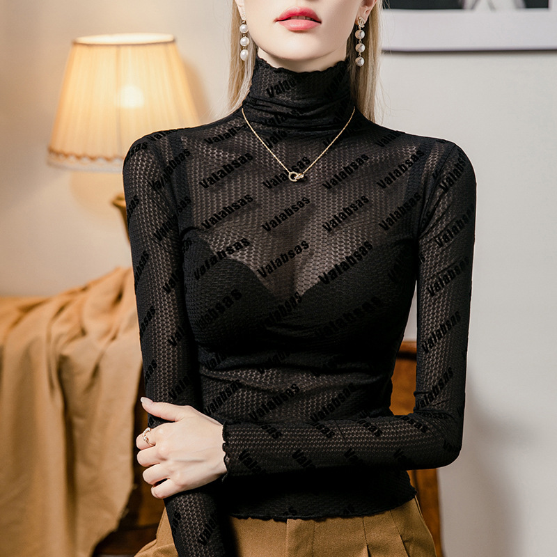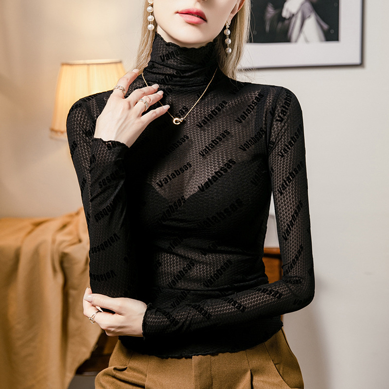 Кружевная нижняя рубашка с высоким воротником женская тонкая буква жаккардовая 2024 новая женская одежда топ черный футболка
