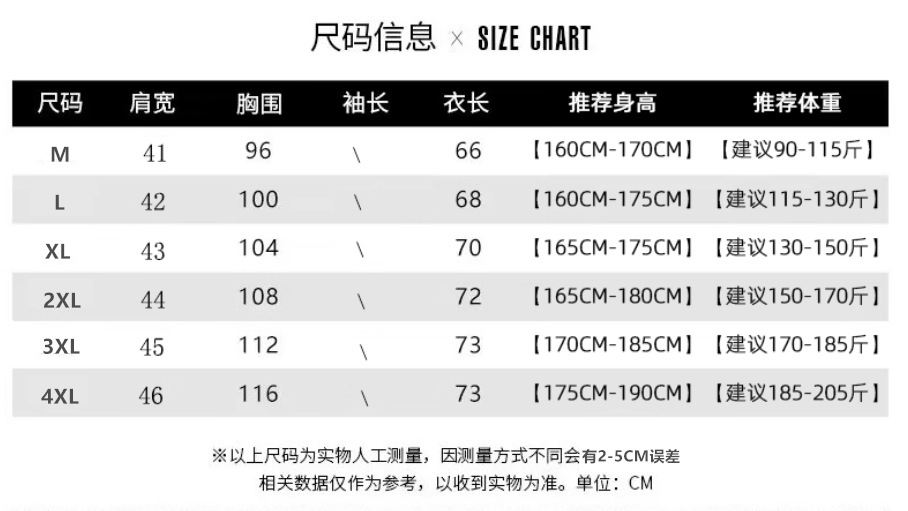М/105 Рекомендация 45-57.5kg; L/110 рекомендуется 57.5-65kg; Рекомендуемый размер XL/115 65-72.5kg; 2XL/120 рекомендуется 72.5-80kg; 3XL/125 рекомендуется 80-87.5kg; 4XL/130 рекомендуется 87.5-95kg