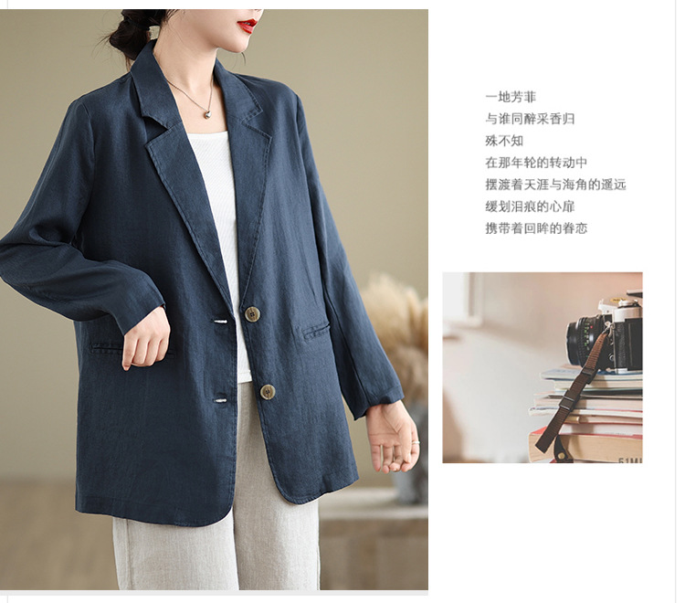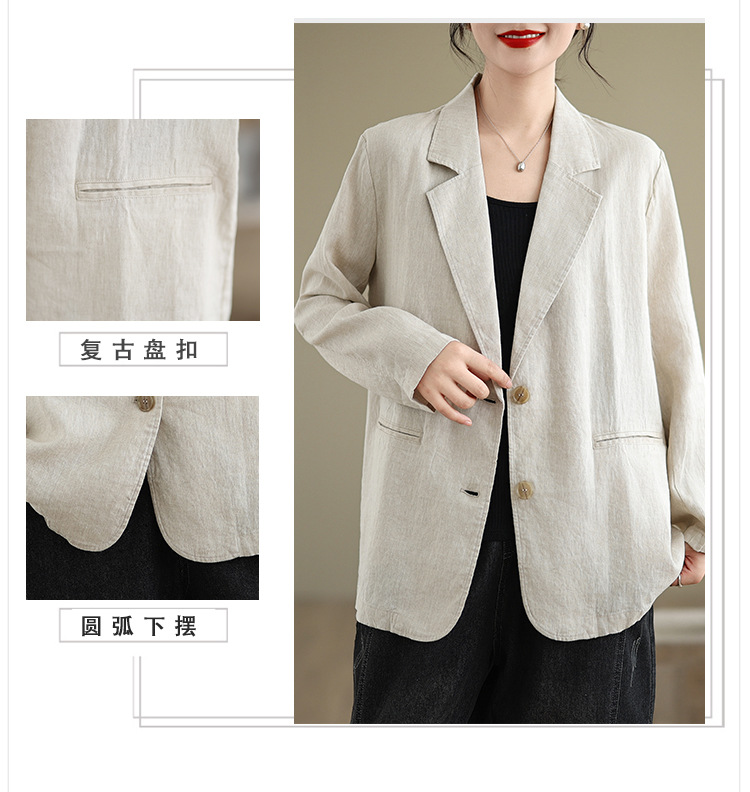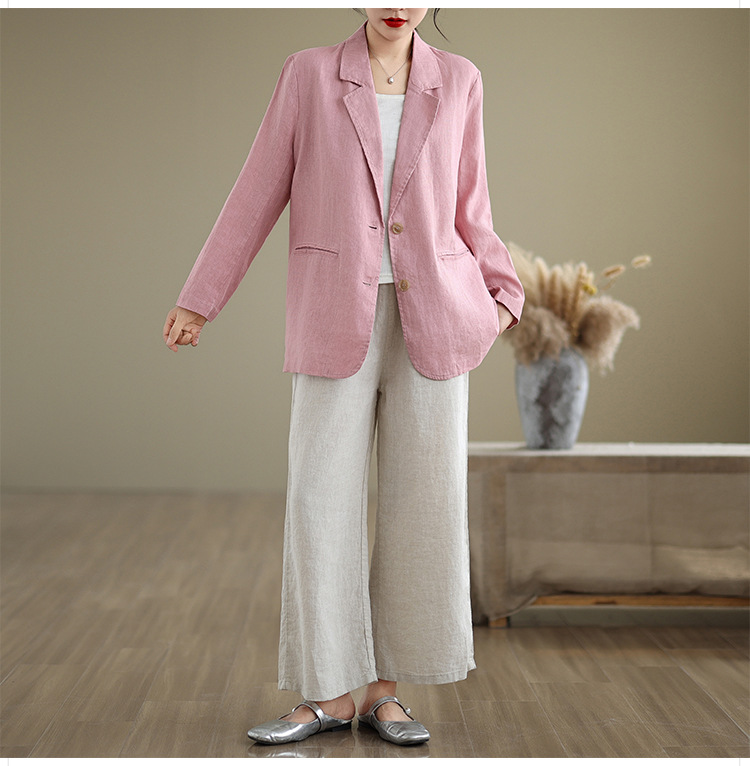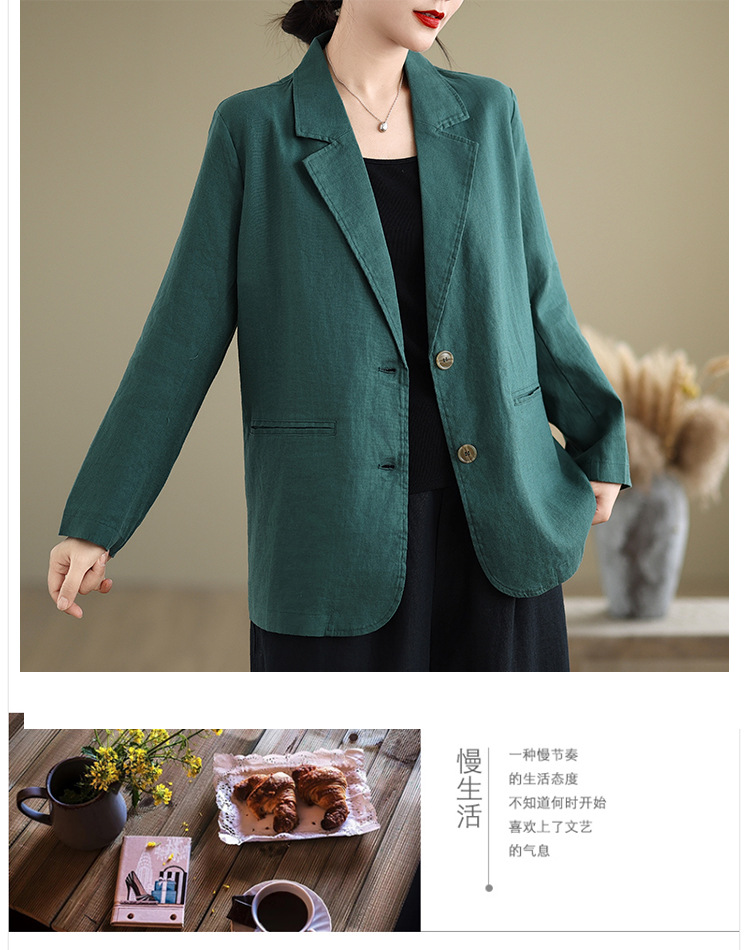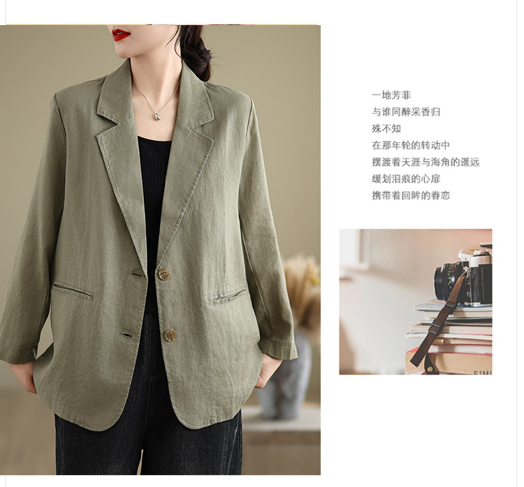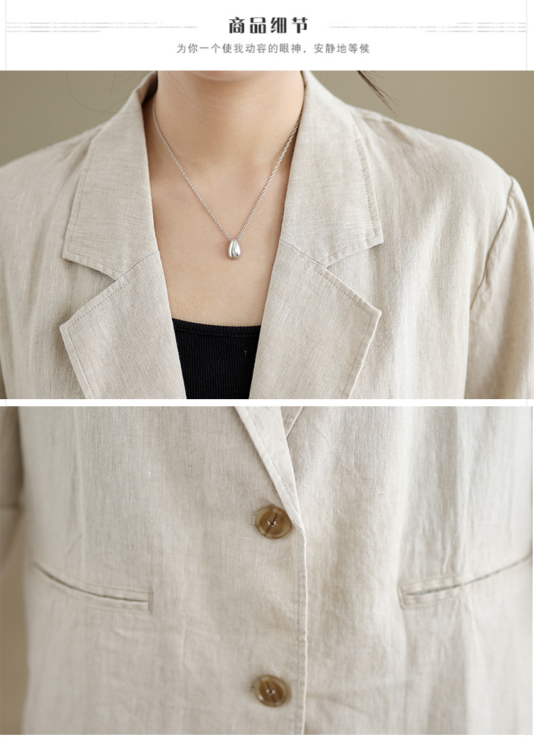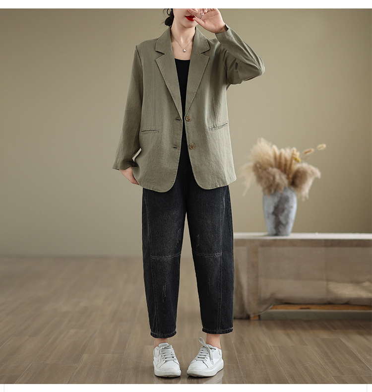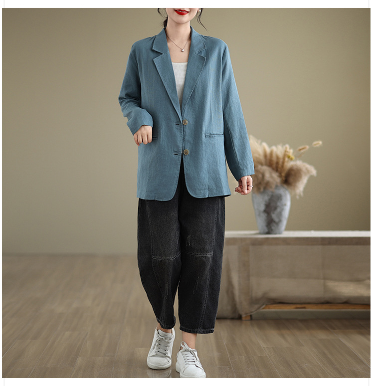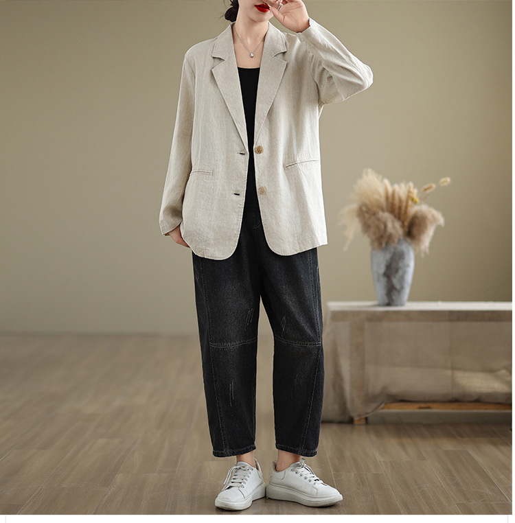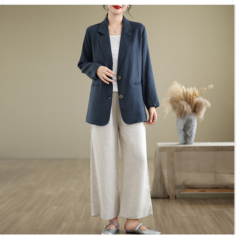 Реальный снимок нового хлопчатобумажного и льняного художественного свободного костюма с длинными рукавами и воротником-стойкой для женщин осень 2025 года.
