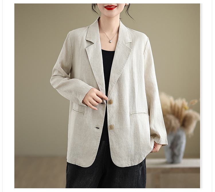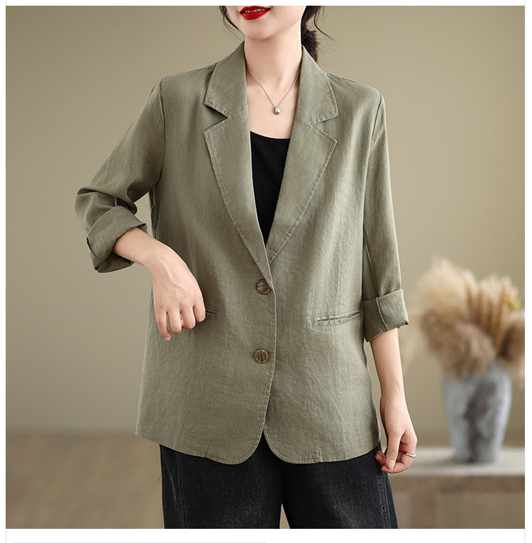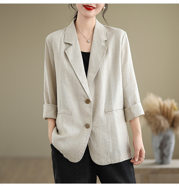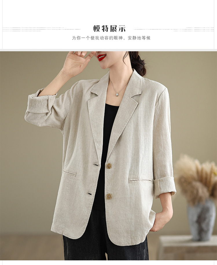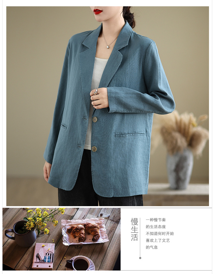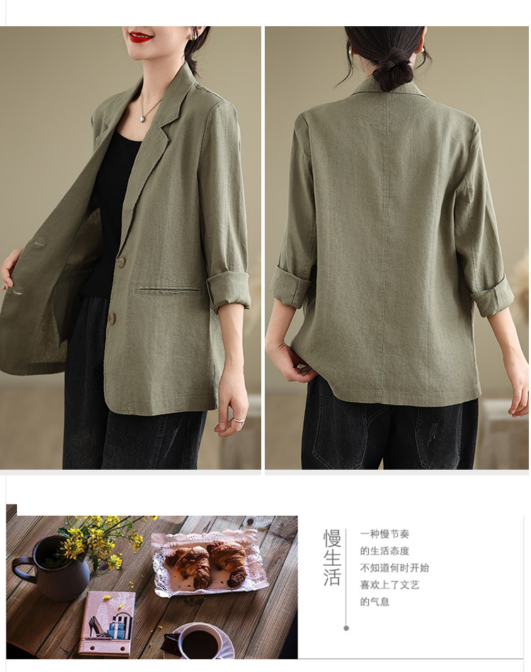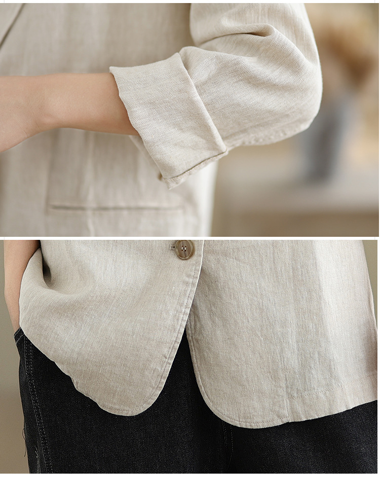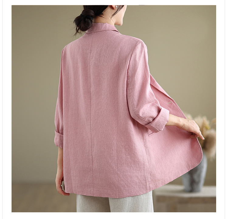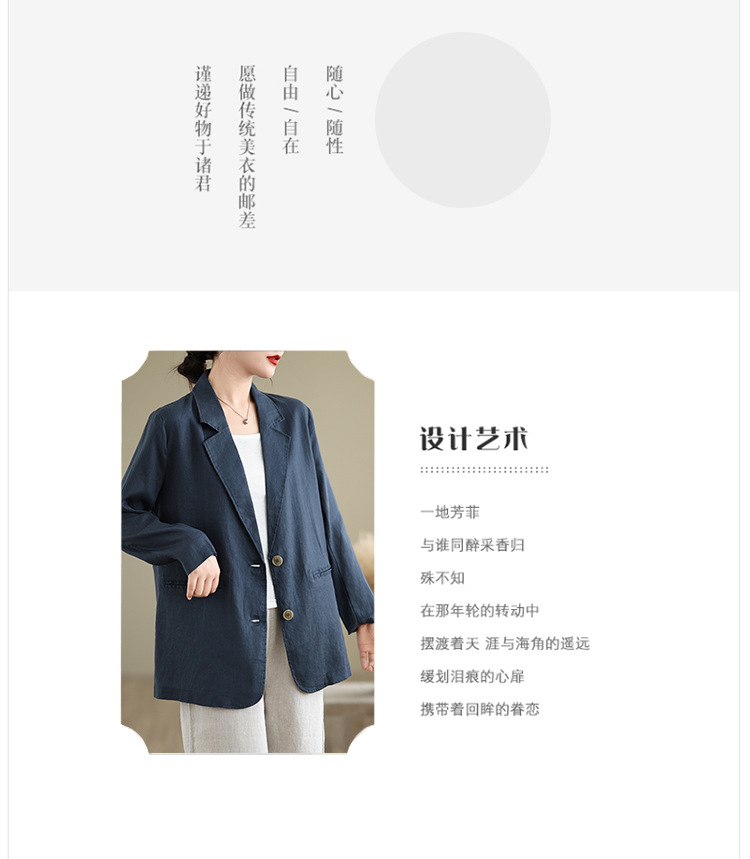 Реальный снимок нового хлопчатобумажного и льняного художественного свободного костюма с длинными рукавами и воротником-стойкой для женщин осень 2025 года.