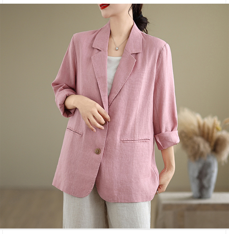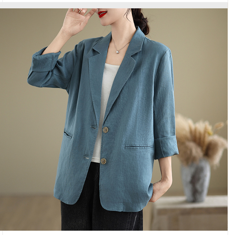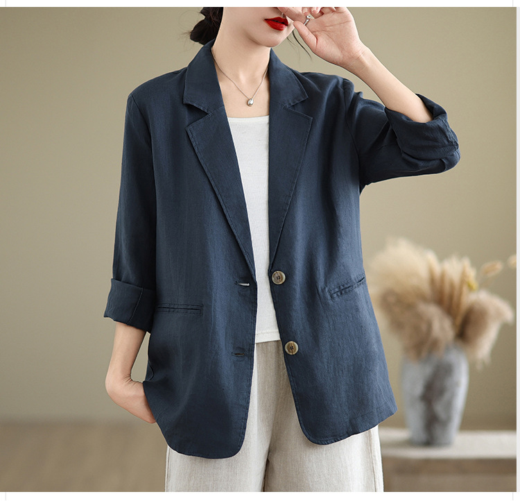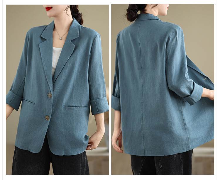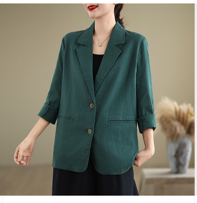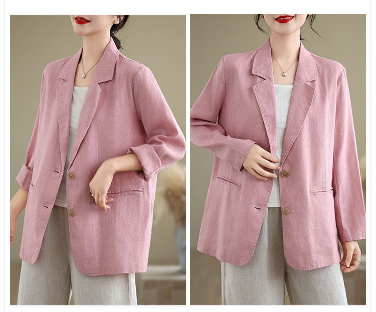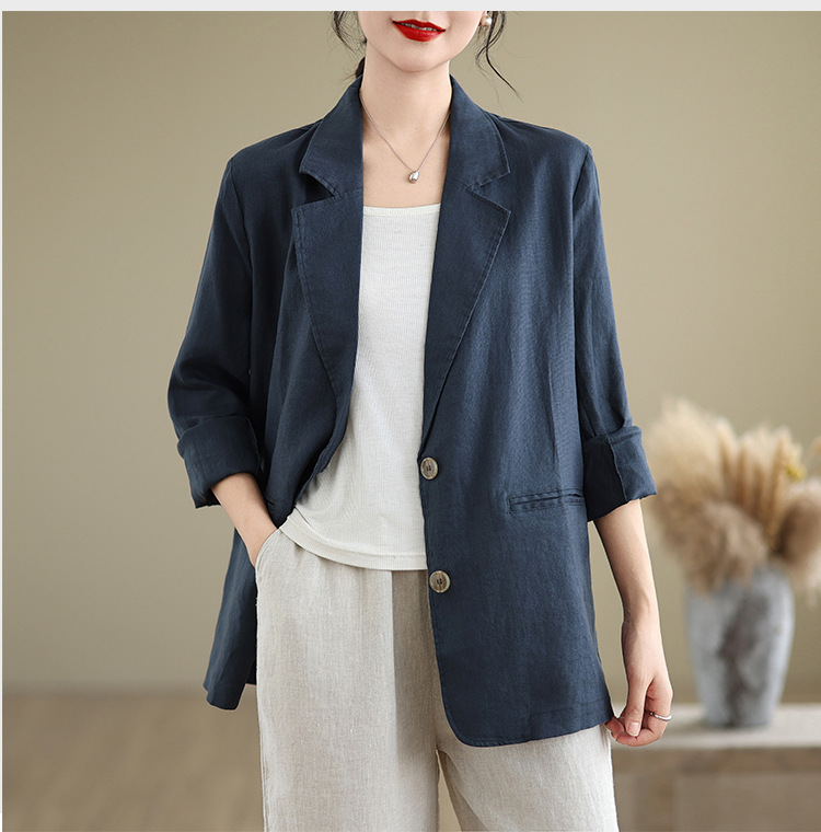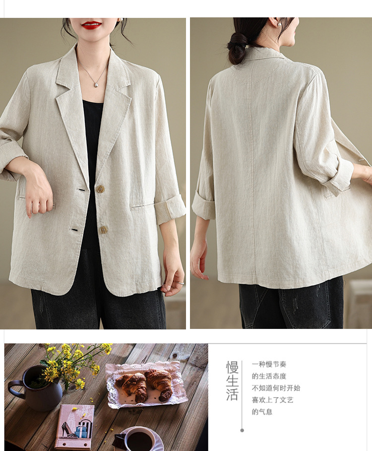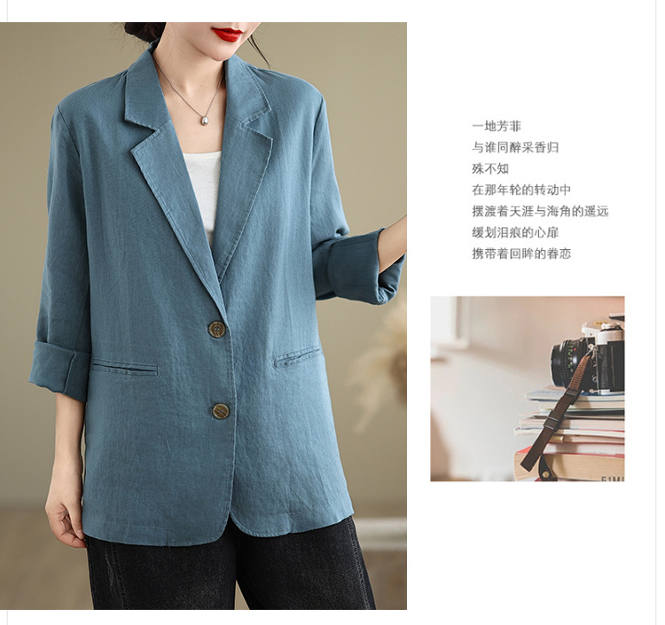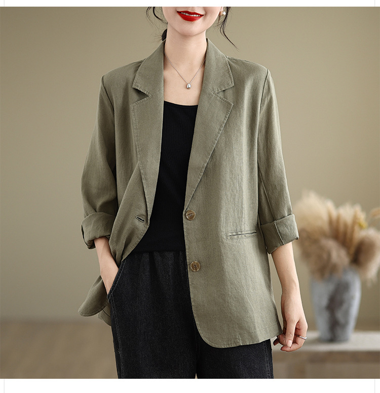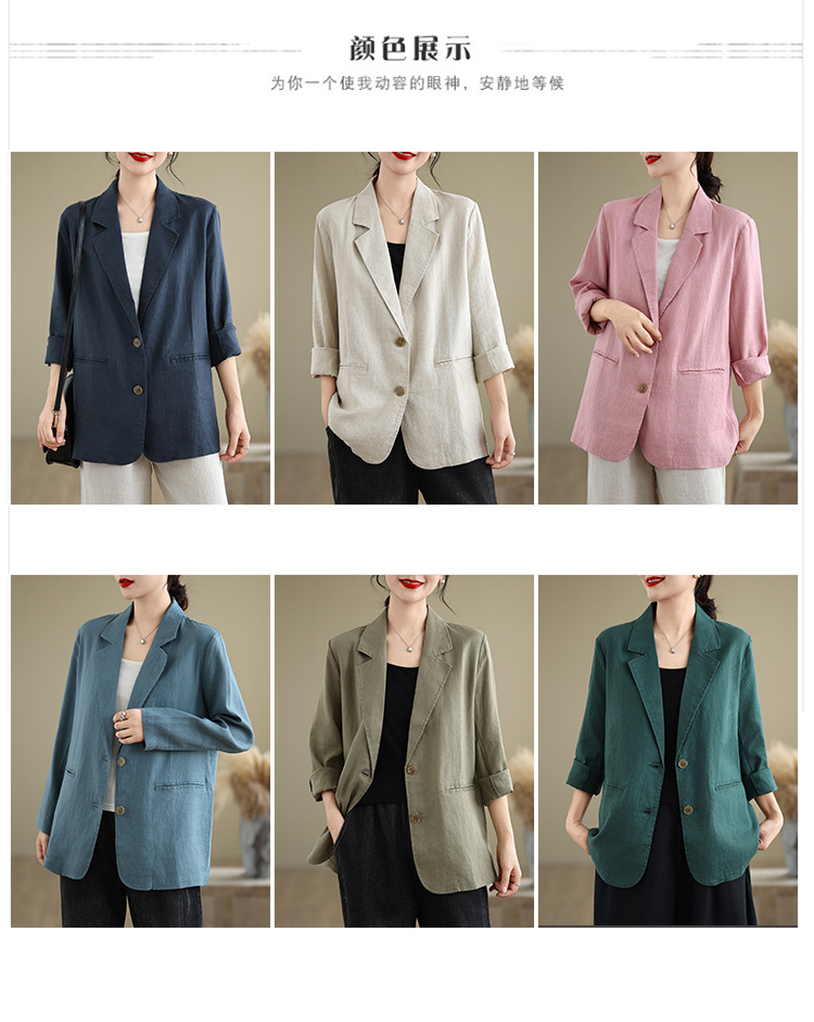 Реальный снимок нового хлопчатобумажного и льняного художественного свободного костюма с длинными рукавами и воротником-стойкой для женщин осень 2025 года.