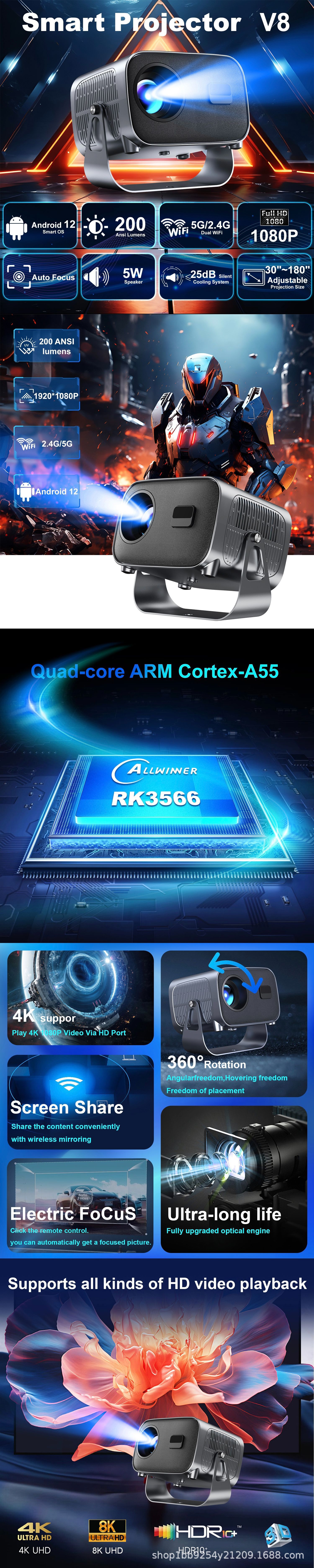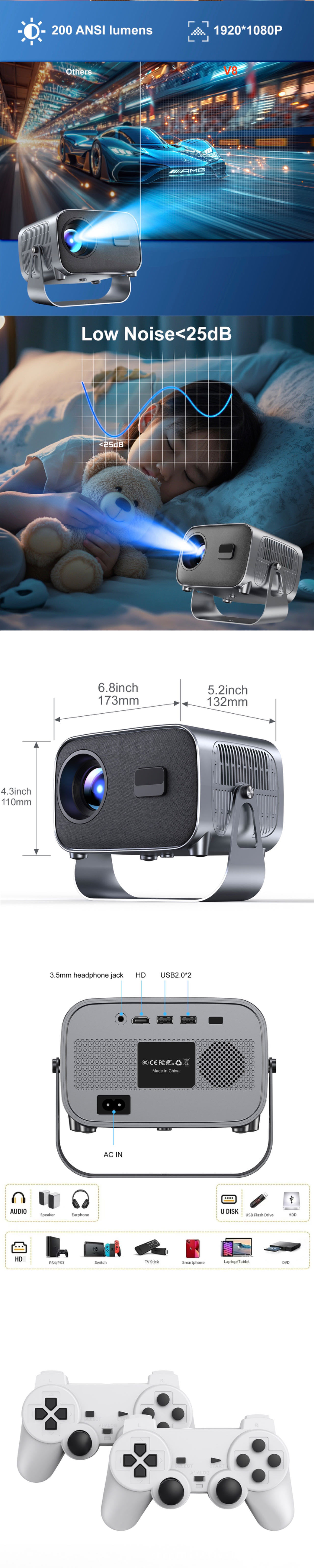 Портативный проектор V8 для дома и офиса, 720P, высокое разрешение, для кемпинга, низкий уровень шума, прямые поставки с завода