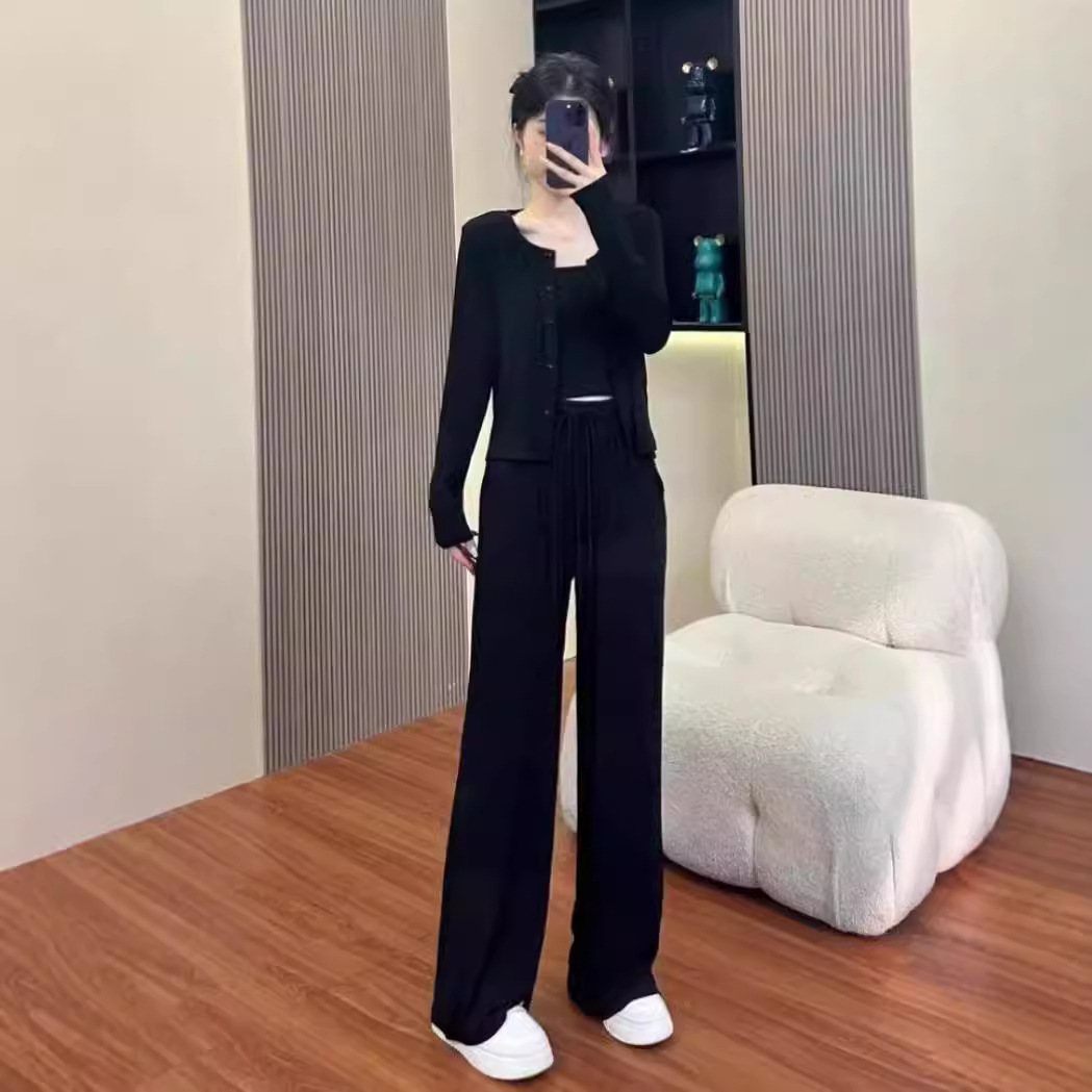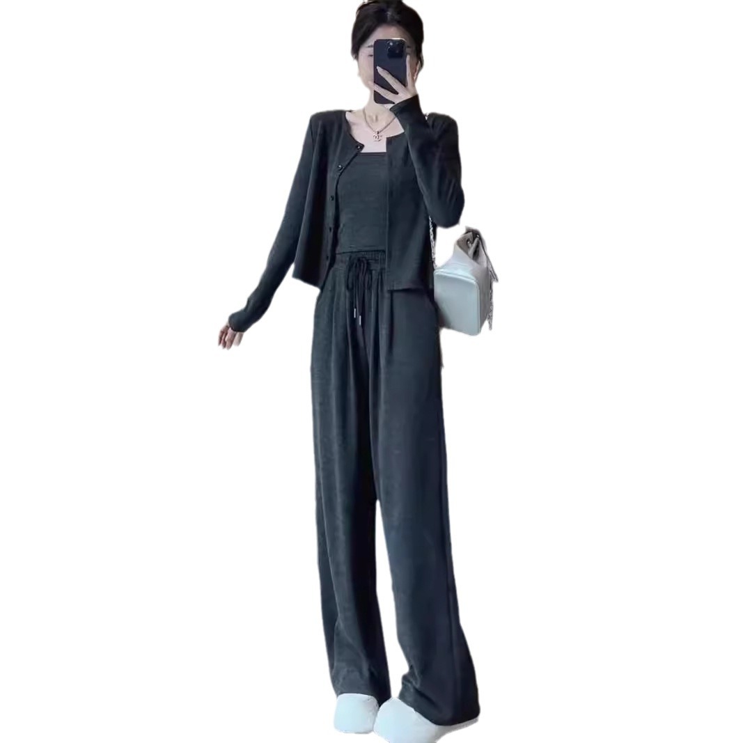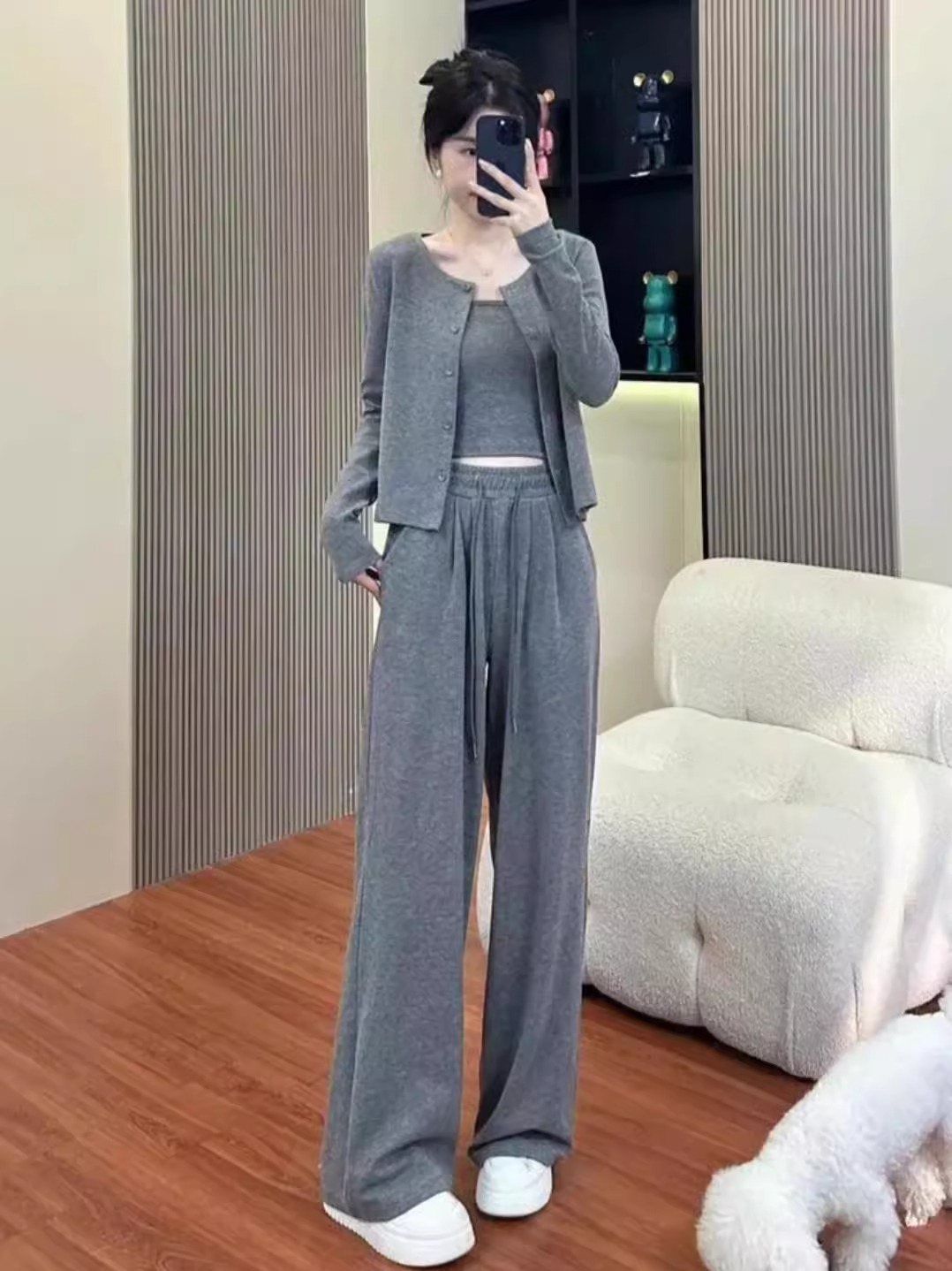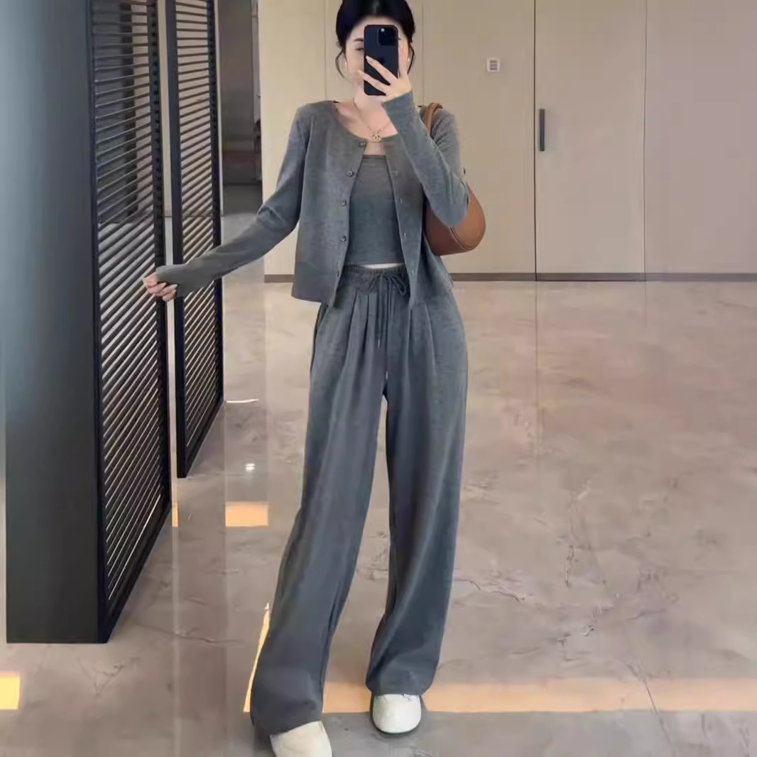 Европейский продукт ленивый ветер спортивный повседневный набор женский осень 2024 новый свободный кардиган подтяжка широкие брюки три комплекта