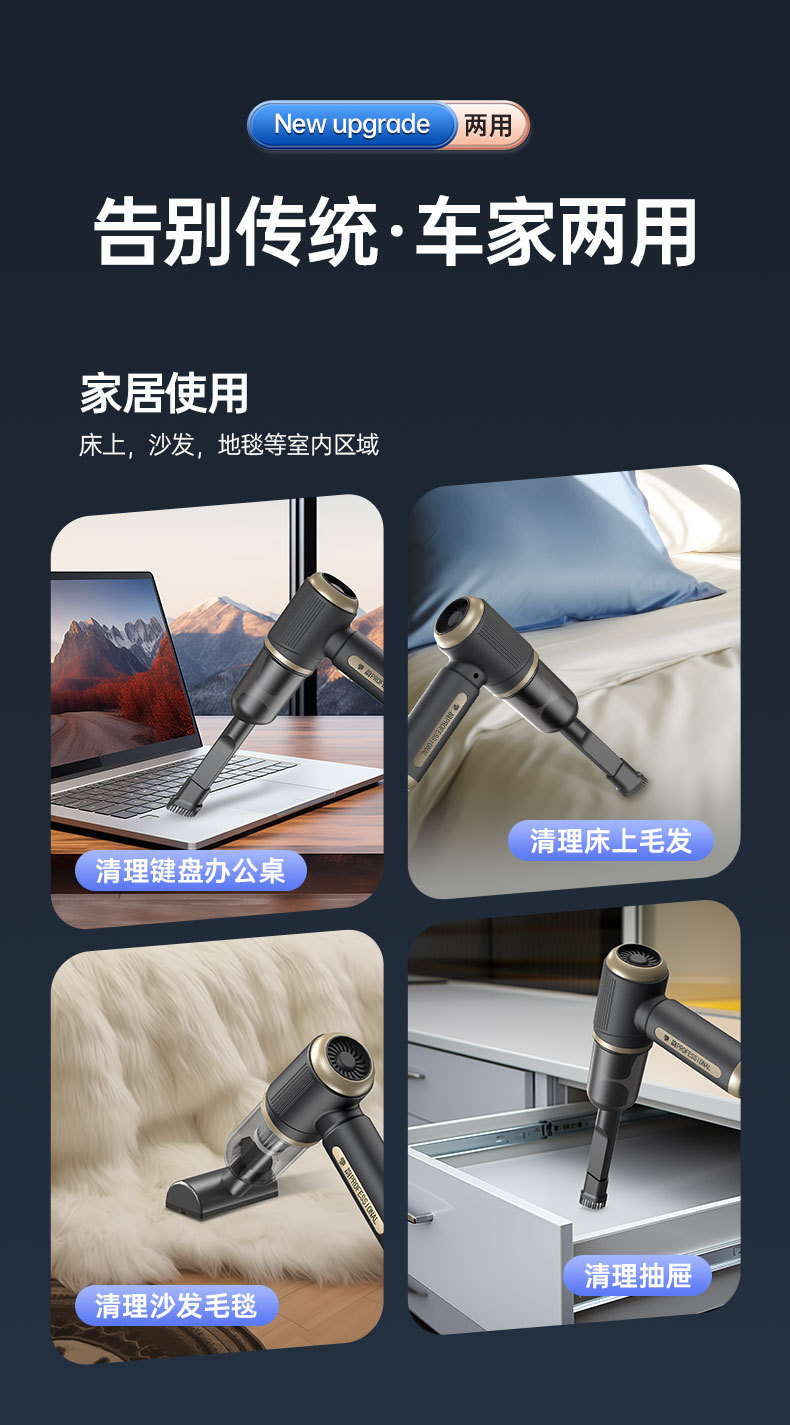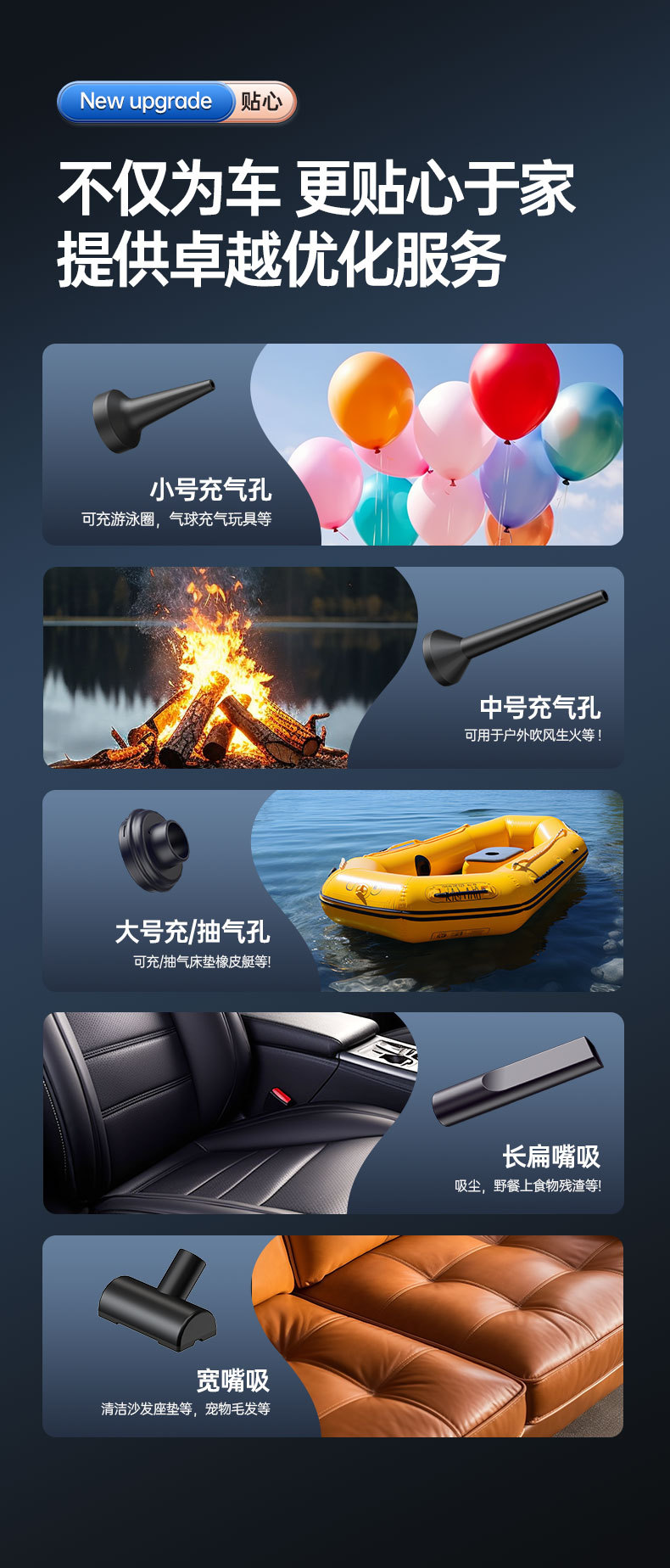 【产品配件】:长扁吸 ,多功能刷头,圆形小刷子,充电线,滤芯,抽气嘴,吹气长嘴, 吹气短嘴 ,沙发床刷
