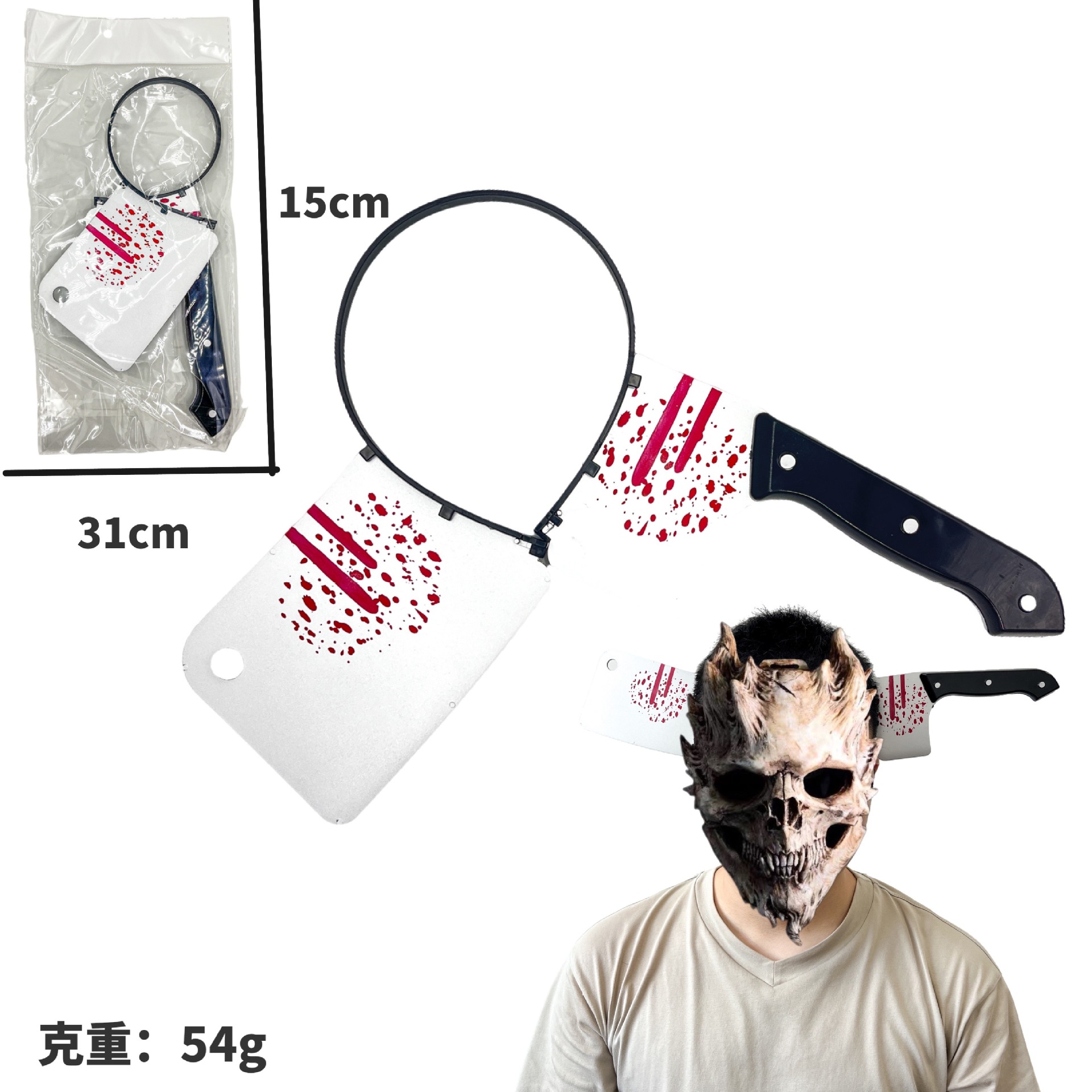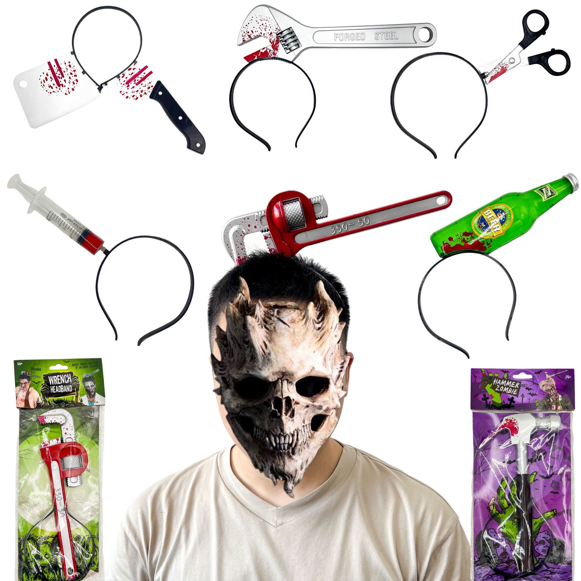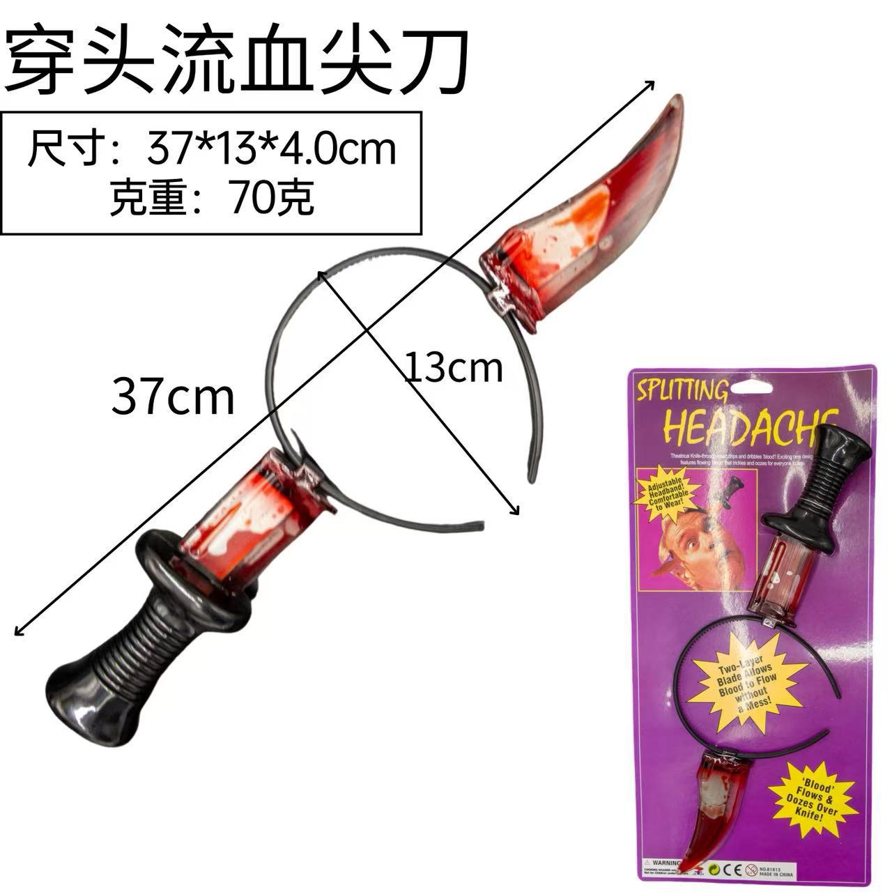 Носить топор; Острый нож; Кухонный нож; Пилы для ношения головы; Молоток с головой; Живой гаечный ключ; Красная труба плоскогубцы; Бутылка для вина; Стрелка с головой; Ножницы на голове; Трубка иглы; кровоточащий нож для пирсинга головы; Головной убор «Глаз дьявола»