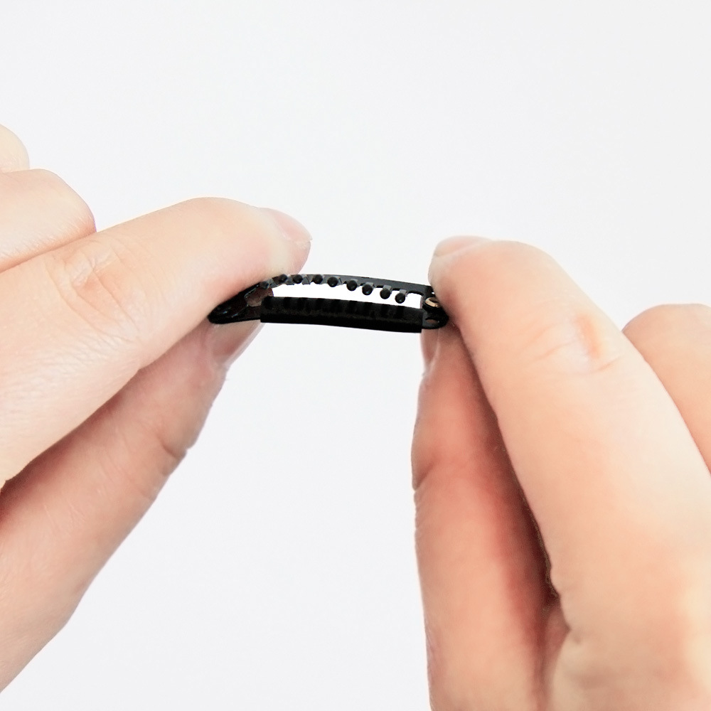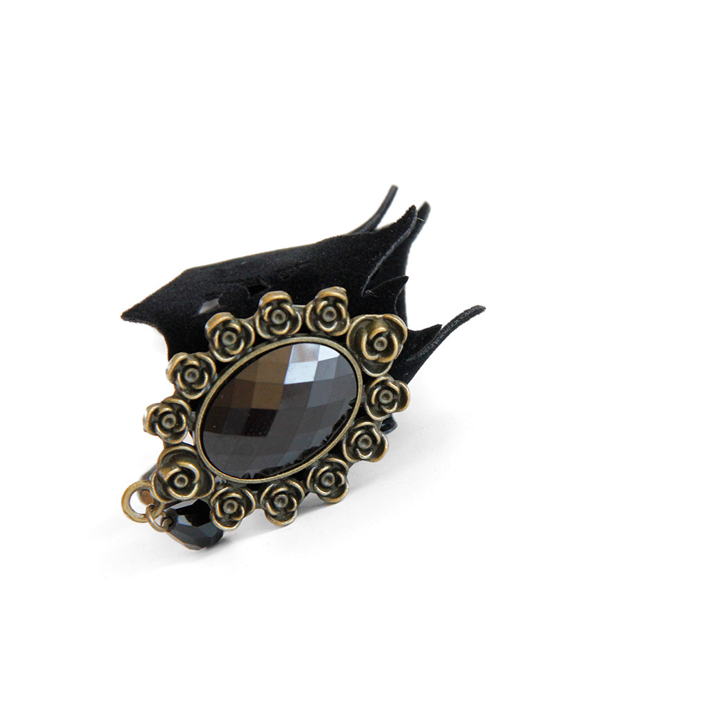 【材料】:黑色双面绒带,合金配件,树脂钻,玻璃水晶珠,铁质发夹。