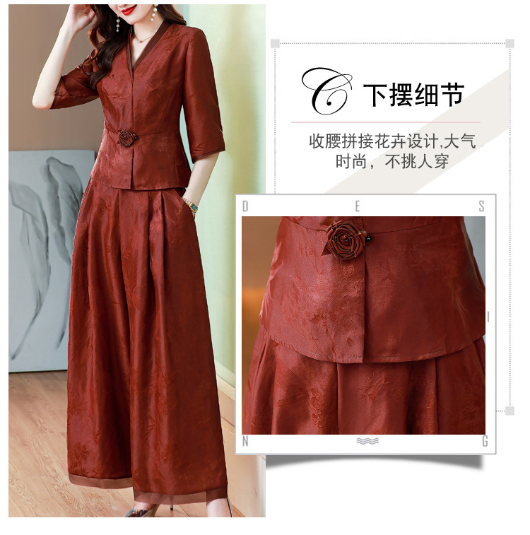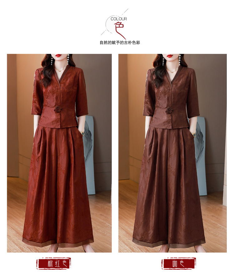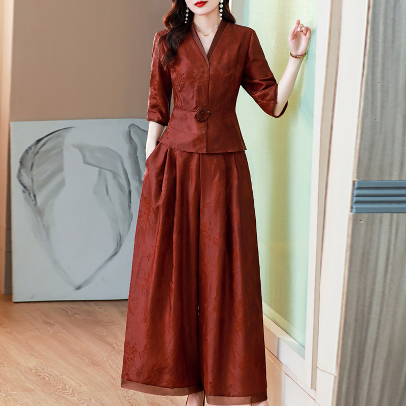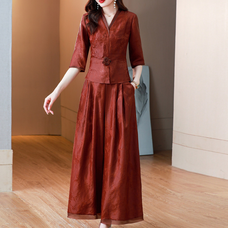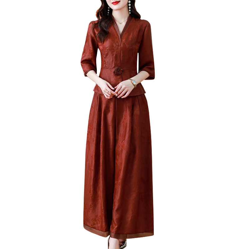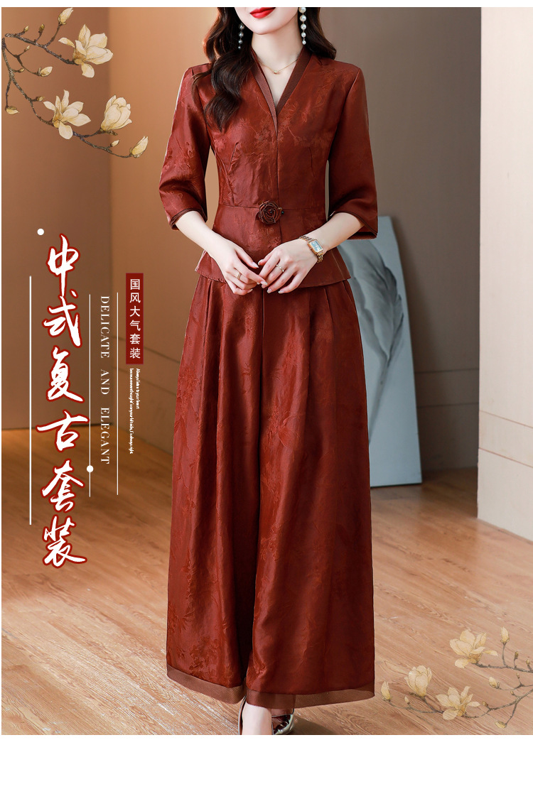 Новый китайский ретро-костюм 2024 осень-зима новая талия сшитый жаккардовый топ широкие брюки мама наряд из двух частей