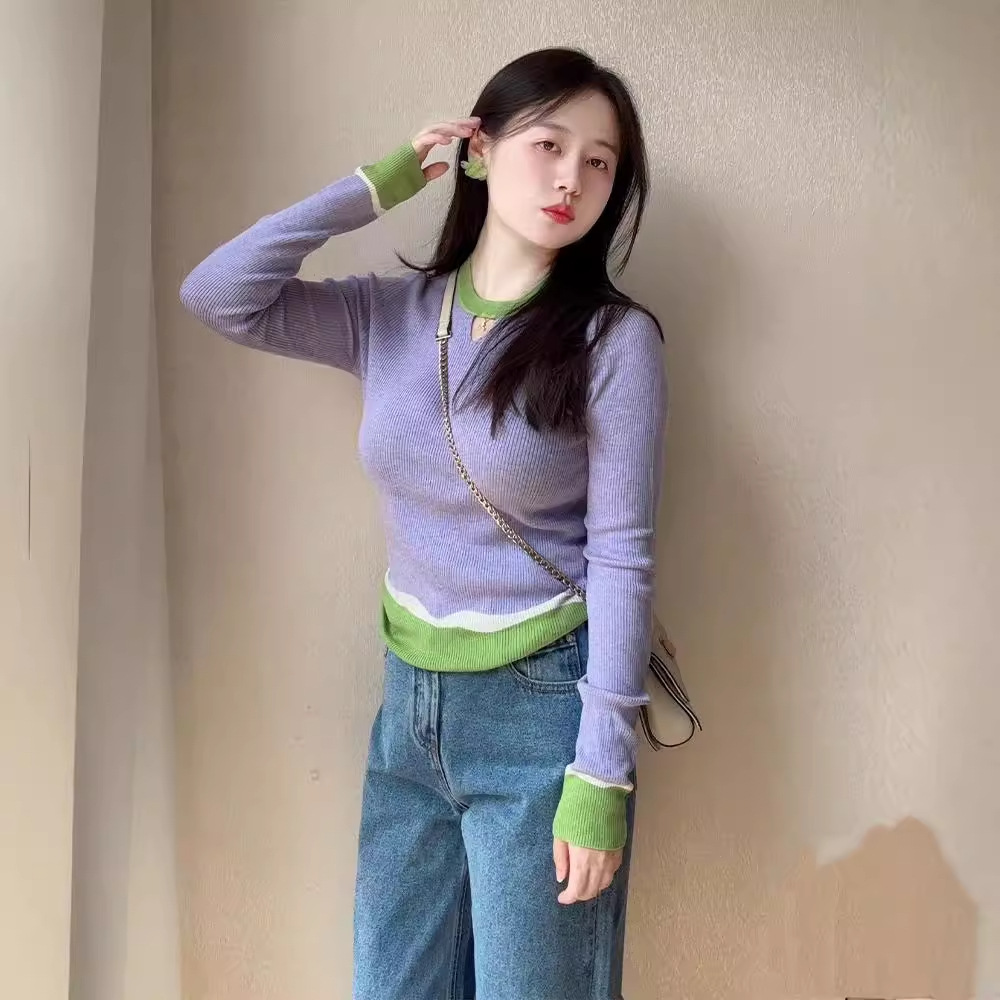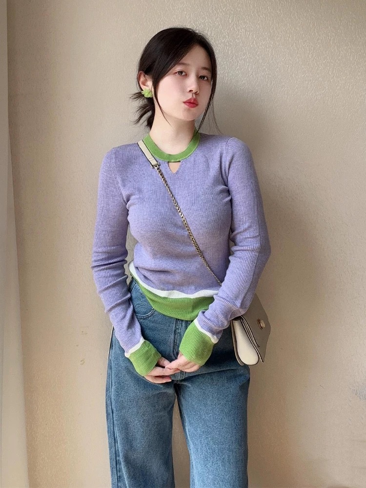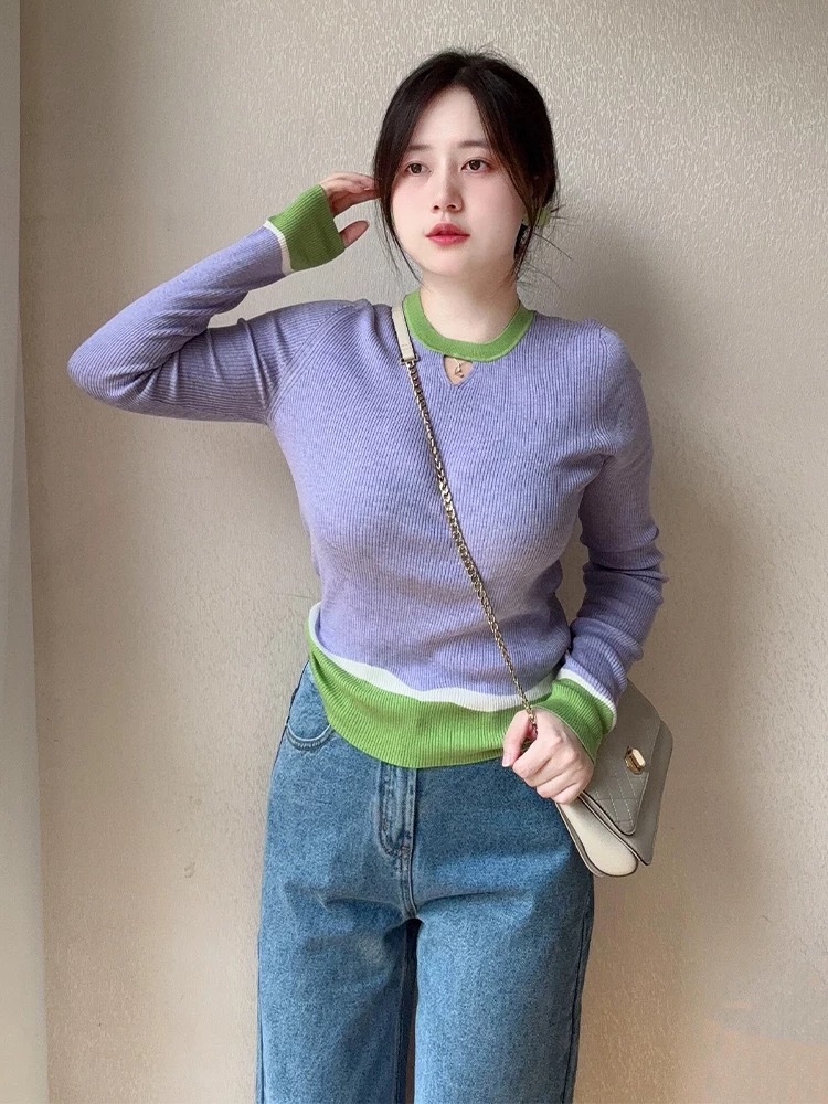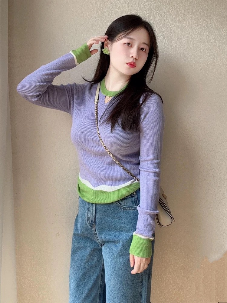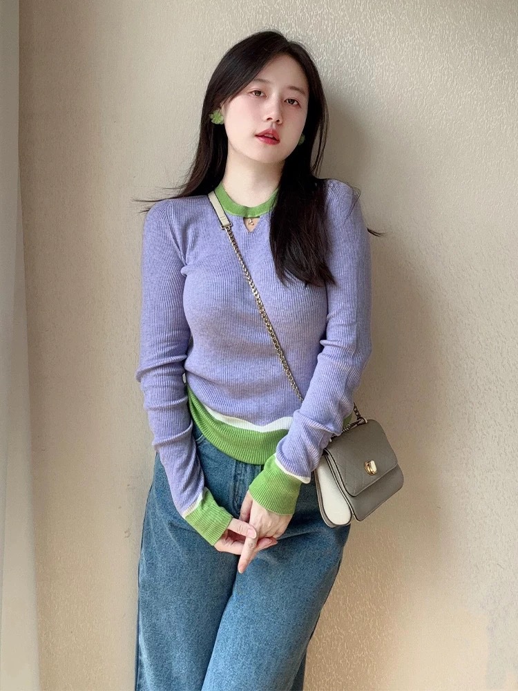 Элегантный трикотажный свитер-база цвета фиолетового допамина для женщин, весна 2025, большие размеры, корейский стиль, длинный рукав, цветные блоки, внутренняя одежда