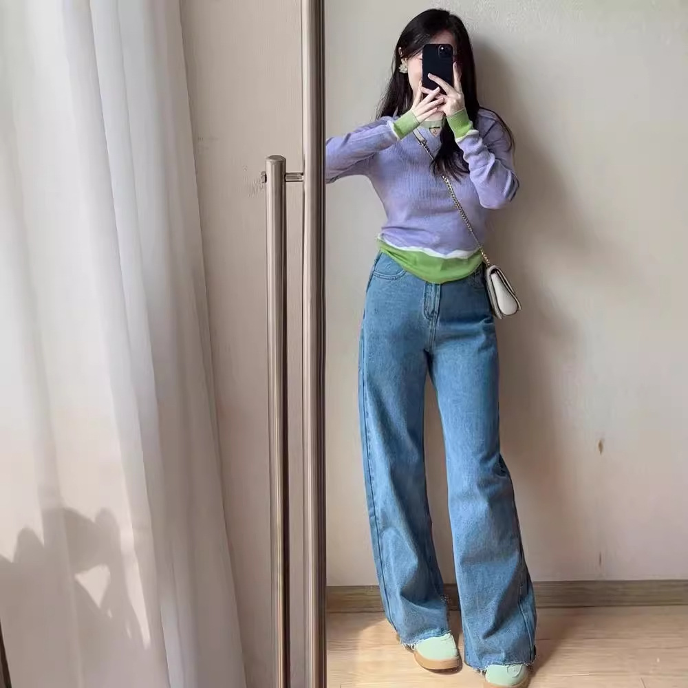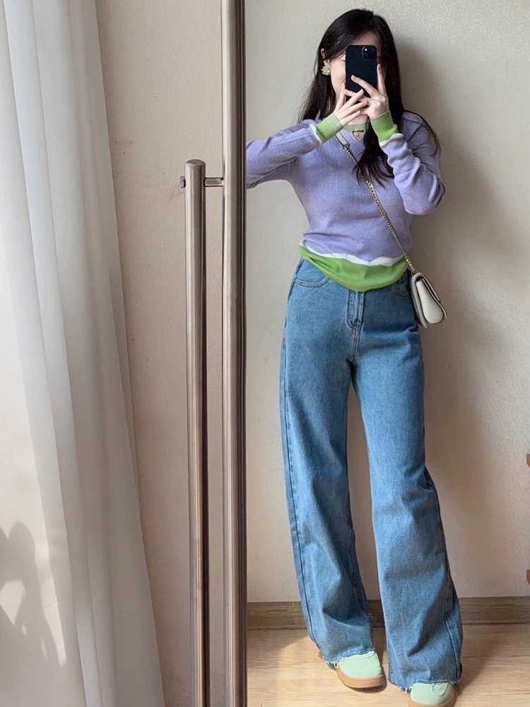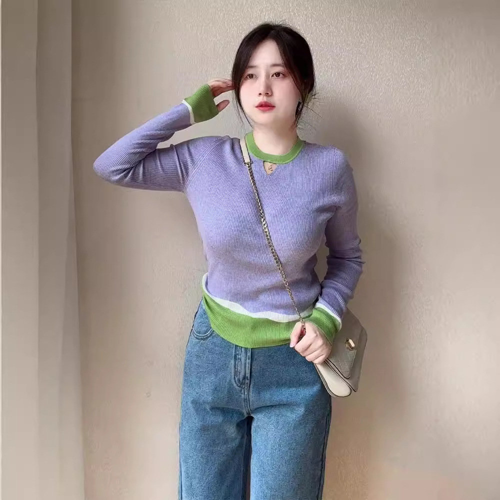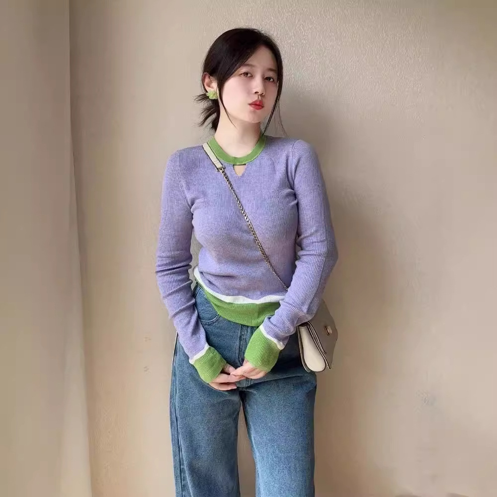 Элегантный трикотажный свитер-база цвета фиолетового допамина для женщин, весна 2025, большие размеры, корейский стиль, длинный рукав, цветные блоки, внутренняя одежда