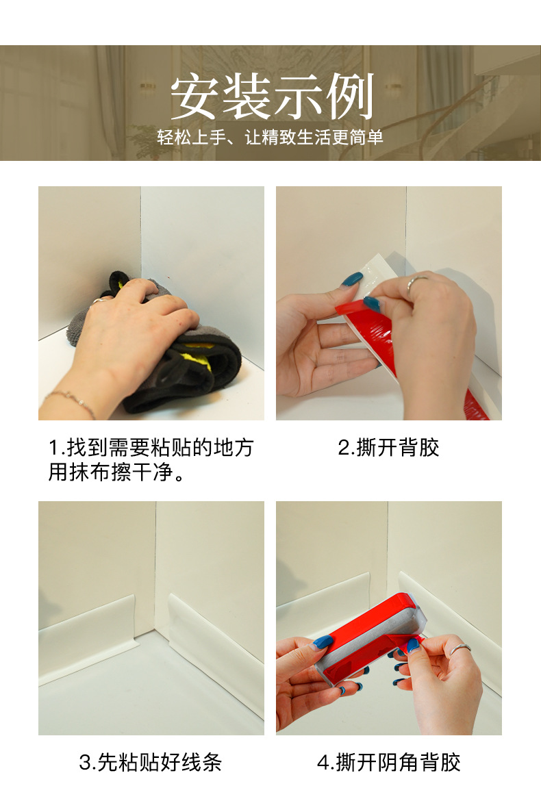 本品为自粘装饰转角,配漆面的自粘踢脚线