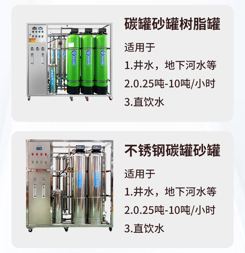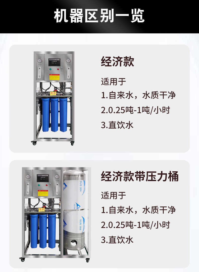 250 литров в час + экономичная модель (источник водопроводной воды); 250 литров в час + модернизированная версия; 250 литров в час + депозит бочки под давлением; 250 литров в час + двойной стеклянный резервуар; 250 литров в час + три стеклянные банки; 500 литров в час + экономичная модель (источник водопроводной воды); 500 литров в час + напорный баррель; 500 литров в час + двойной стеклянный резервуар; 500 литров в час + три стеклянные банки; 1 тонна в час + экономичная модель (источник водопроводной воды); 1 тонна в час + бочка под давлением; 1 тонна в час + двойной фильтрующий резервуар; 1 тонна в час + три фильтрующих бака; 2 тонны в час + двойной фильтр-бак; 2 тонны в час + три фильтрующих бака; Двухступенчатый обратный осмос производительностью 0,25 тонны.; Двухступенчатый обратный осмос 0,5 тонны.