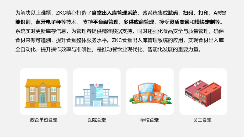 ZKC精心打造了食堂出入库管理系统,该系统集成赋码,扫码,打印,AR智能识别,蓝牙电子秤等技术.,支持平台级管理,多供应商管理,接受灵活变通和模块定制等。系统实时更新库存信息,为管理者提供精准数据支持。同时还强化食品安全与质量管理,确保食材来源可追溯,提升食堂整体服务水平。ZKC食堂出入库管理系统的应用,实现食材出入库全自动化,提升操作效率与准确性,是推动餐饮业现代化、智能化发展的重要力量。