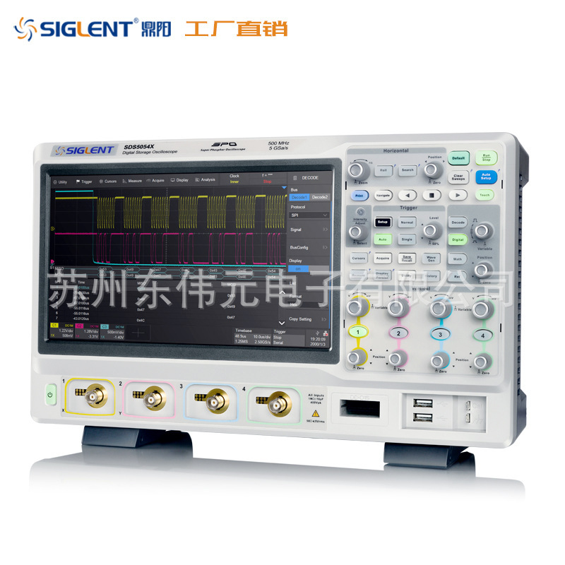 SDS5000X 系 列 超 级 荧 光 混 合 信 号 示 波 器, 带 宽1GHz,采样率 5GSa/s,具备 4 个模拟通道和 16个数字通道,存储深度可达 250Mpts。SDS5000X 采用的SPO 技术,波形捕获率高达 500000 帧 / 秒,具有 256 级辉度等级及色温显示;创新的数字触发系统,触发灵敏度高,触发抖动小;支持丰富的智能触发、串行总线触发和解码;支持历史(History)模式、分段采集(Sequence)、增强分辨率(Eres)、搜索(Search)和导航(Navigate)等采集和分析模式;具备丰富的测量和数学运算功能。