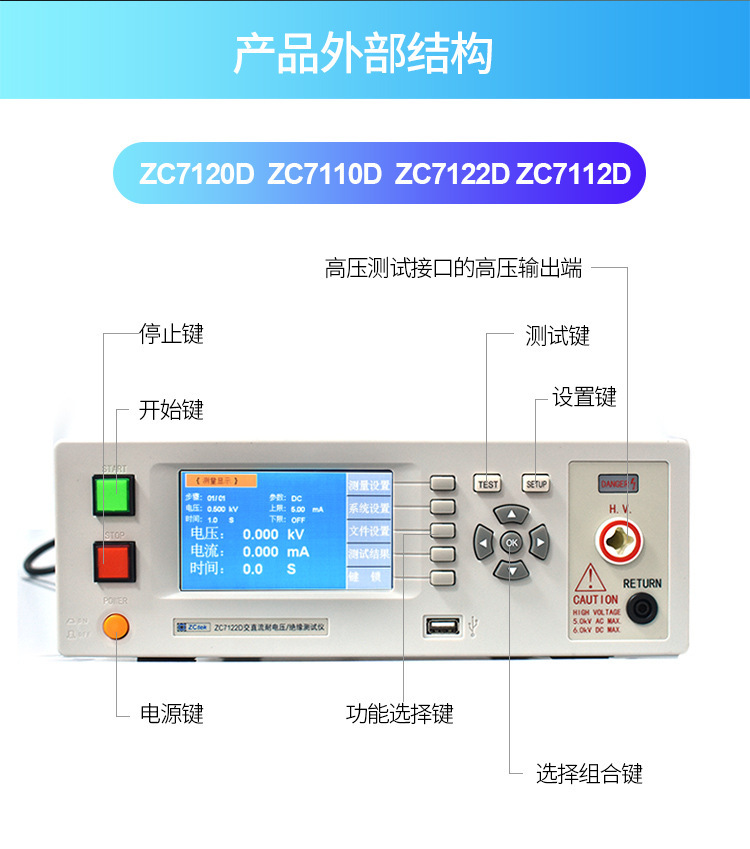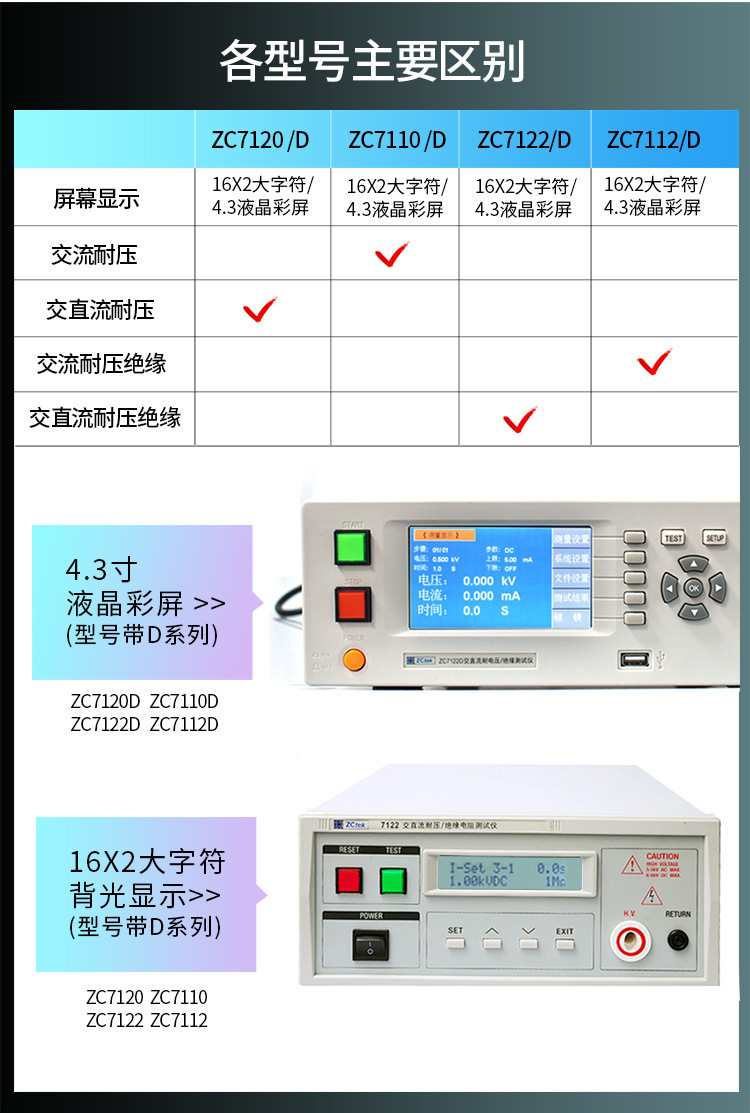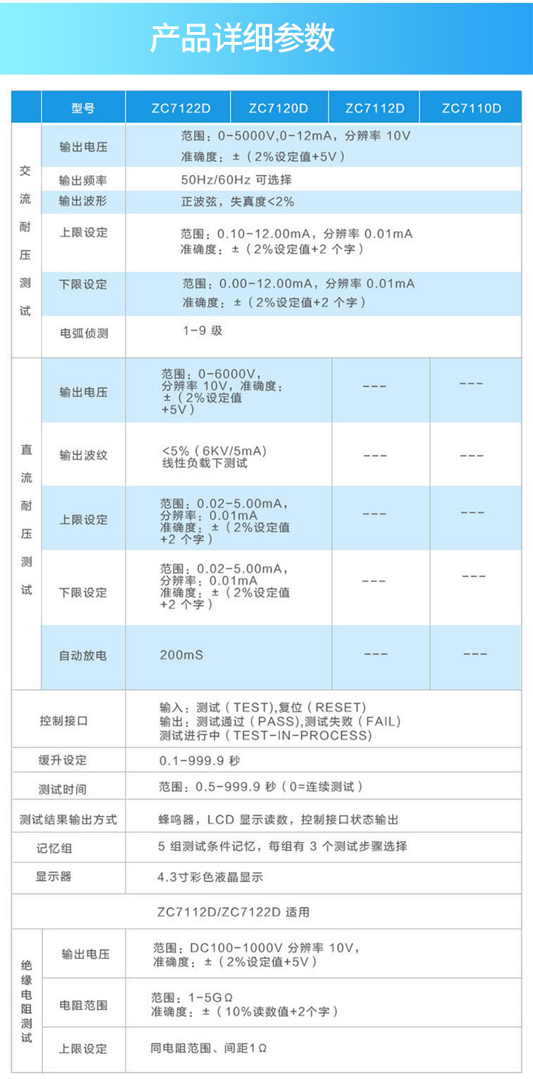 ZC7110D(5kV/12mA); ZC7120D(5kV/12mA); ZC7112D(5kV/12mA/1000MΩ); ZC7122D(5kV/12mA)