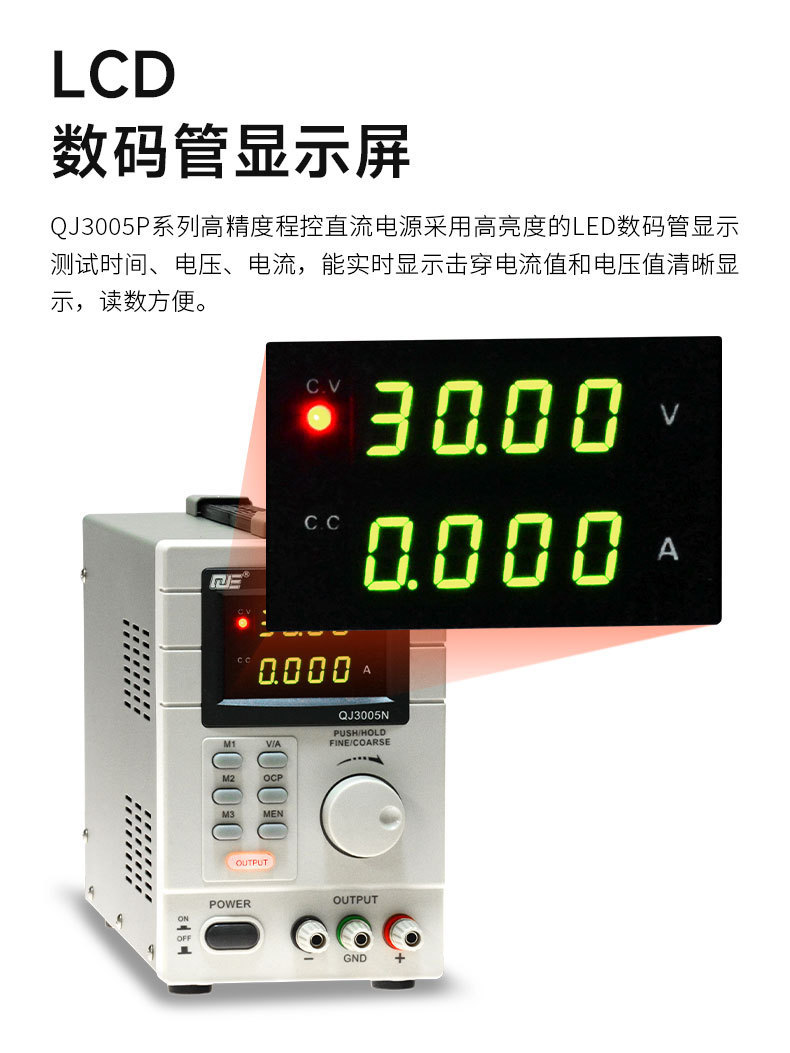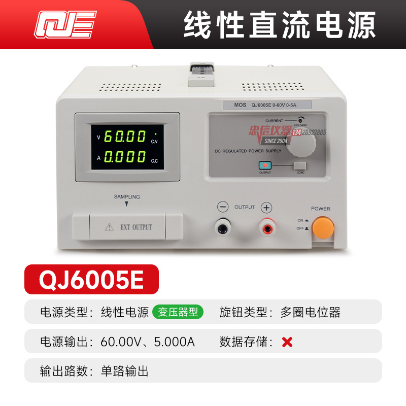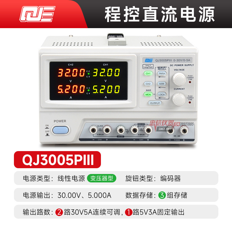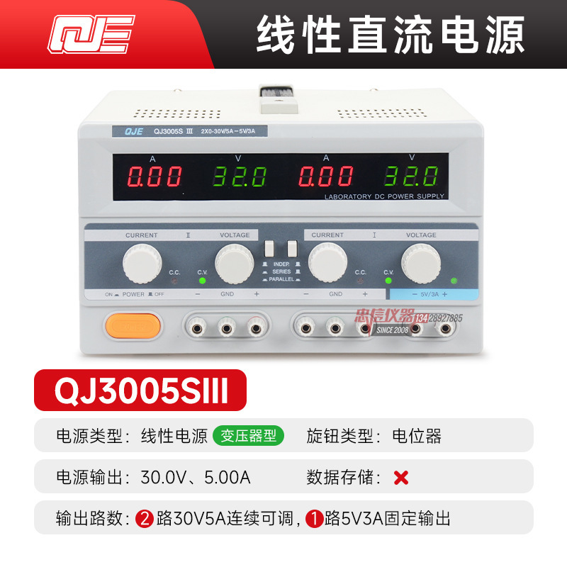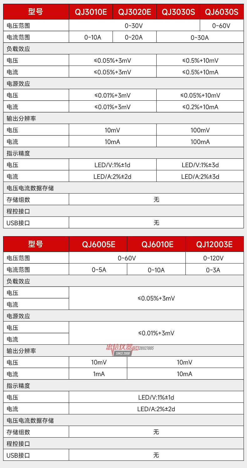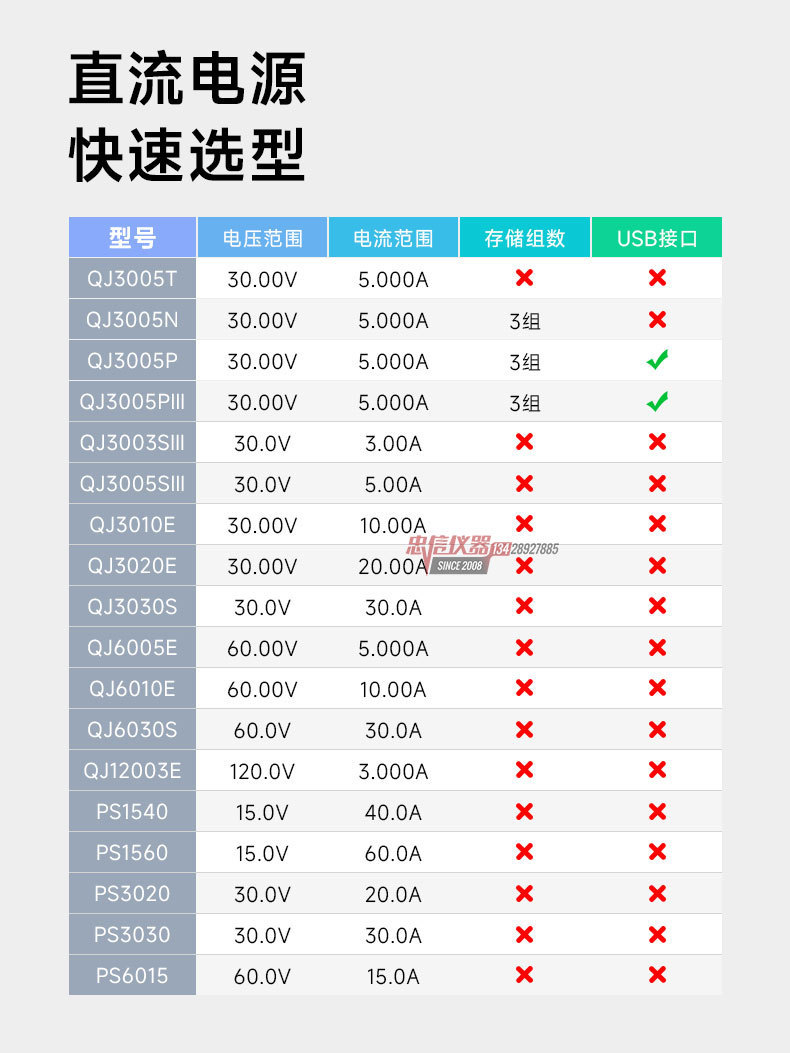 QJ3005T (линейная обтекаемая модель (30V5A); QJ3005N (линейная классическая модель (30V5A); QJ3005P (30V5A модель линейной связи); QJ3005PIII (30V5A трехсторонний линейный источник питания с программным управлением); QJ3003SIII (30V3A трехходовой линейный источник питания постоянного тока); QJ3005SIII (30V5A трехходовой линейный источник питания постоянного тока); QJ3010E (линейный источник питания постоянного тока 30 В 10 А); QJ3020E (линейный источник питания постоянного тока 30 В 20 А); QJ30S (30V30A линейный источник питания постоянного тока); QJ6005E (линейный источник питания постоянного тока 60 В 5 А); QJ6010E (линейный источник питания постоянного тока 60 В 10 А); QJ6030S (линейный источник питания постоянного тока 60 В 30 А); QJ12003E (1 линейный источник питания постоянного тока 220 В 3 А); PS1540 (импульсный источник питания постоянного тока 15 В 40 А); PS1560 (импульсный источник питания постоянного тока 15 В 60 А); PS3020 (30 Импульсный источник питания постоянного тока 20 В); PS3030 (30 Импульсный источник питания постоянного тока); PS6015 (импульсный источник питания постоянного тока 60 В 15 А)