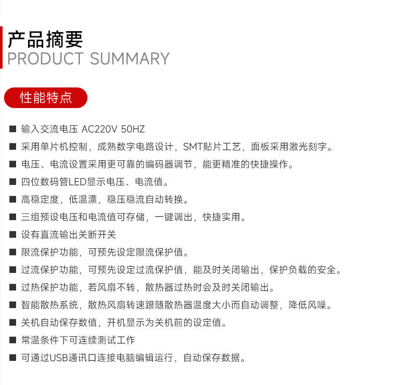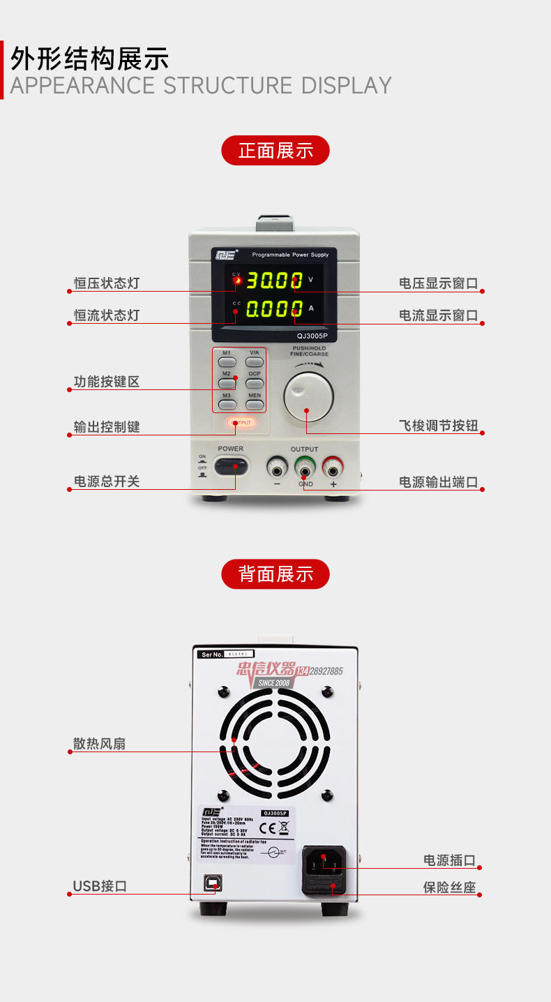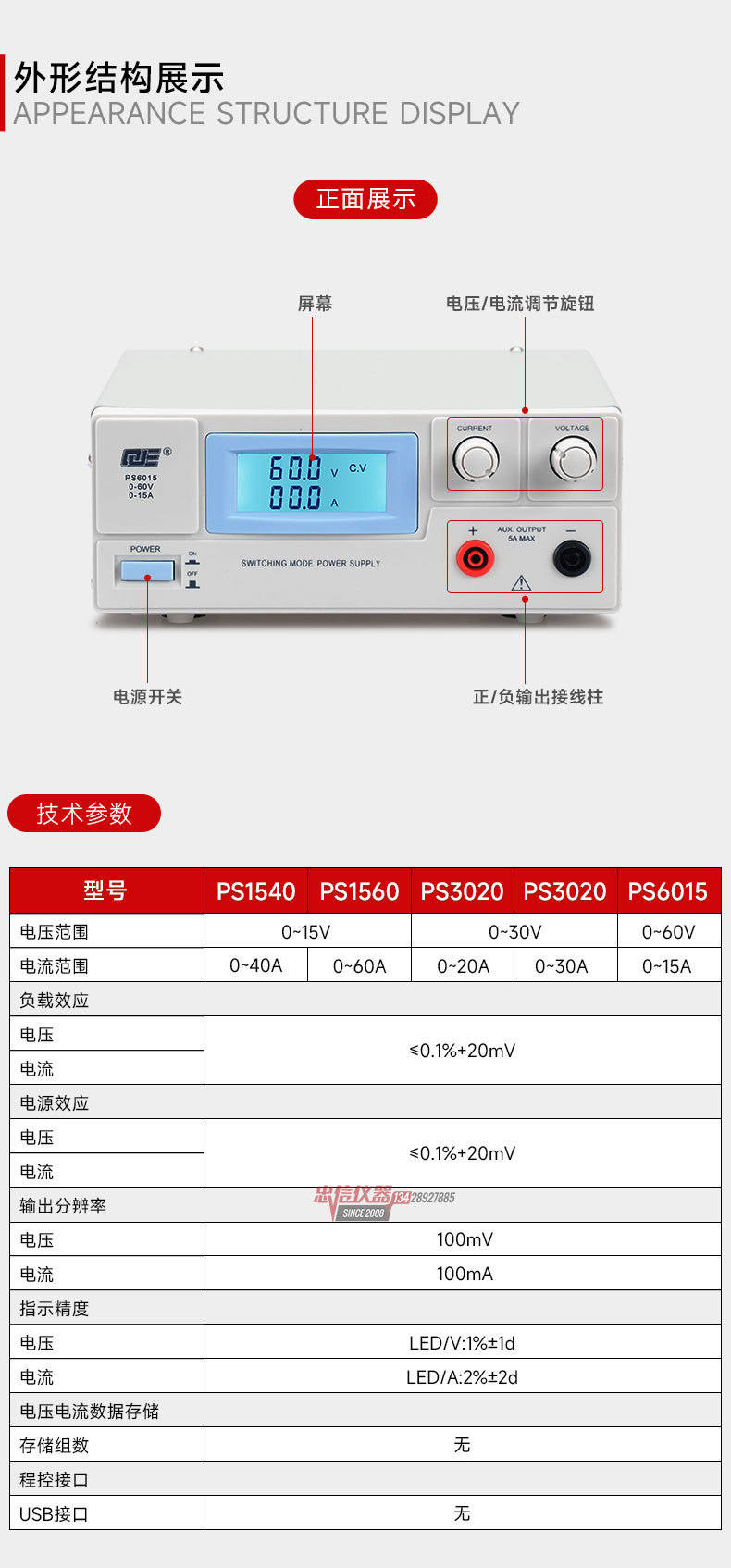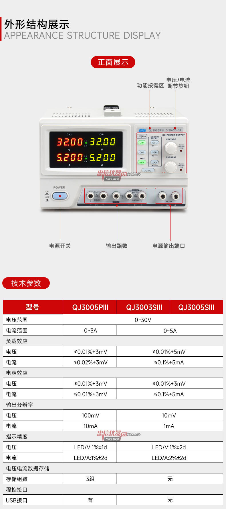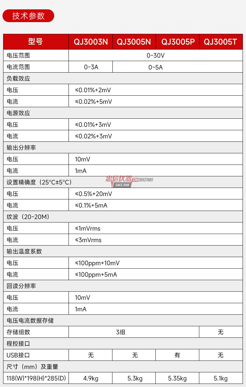 QJ3005T (линейная обтекаемая модель (30V5A); QJ3005N (линейная классическая модель (30V5A); QJ3005P (30V5A модель линейной связи); QJ3005PIII (30V5A трехсторонний линейный источник питания с программным управлением); QJ3003SIII (30V3A трехходовой линейный источник питания постоянного тока); QJ3005SIII (30V5A трехходовой линейный источник питания постоянного тока); QJ3010E (линейный источник питания постоянного тока 30 В 10 А); QJ3020E (линейный источник питания постоянного тока 30 В 20 А); QJ30S (30V30A линейный источник питания постоянного тока); QJ6005E (линейный источник питания постоянного тока 60 В 5 А); QJ6010E (линейный источник питания постоянного тока 60 В 10 А); QJ6030S (линейный источник питания постоянного тока 60 В 30 А); QJ12003E (1 линейный источник питания постоянного тока 220 В 3 А); PS1540 (импульсный источник питания постоянного тока 15 В 40 А); PS1560 (импульсный источник питания постоянного тока 15 В 60 А); PS3020 (30 Импульсный источник питания постоянного тока 20 В); PS3030 (30 Импульсный источник питания постоянного тока); PS6015 (импульсный источник питания постоянного тока 60 В 15 А)