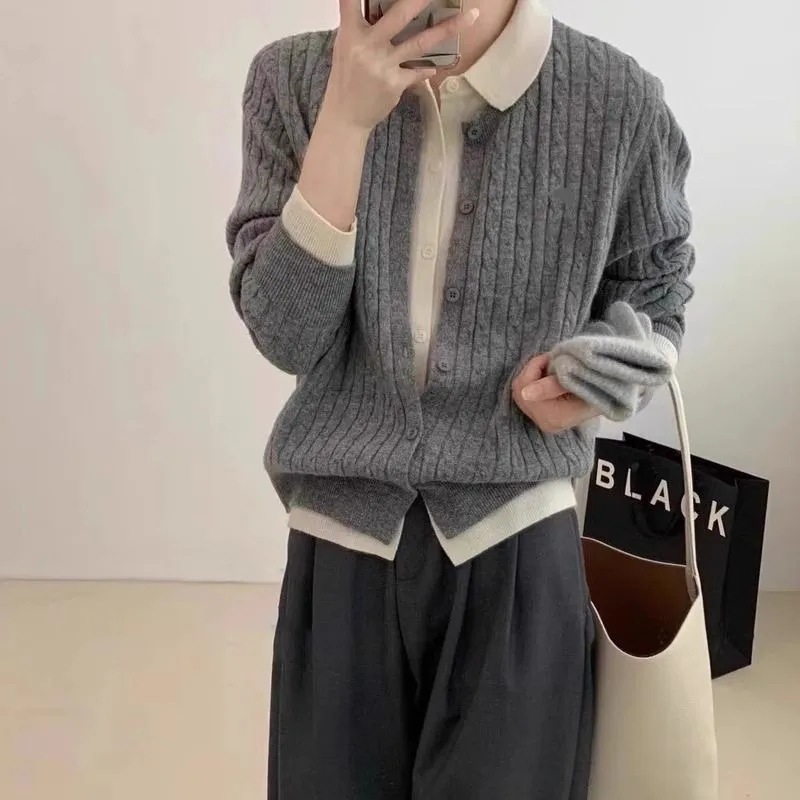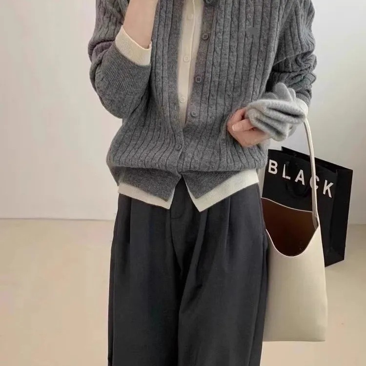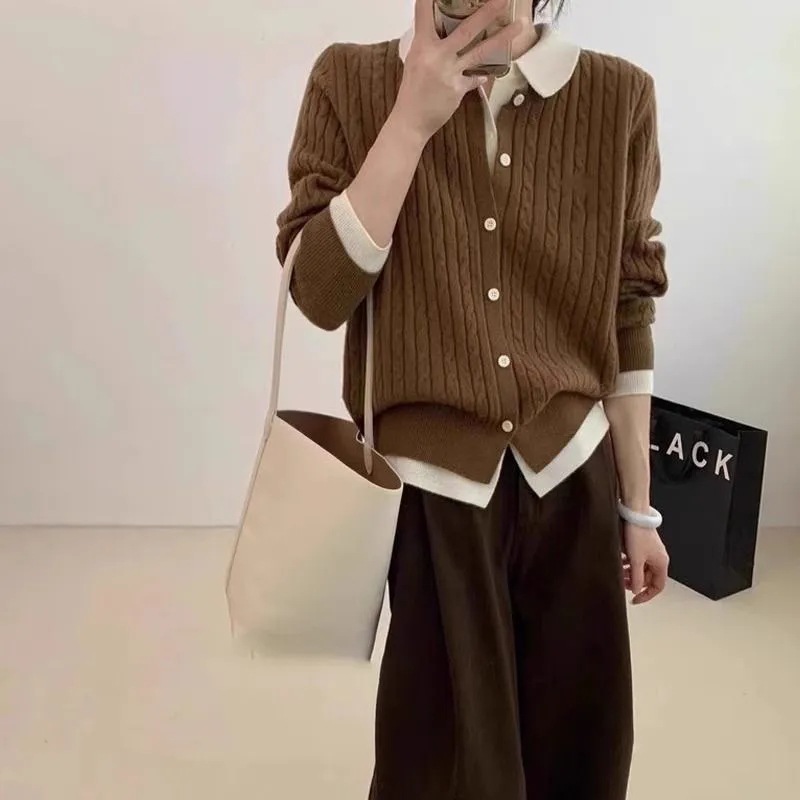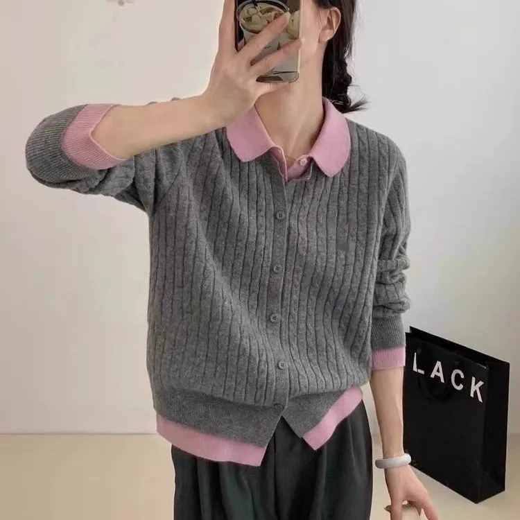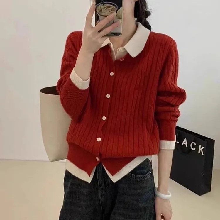Корейский дикий цвет поддельные два лацкана однобортный шерстяной трикотажный кардиган женский ленивый ветер минус красный свитер