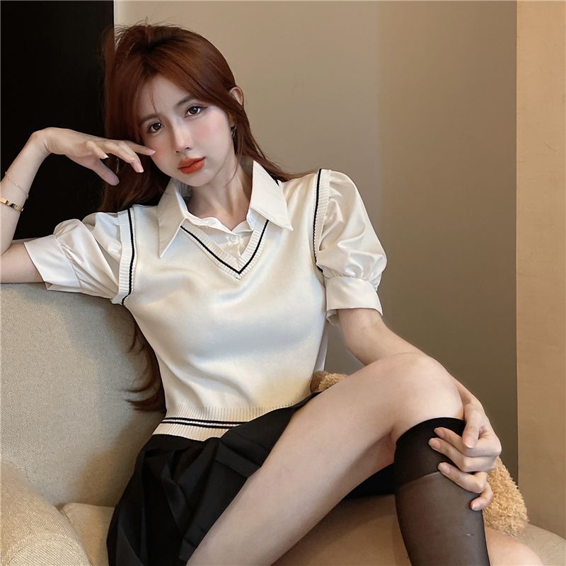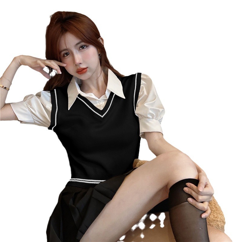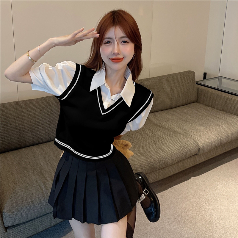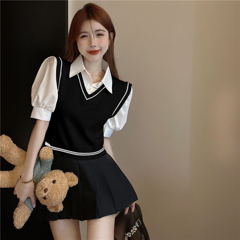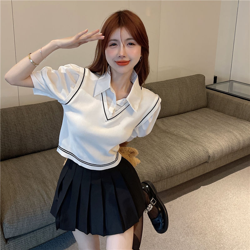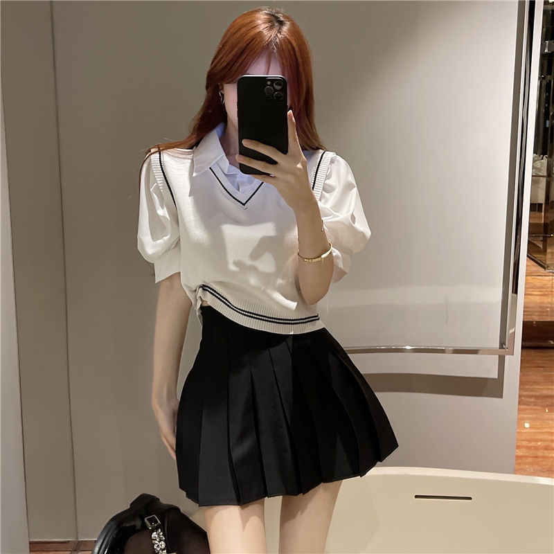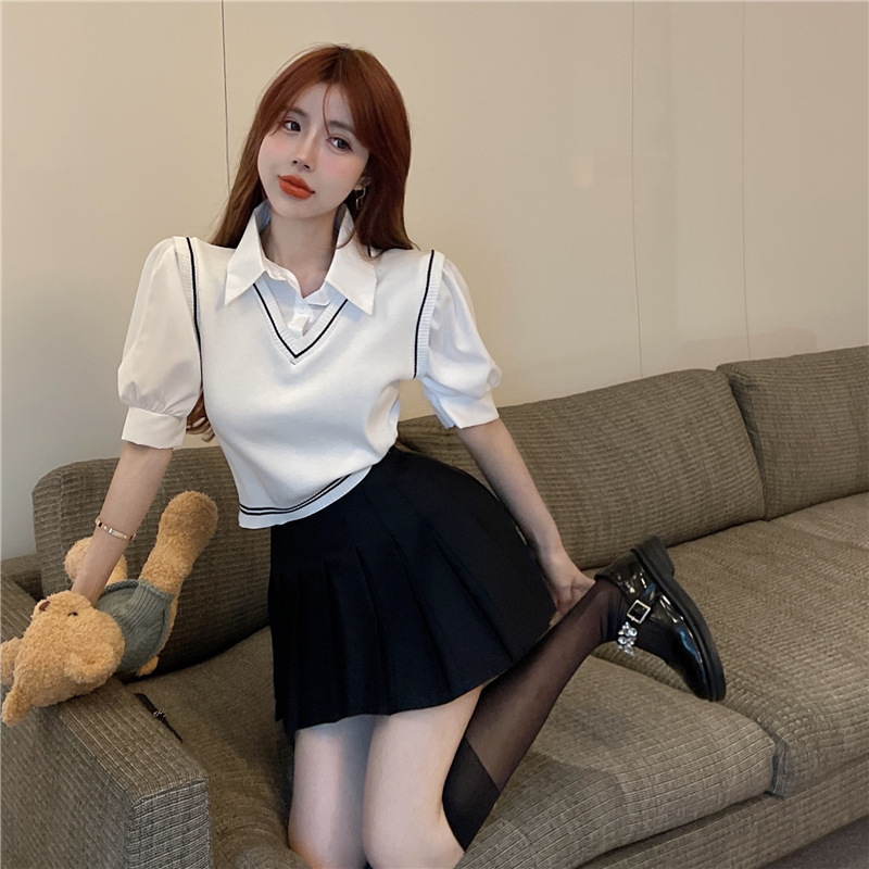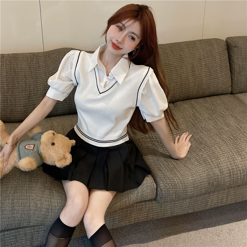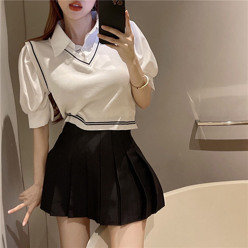 Академия стиль маленький костюм женский летний нишевые дизайн поддельные две рубашки с короткими рукавами топ плиссированная юбка набор