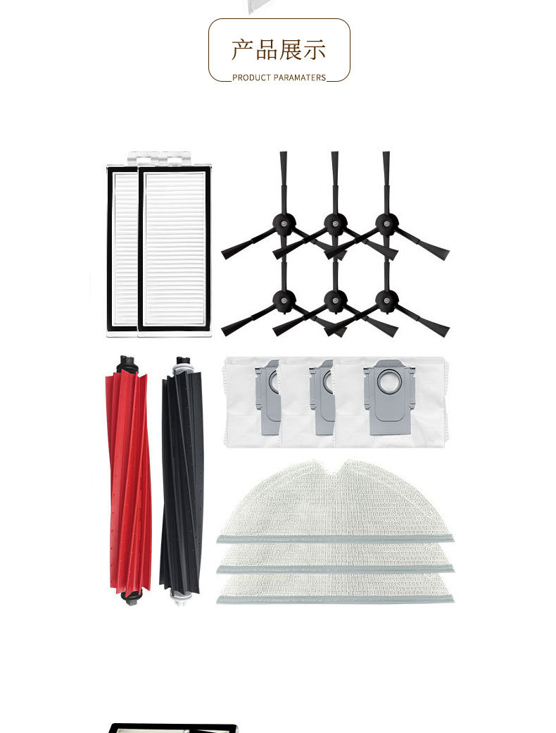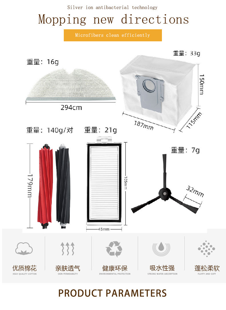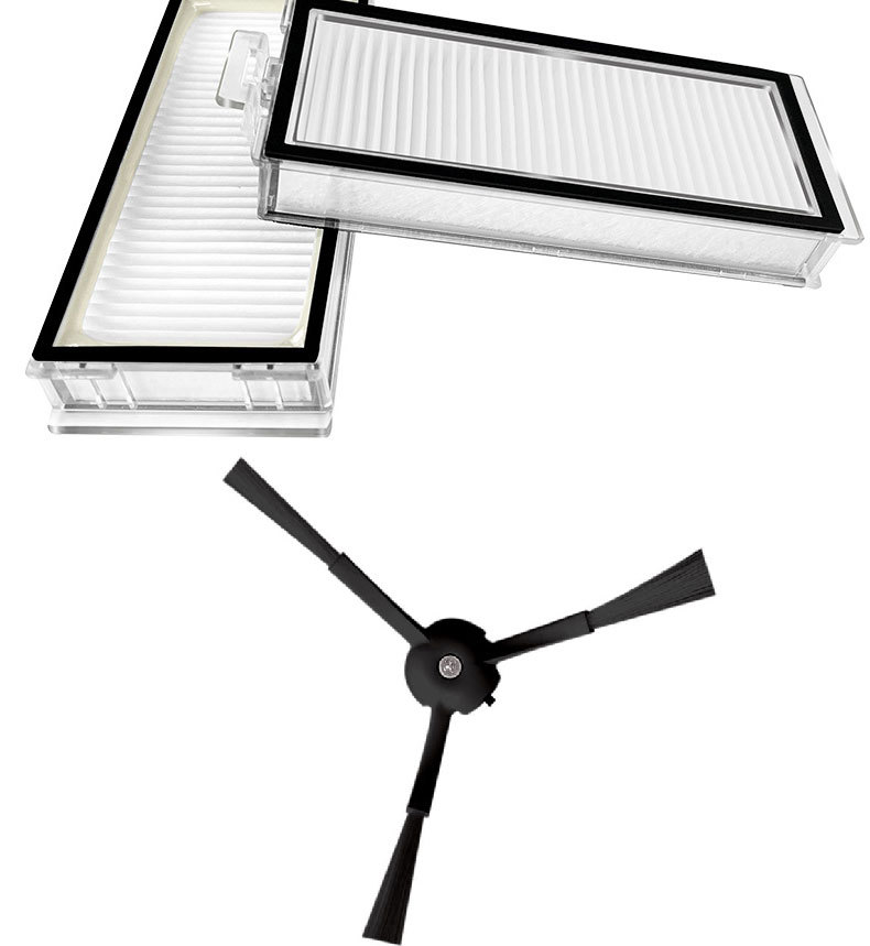 тряпка; Роликовая щетка с коробкой; Фильтр с коробкой; Белая пятиугольная боковая щетка; Черная пятиугольная боковая щетка; Белая треугольная боковая щетка; Черная треугольная боковая щетка; мешок для пыли; кисть для птиц