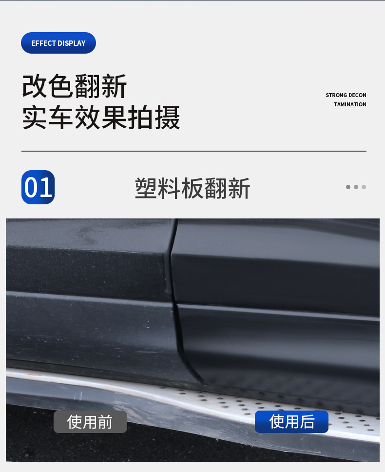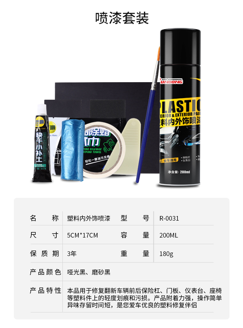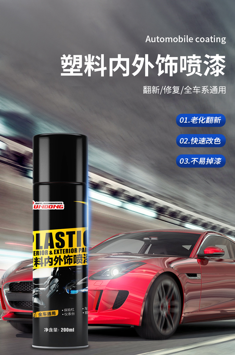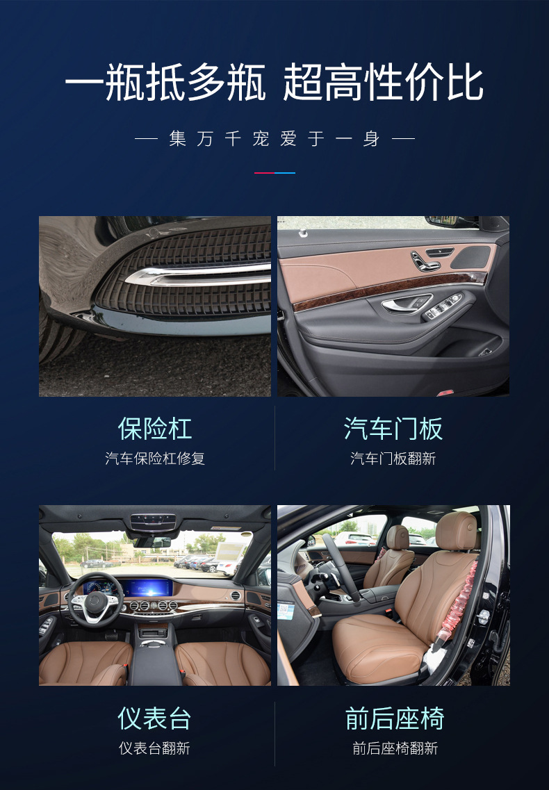 本品用于修复翻新车辆前后保险杠、门板、仪表台、座椅等塑料件上的轻度划痕和污损。产品附着力强,操作简单,异味存留时间短,是您爱车优良的塑料修复伴侣。