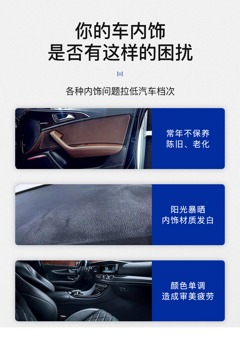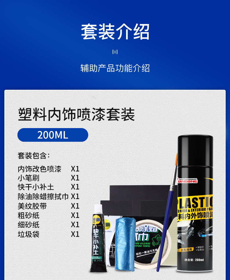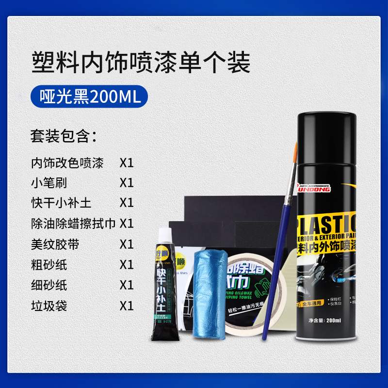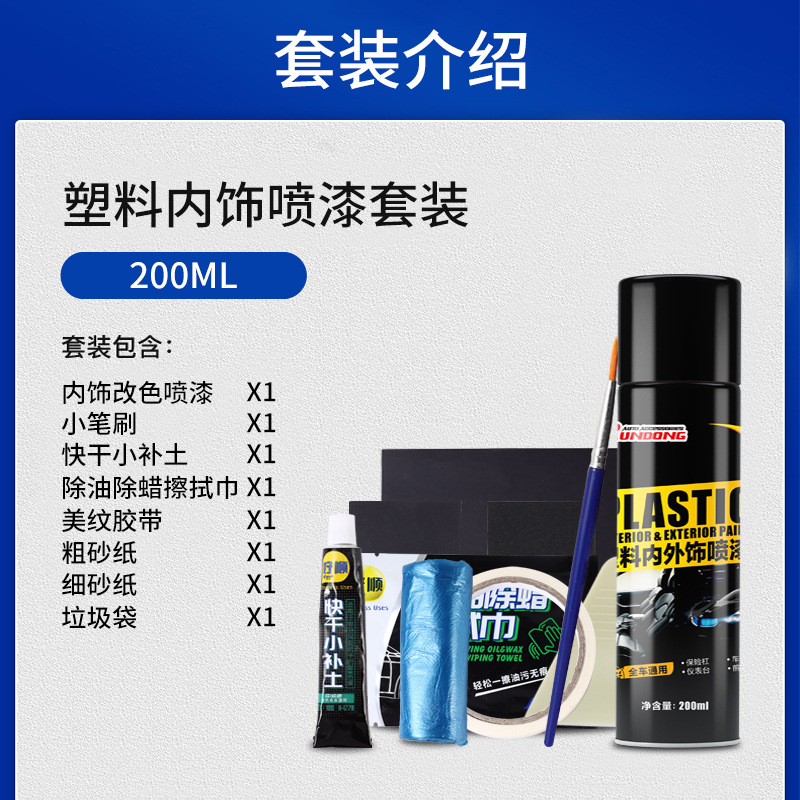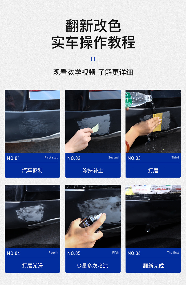 本品用于修复翻新车辆前后保险杠、门板、仪表台、座椅等塑料件上的轻度划痕和污损。产品附着力强,操作简单,异味存留时间短,是您爱车优良的塑料修复伴侣。