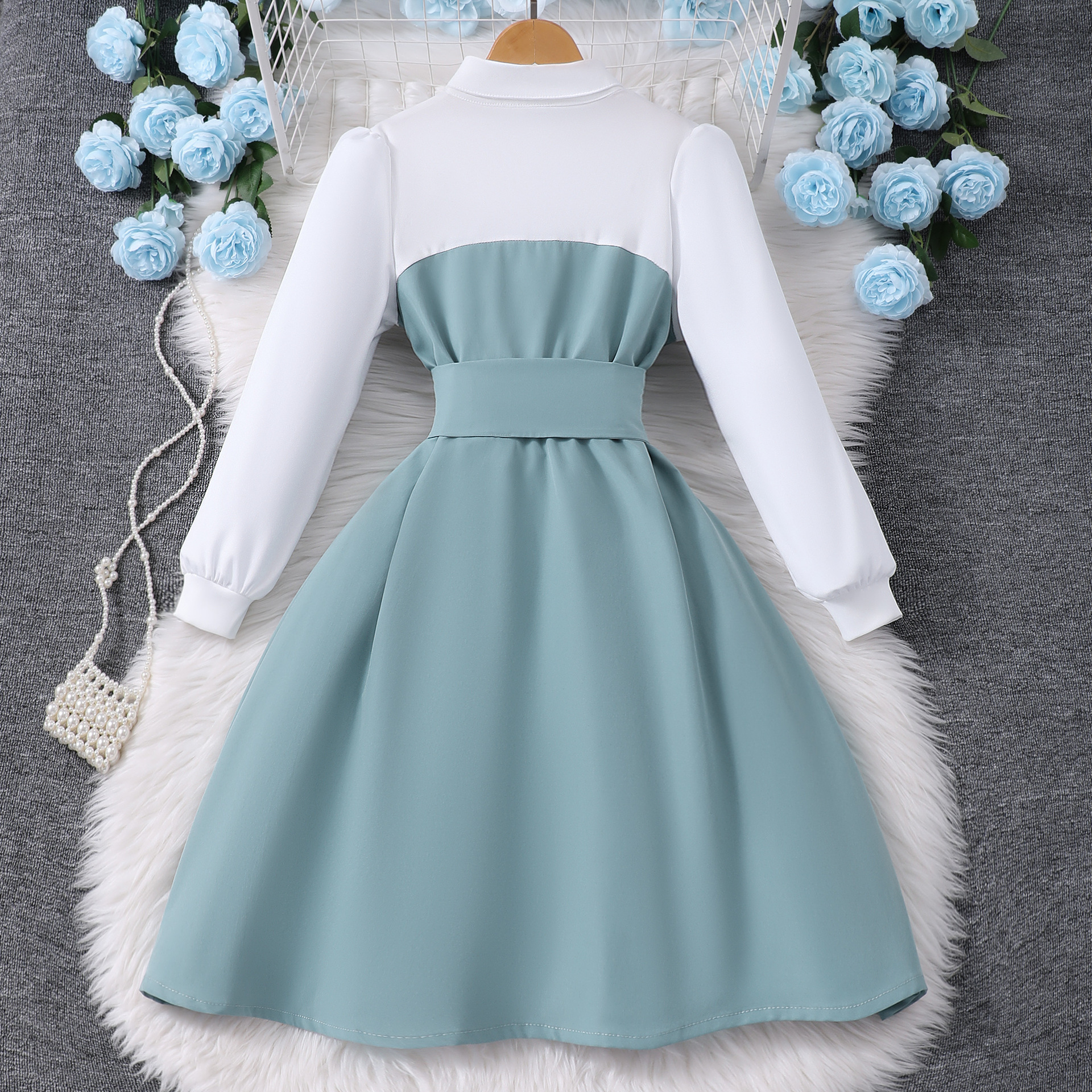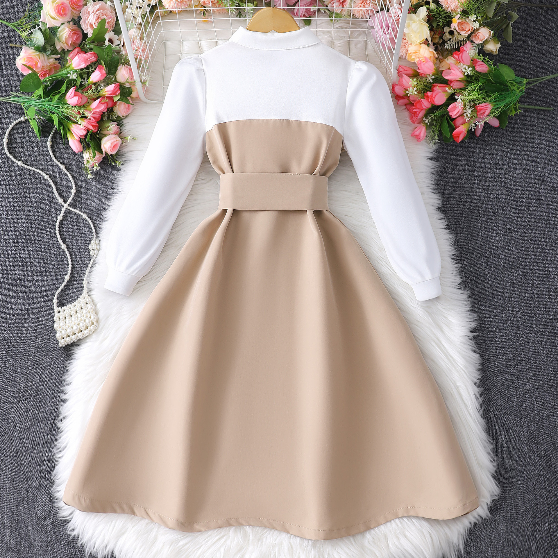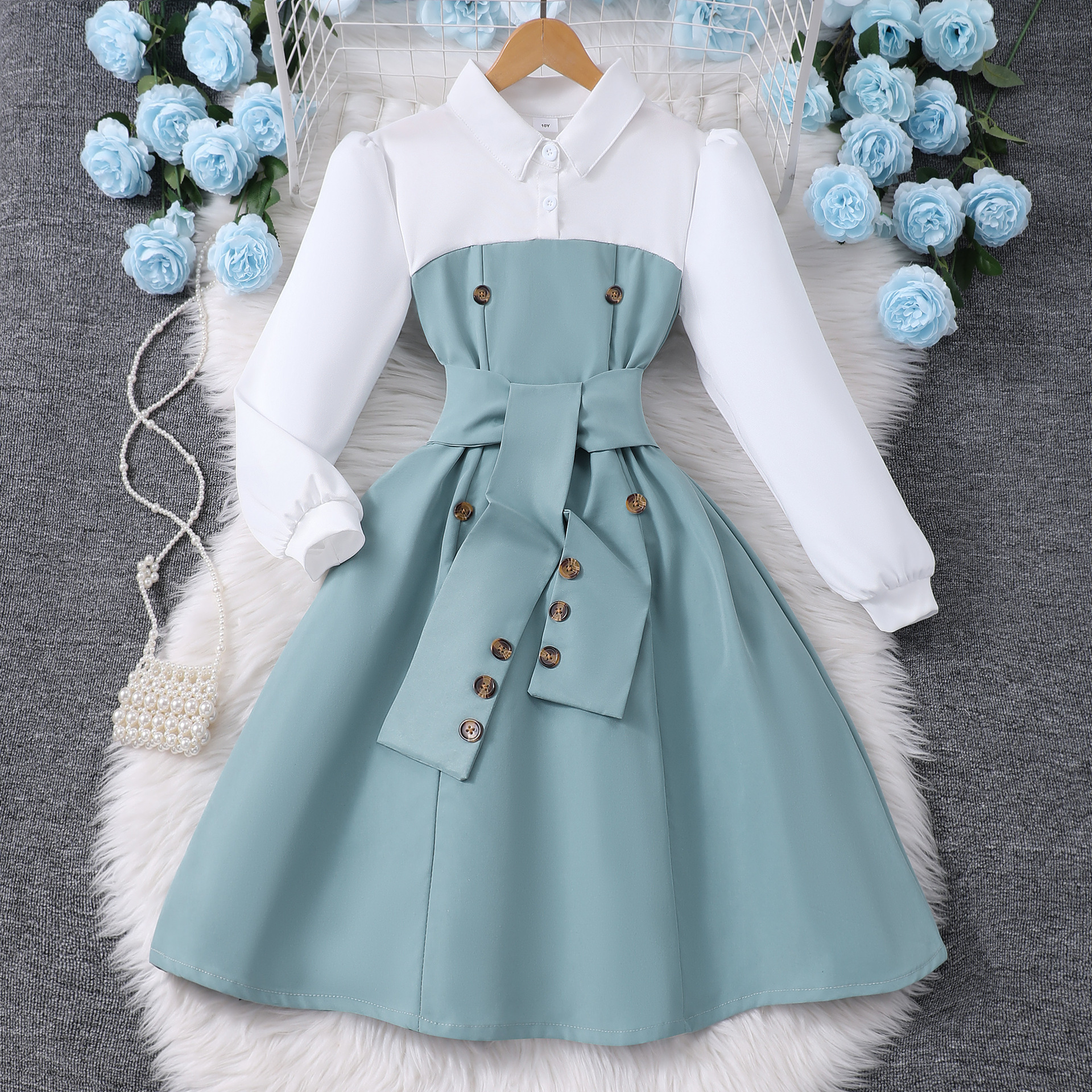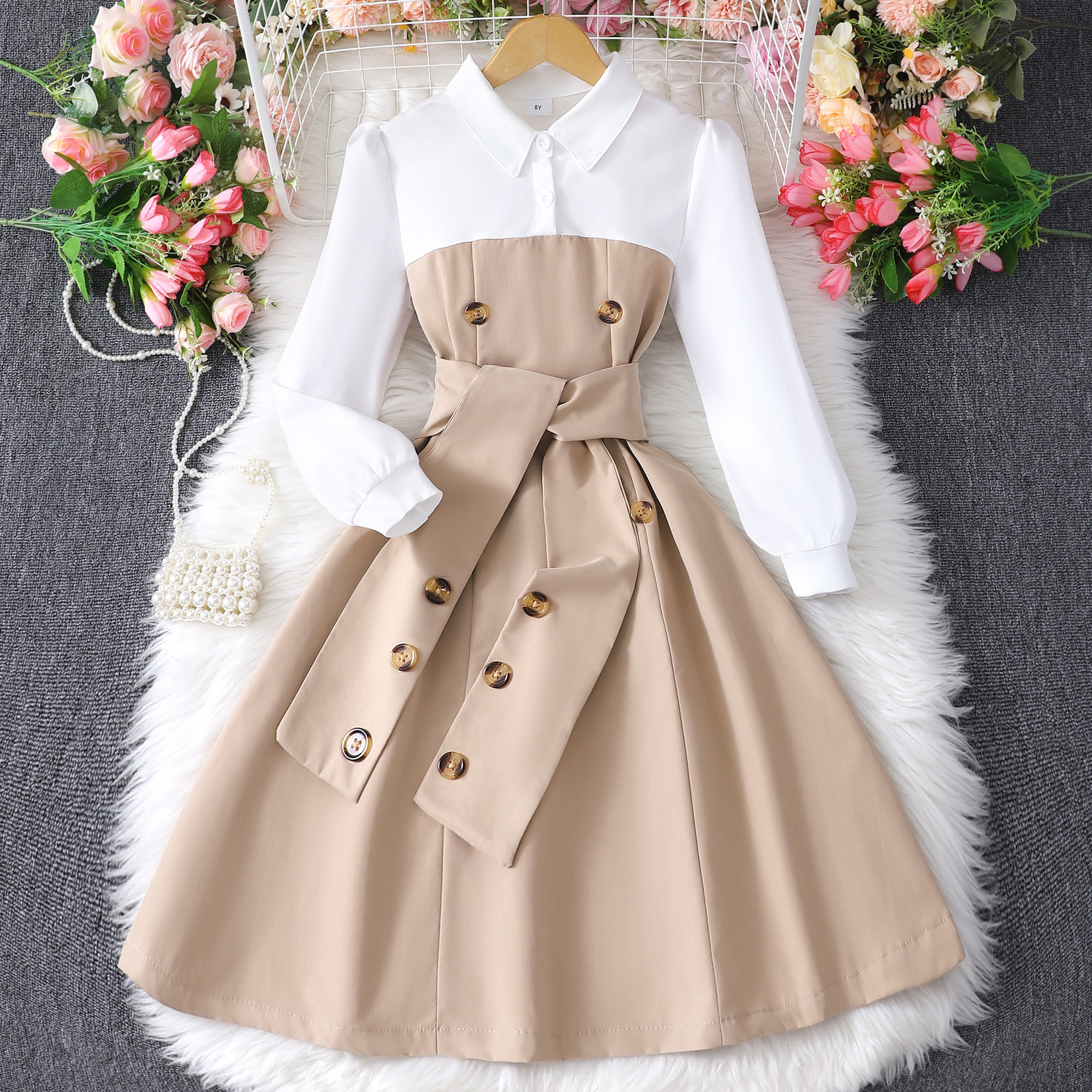 Трансграничный бестселлер для девочек, длинные рукава с лацканами и пуговицами, модное простое платье контрастного цвета.