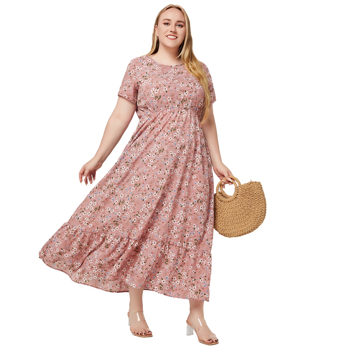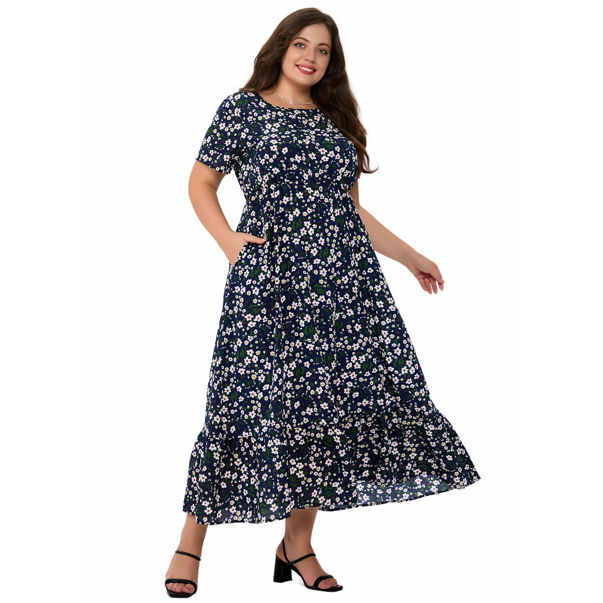 Amazon трансграничная внешняя торговля большой размер женская летняя новая модель с круглым вырезом с коротким рукавом печатное карманное платье оптом