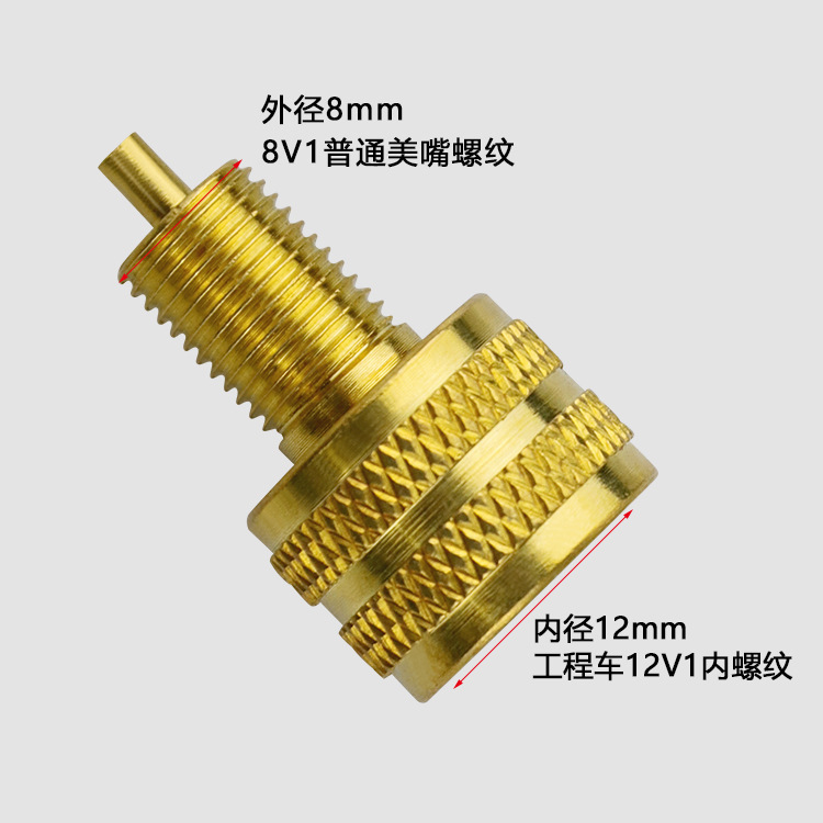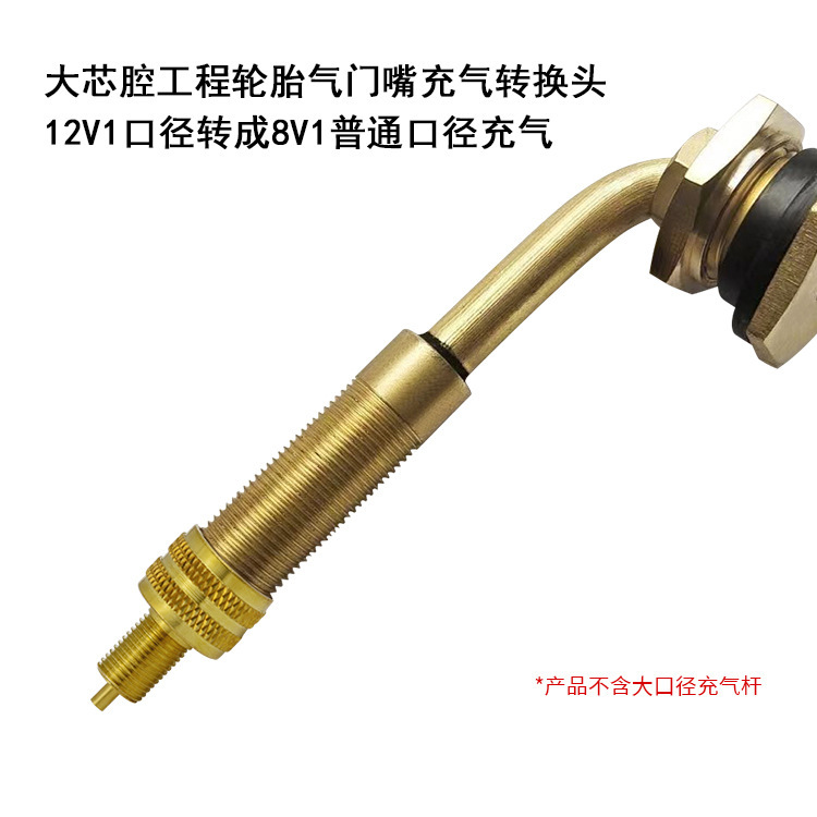 产品简介:大型工程车 货车 巨型吊机轮胎气门嘴口径12MM,一般普通充气嘴 口径是8MM的,一时无法充气时,拧上本品大嘴转小嘴头,普通充 气嘴就可以充气了
