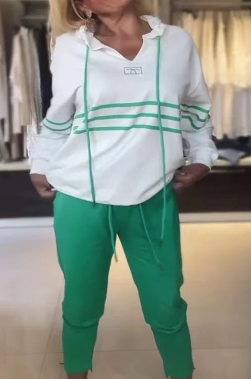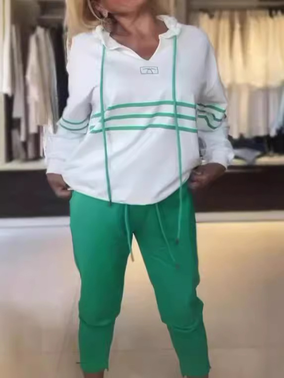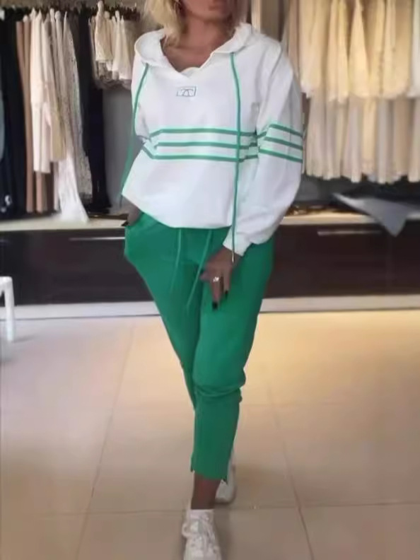 Новый модный комплект из двух предметов для женщин: толстовка с капюшоном и длинными рукавами в стиле колор-блок и повседневные брюки, коллекция Весна-Осень 2025