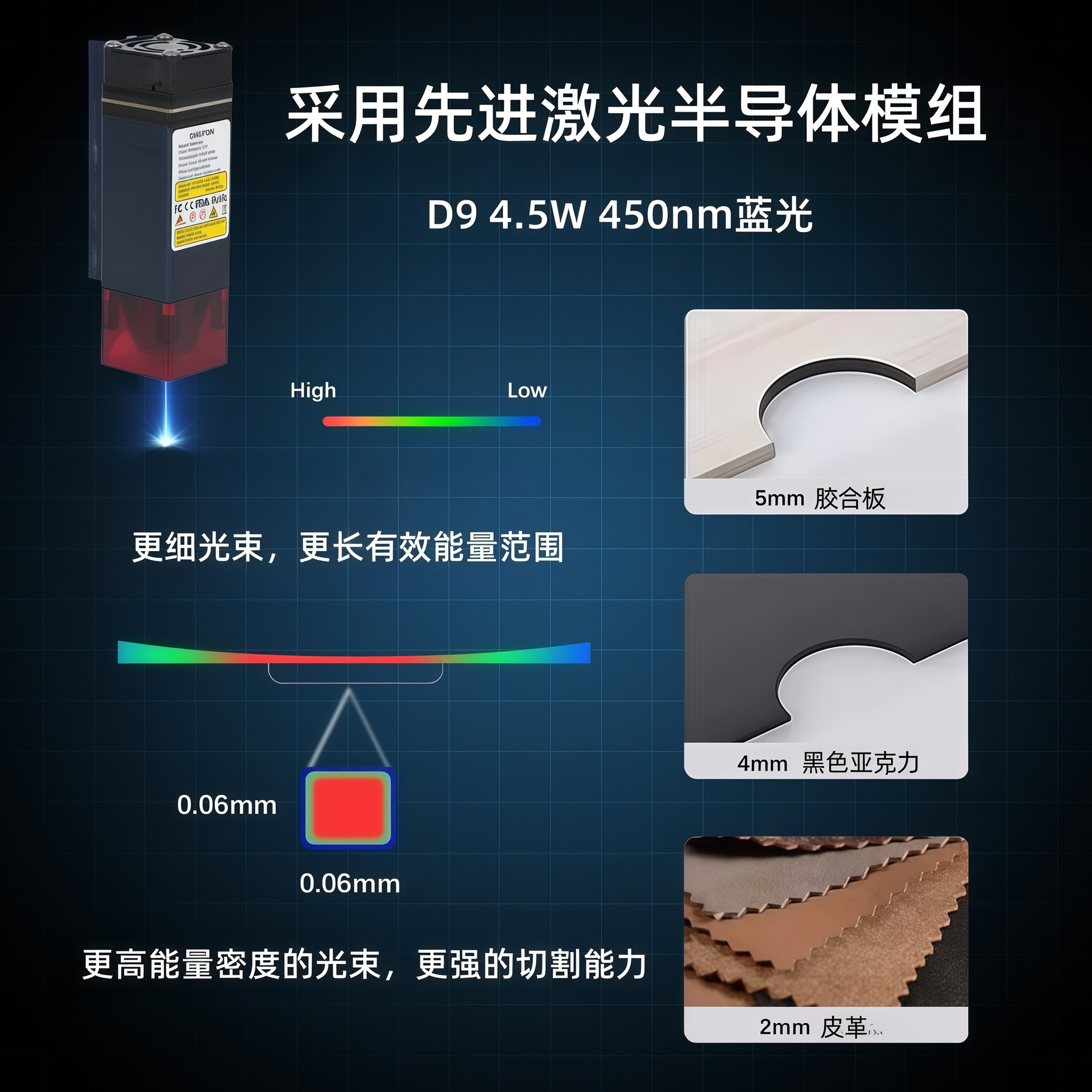 注意:透明材料、玻璃、陶瓷不能直接雕刻,表面需要覆盖,可以贴上色纸后再雕刻。2.5W不能雕刻不锈钢,只适合用于雕刻。对于需要切割薄木头及雕刻不锈钢的用户,建议考虑购买4.5W。