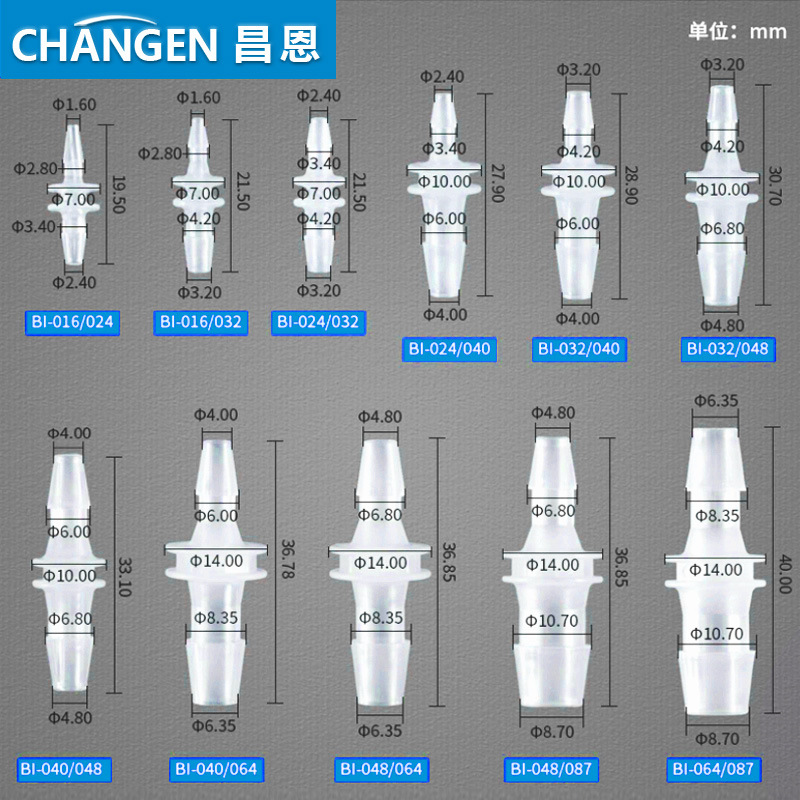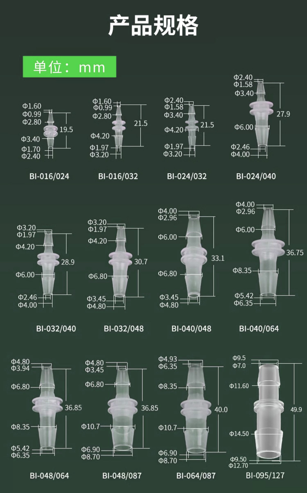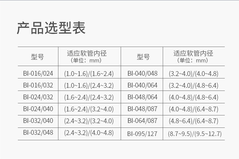 BI-016/024(1/16*3/32); BI-016/032(1/16*1/8); BI-024/032(3/32*1/8); BI-024/040(3/32*5/32); BI-032/040(1/8*5/32); BI-032/048(1/8*3/16); BI-040/048(5/32*3/16); BI-040/064(5/32*1/4); BI-048/064(3/16*1/4); BI-048/087(3/16*11/32); BI-064/087(1/4*11/32); BI-095/127