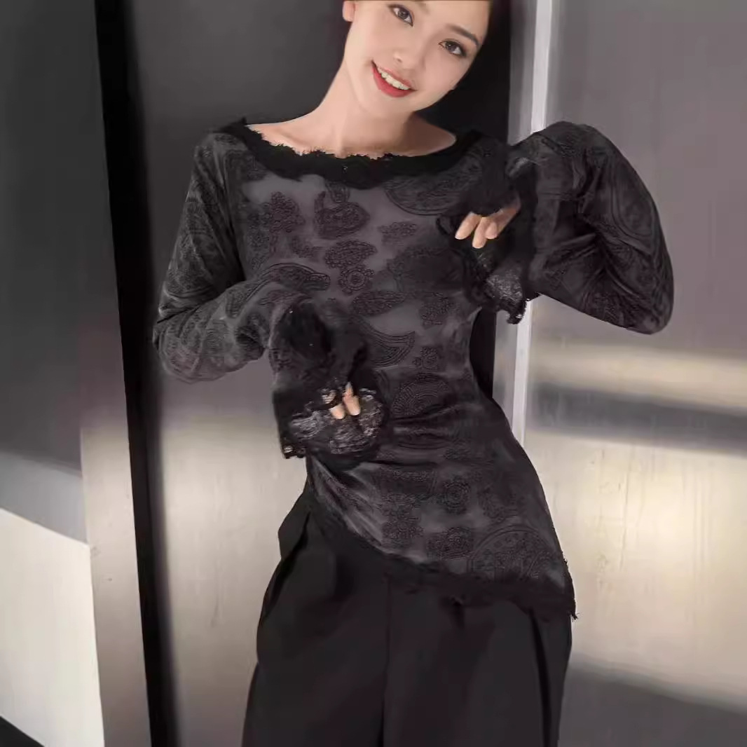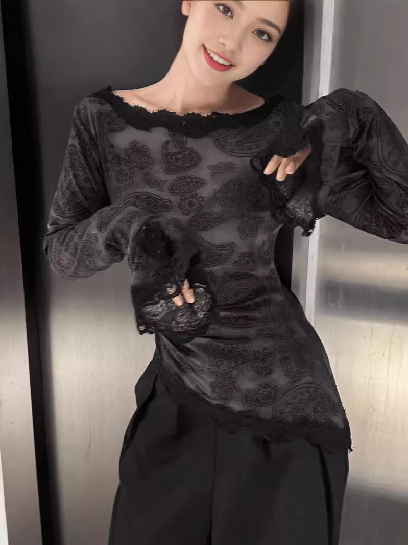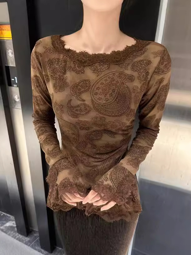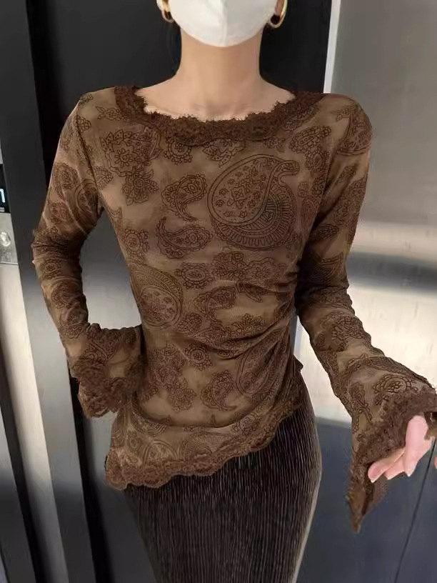 Французская мода кружевная кружевная рога с длинными рукавами топ женский весенний и осенний нерегулярный ретро цветок кешью тонкая рубашка