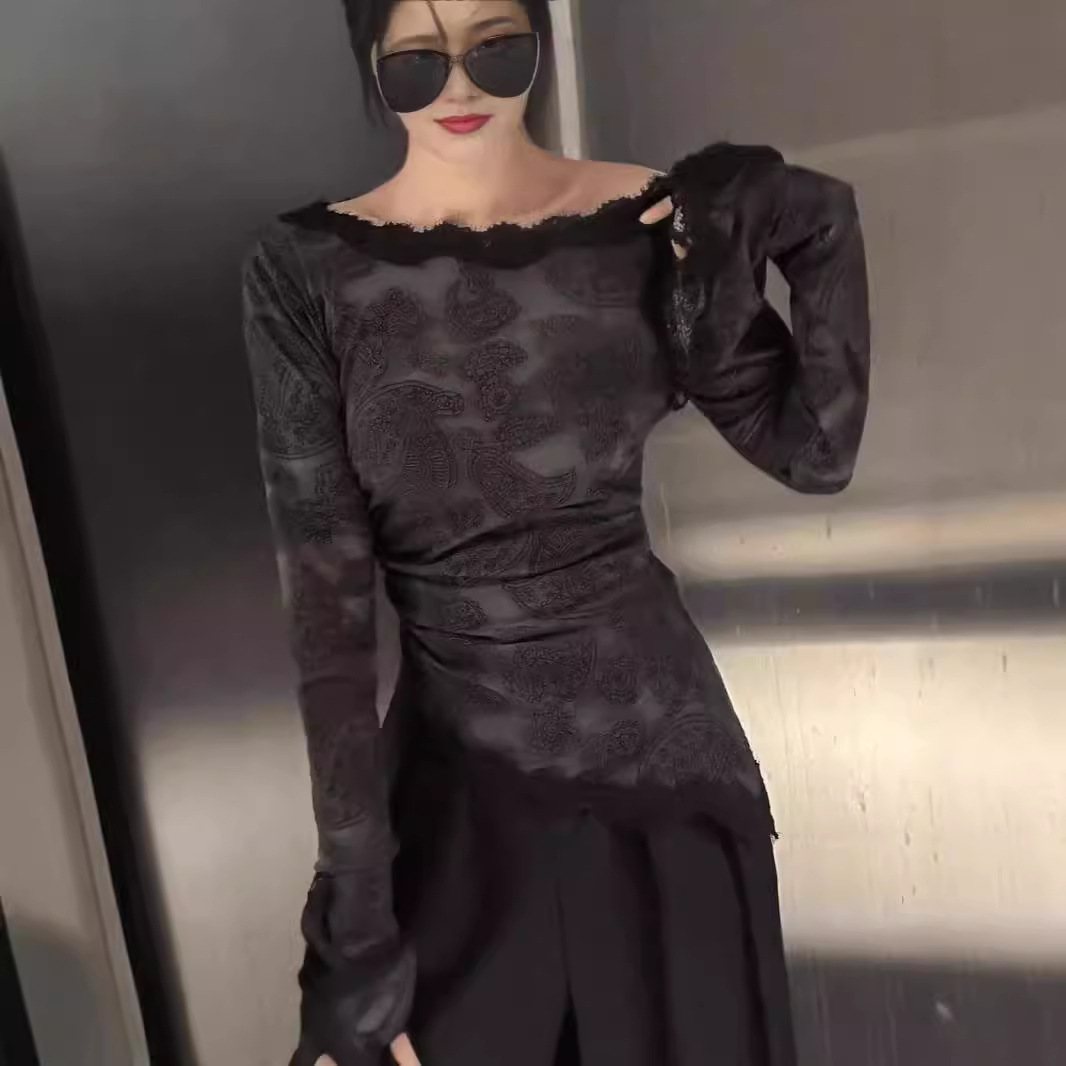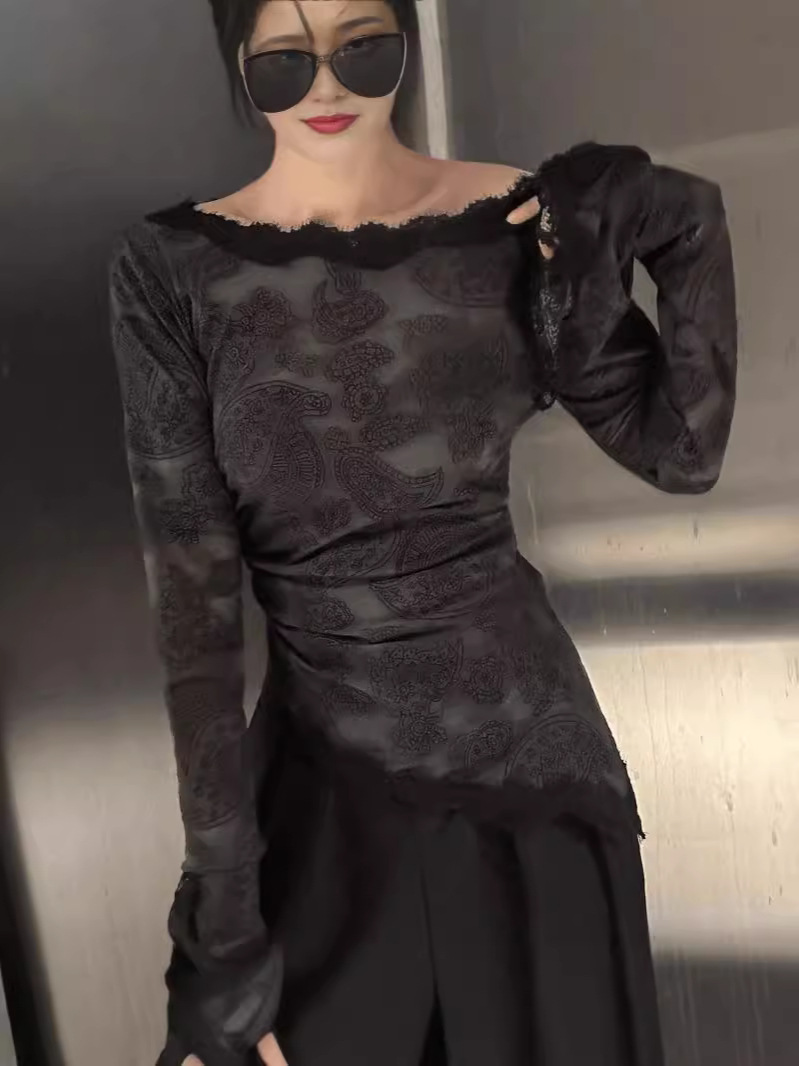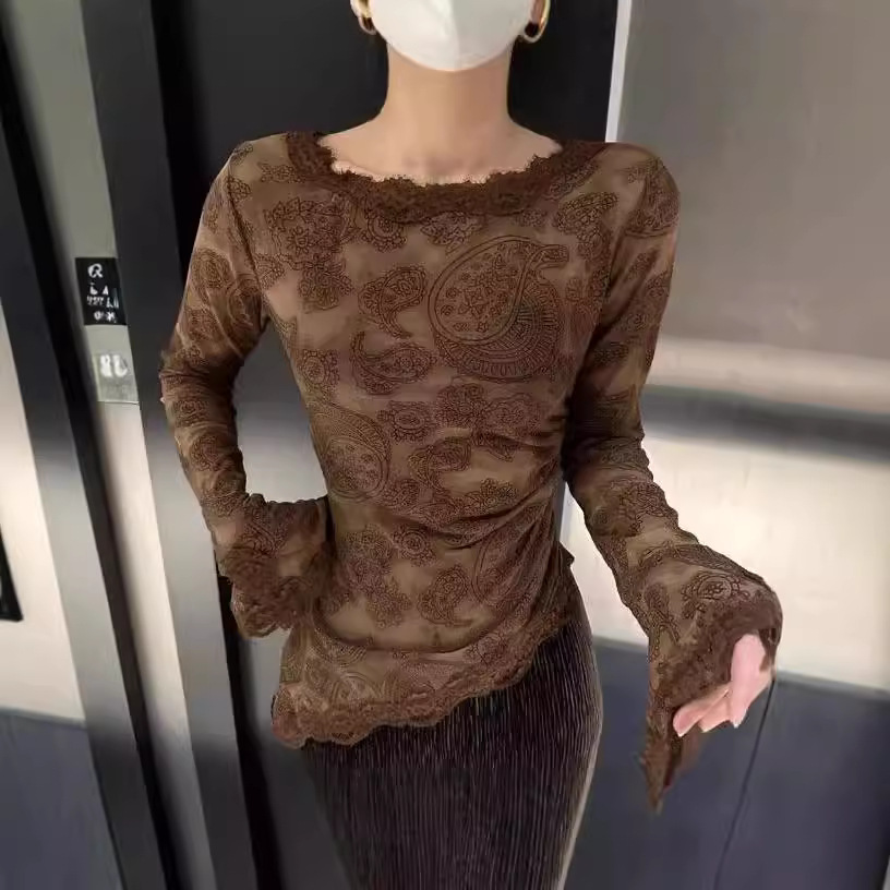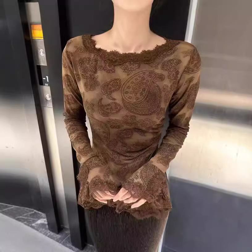 Французская мода кружевная кружевная рога с длинными рукавами топ женский весенний и осенний нерегулярный ретро цветок кешью тонкая рубашка