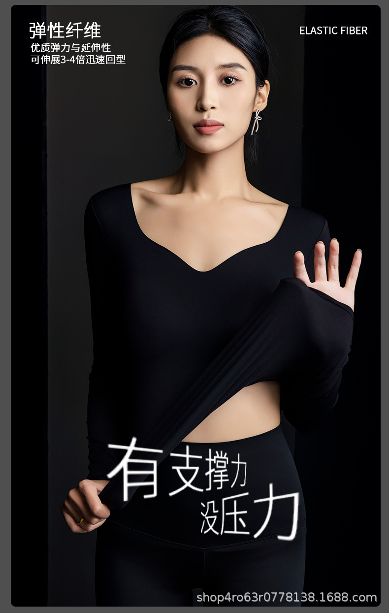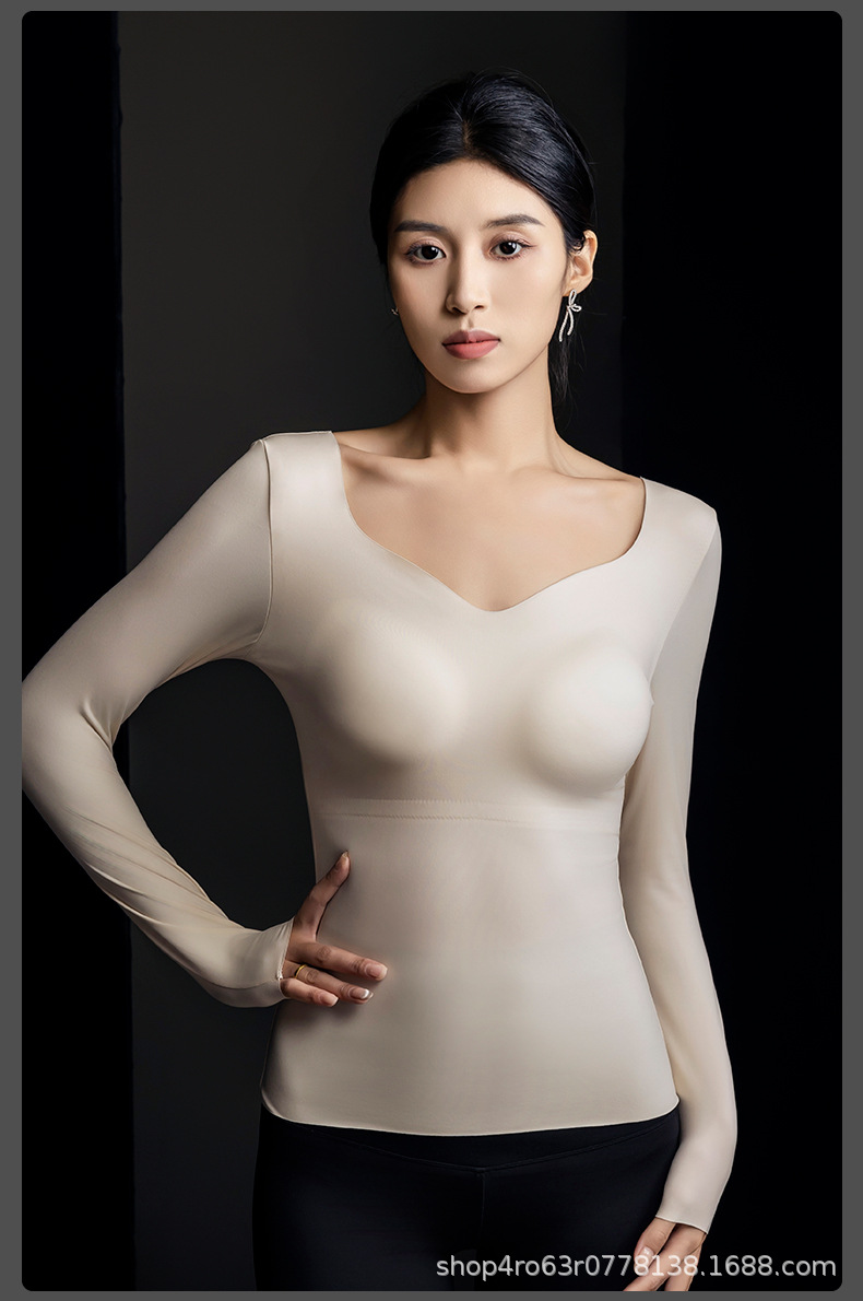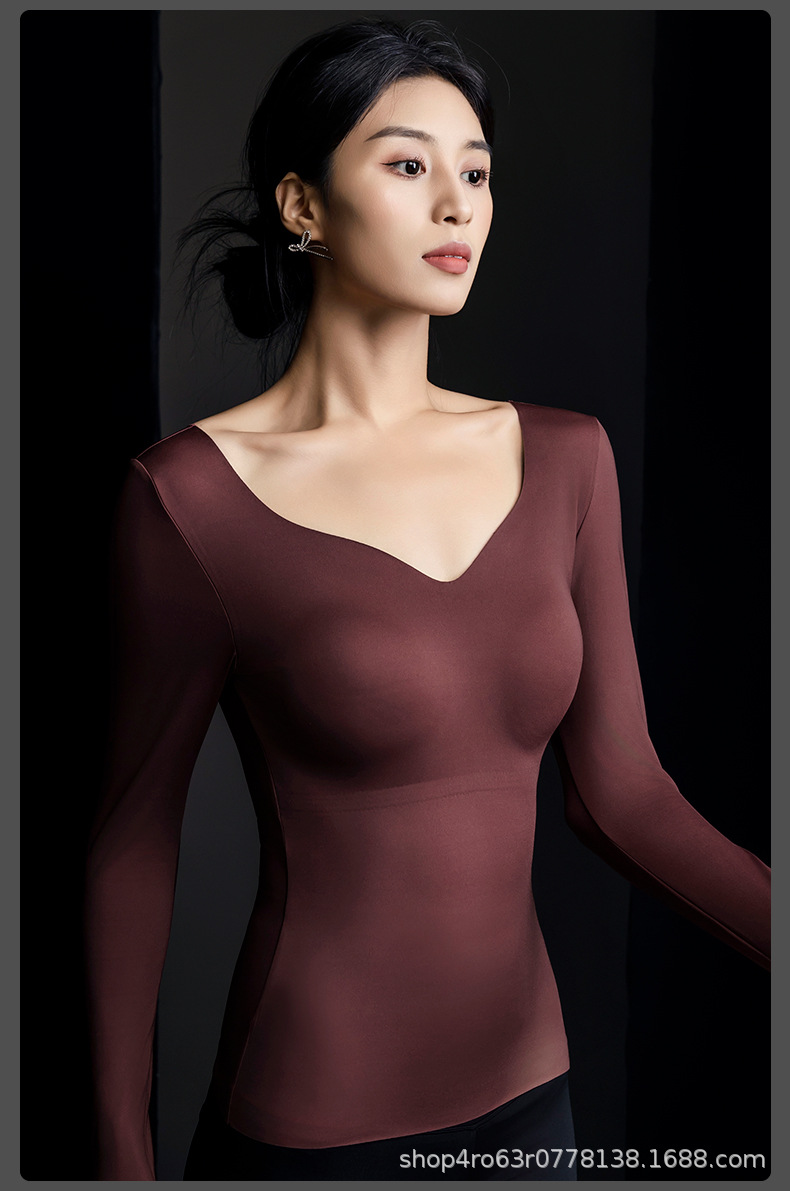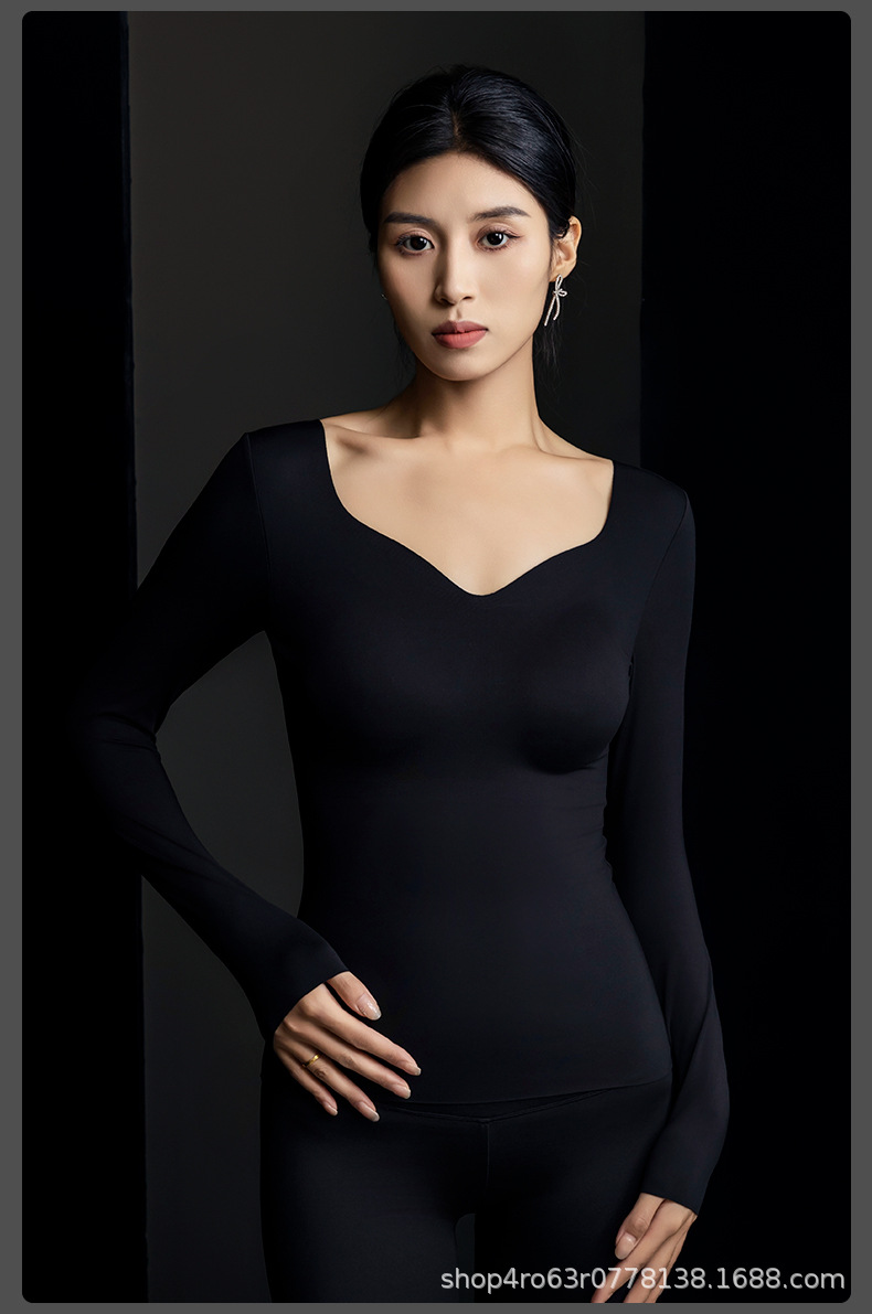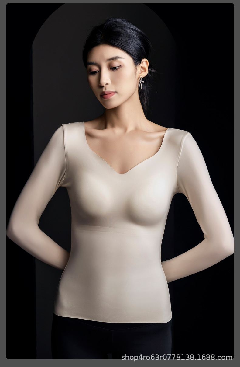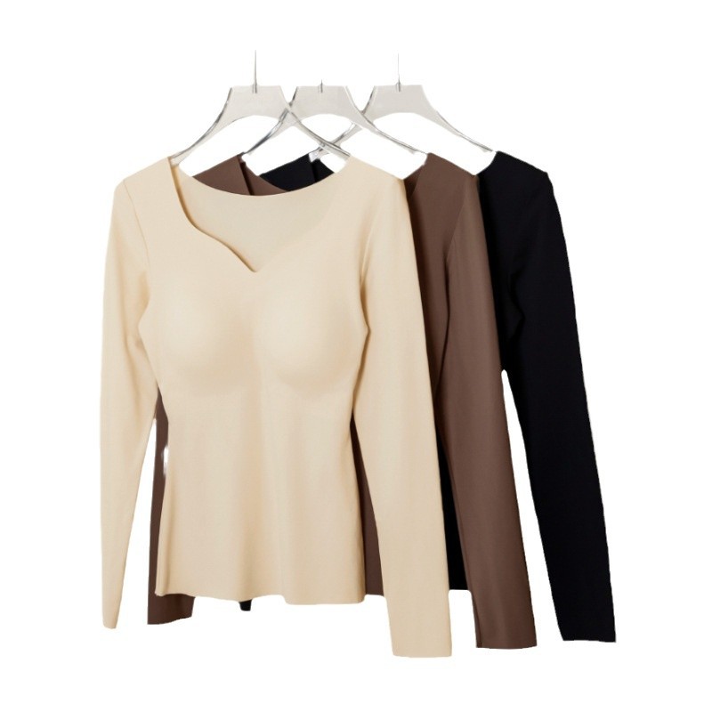 Новое осенне-зимнее термобелье для женщин, невидимое под одеждой, с длинными рукавами, низким вырезом, из начёсанной ткани, с подушечками для груди, внутренний слой для коррекции фигуры.
