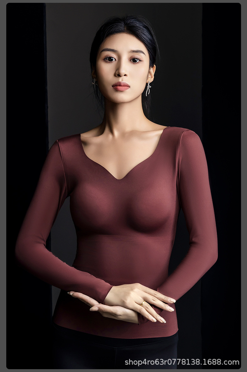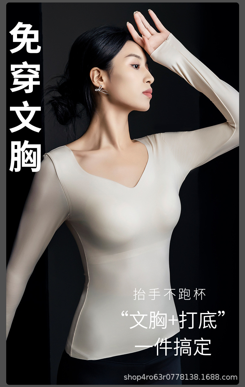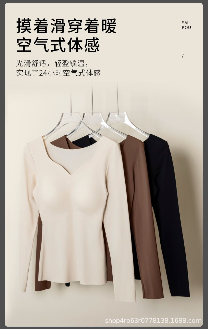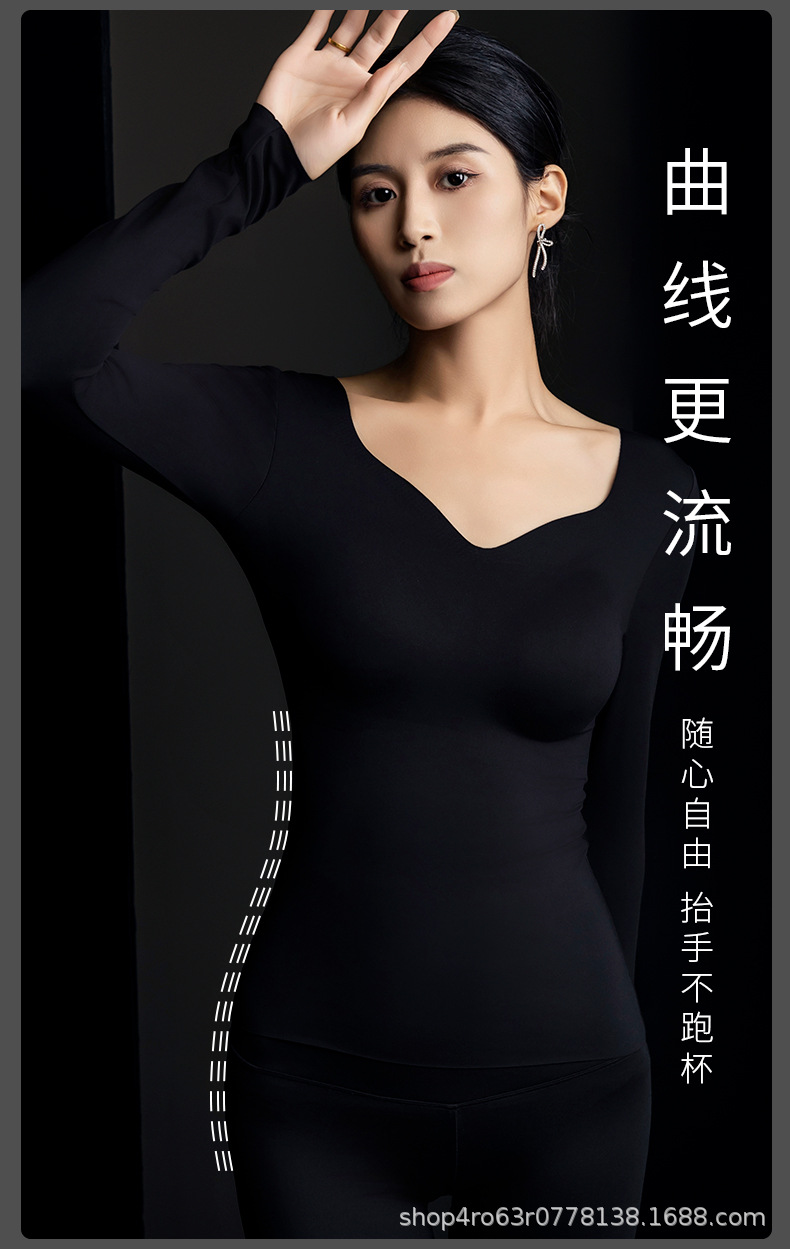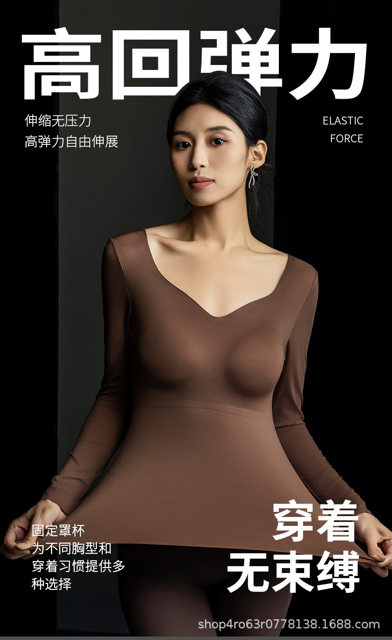Новое осенне-зимнее термобелье для женщин, невидимое под одеждой, с длинными рукавами, низким вырезом, из начёсанной ткани, с подушечками для груди, внутренний слой для коррекции фигуры.