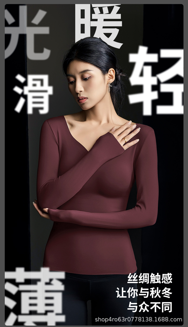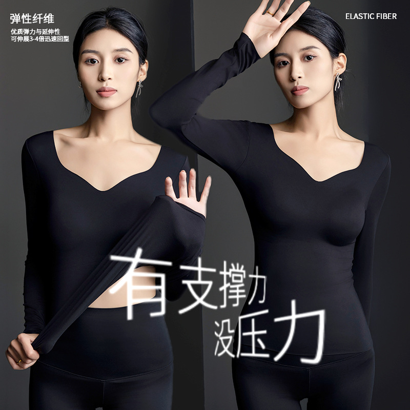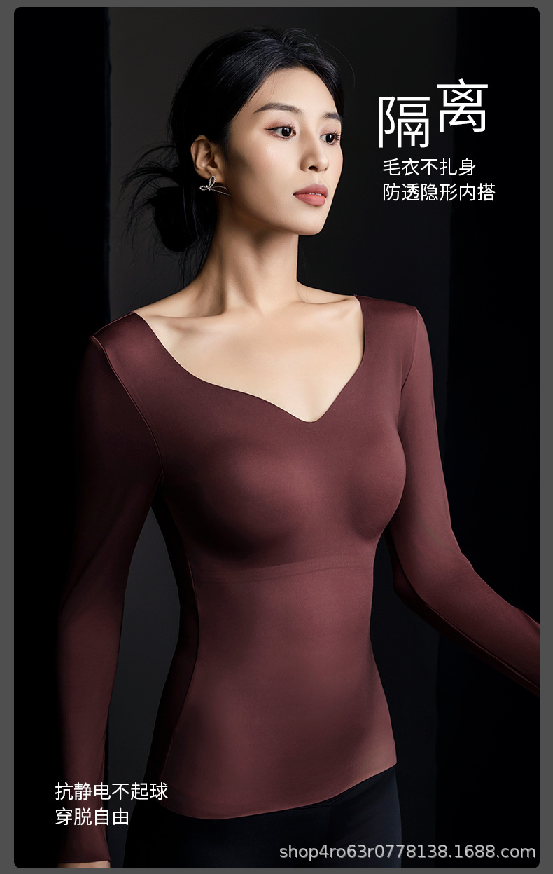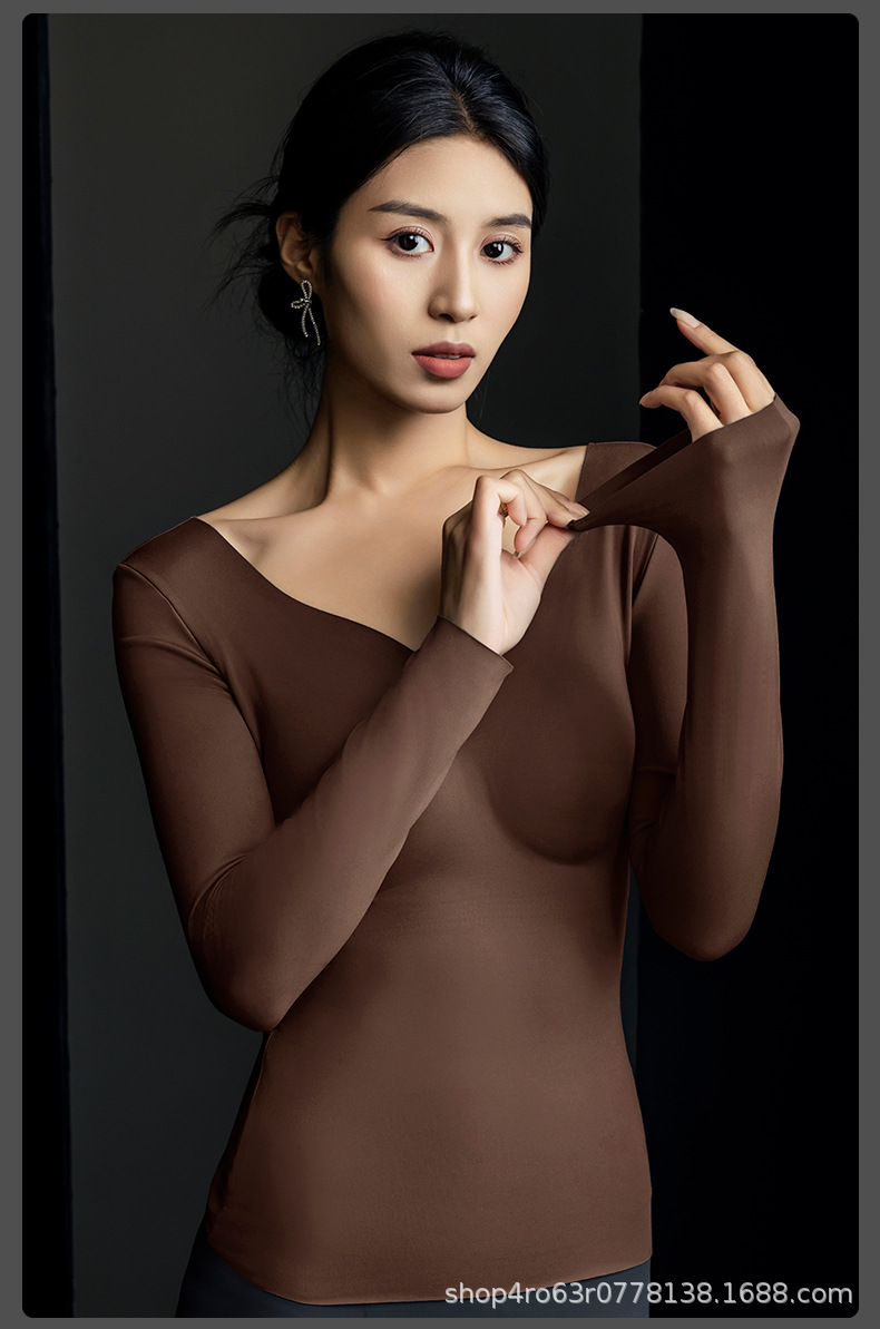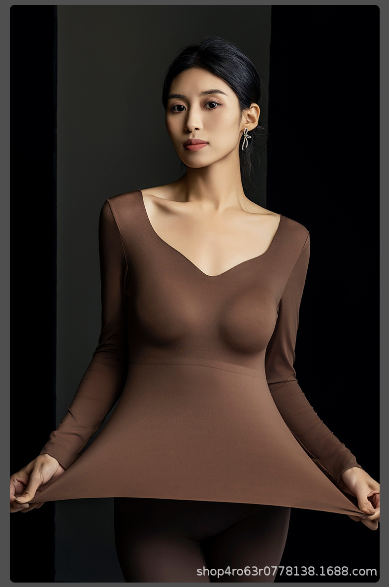 Новое осенне-зимнее термобелье для женщин, невидимое под одеждой, с длинными рукавами, низким вырезом, из начёсанной ткани, с подушечками для груди, внутренний слой для коррекции фигуры.