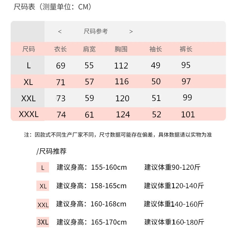 L (рекомендуется 45-60kg); XL (рекомендуется 60-70kg); XXL (рекомендуется 70-80kg); XXXL (рекомендуется 80-90kg)