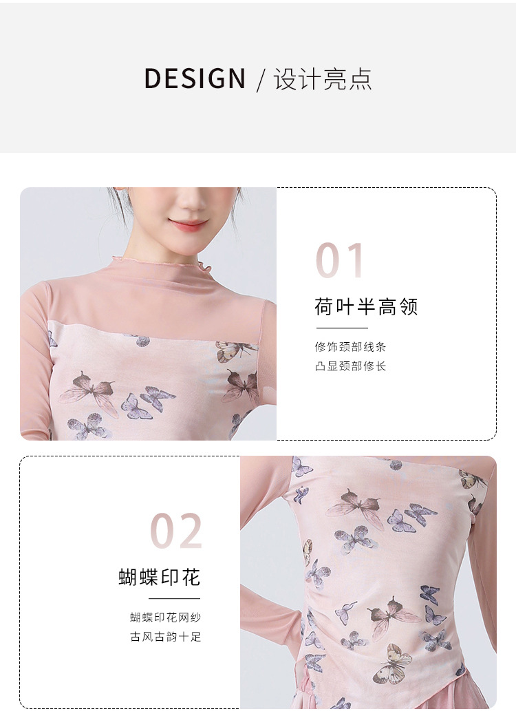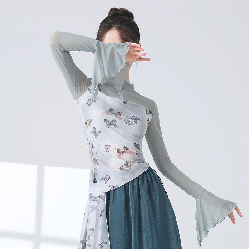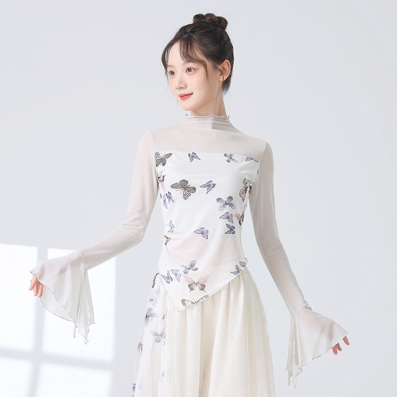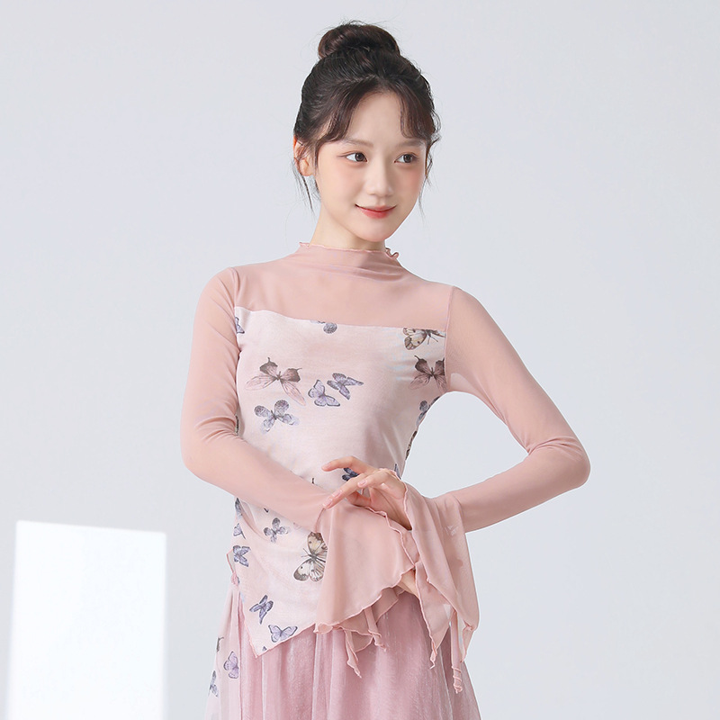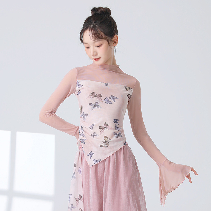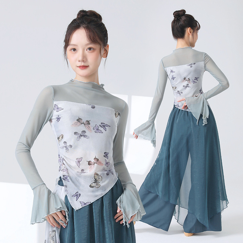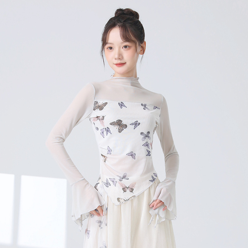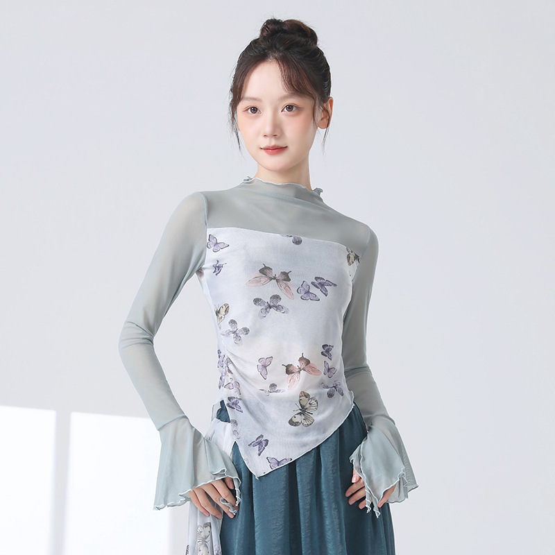 Классическая танцевальная одежда для женщин на осень, новая тонкая сетчатая тренировочная одежда с принтом, топы для ежедневных тренировок для современных танцев