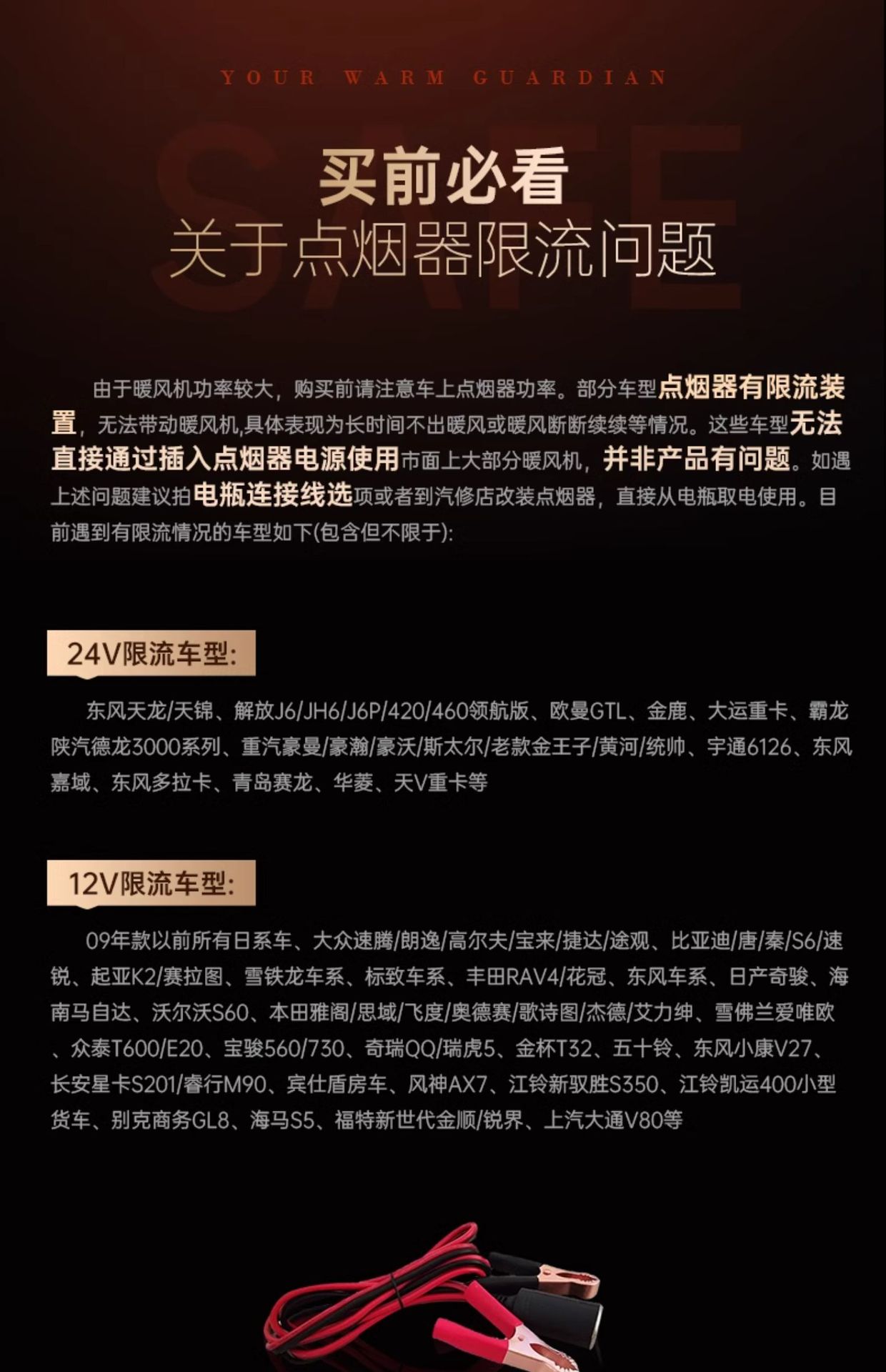 点烟器存在限流的车型 需要单独购买限流电瓶线链接